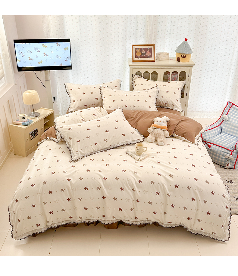 (总)莱米家纺 2026春夏新款亲肤花边全棉床盖四件套,春日小马,花团锦簇,花园小狗,苹果小熊,温柔蜜语-粉,温柔蜜语-蓝,小彩虹,紫韵