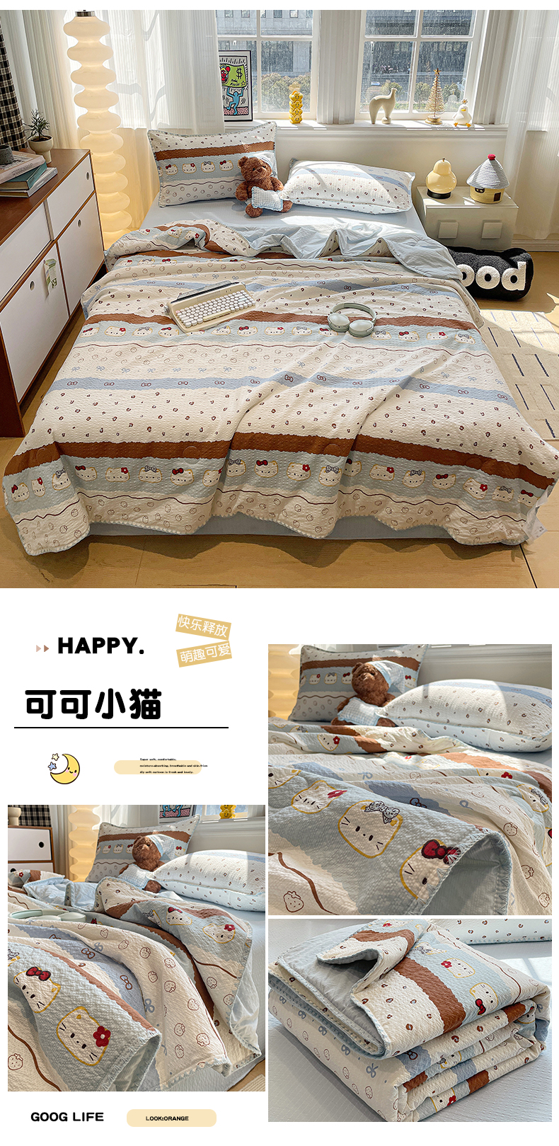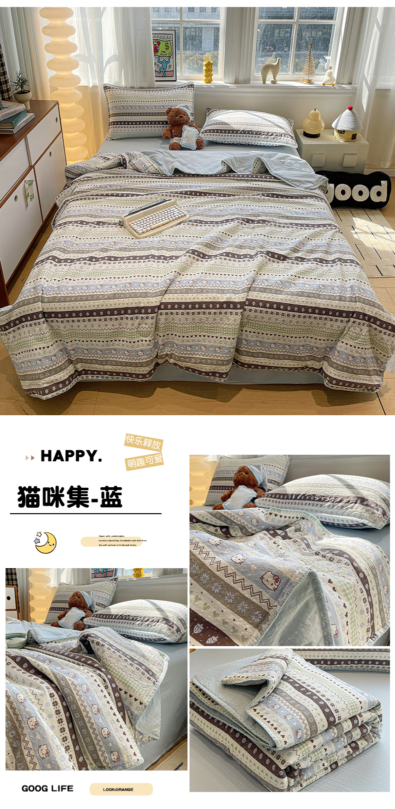 (总)奈颜 2026新款A类泡芙纱印花四件套学生宿舍三件套-卡通印花系列,豹纹蜡笔,躲猫猫,高帽星星,黑皮小猫,红格猫咪,苹果小狗,甜品萌狗,条纹星星,玩酷KT,线条KT