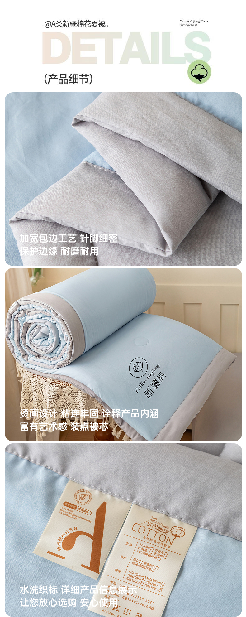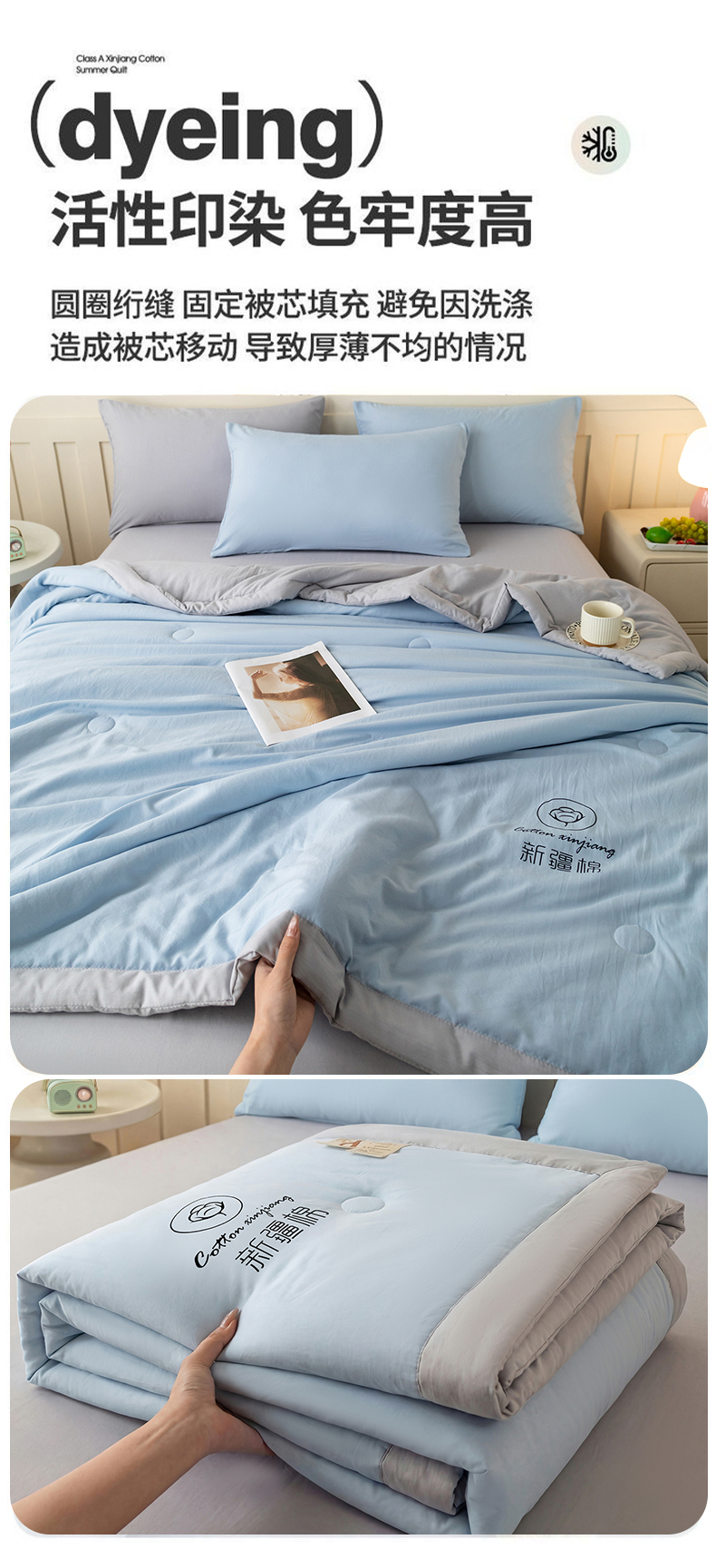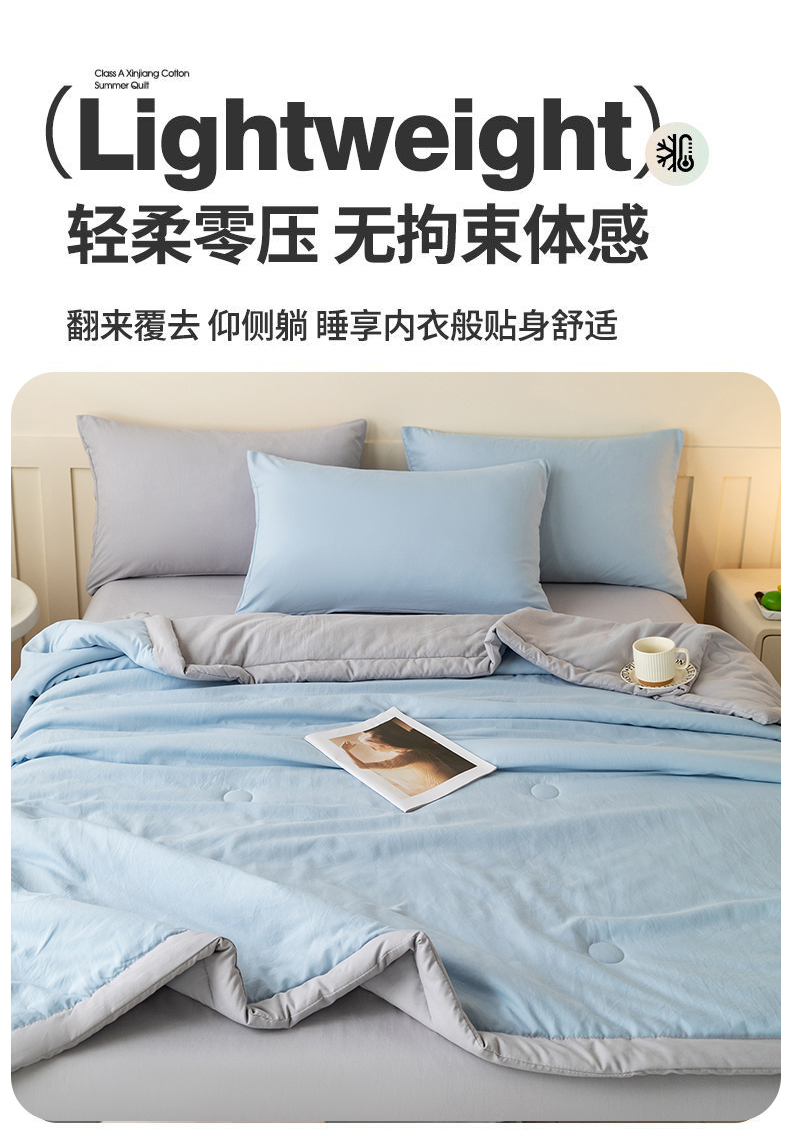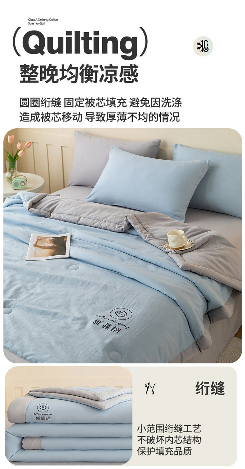 商品名称:安琪家纺 2026春夏新款A类新疆棉花纯色撞色双拼夏被夏凉被空调被 双拼-蓝灰