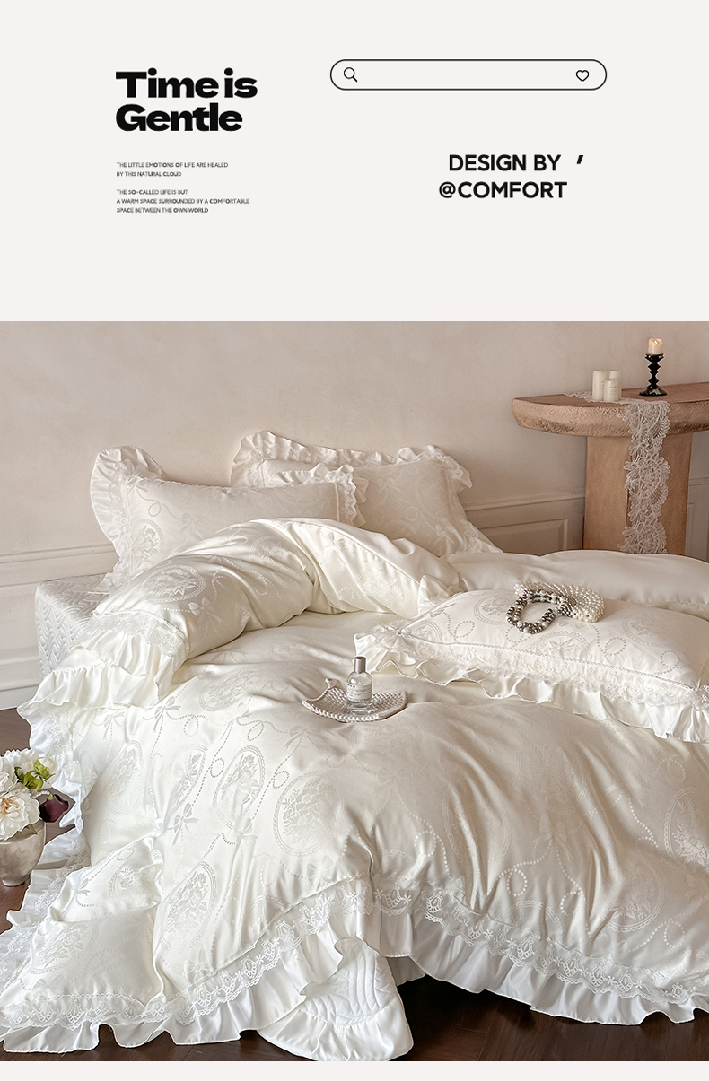 首尔家纺 2026新款花边蕾丝提花水洗真丝天丝床盖款四件套 秘境-米白