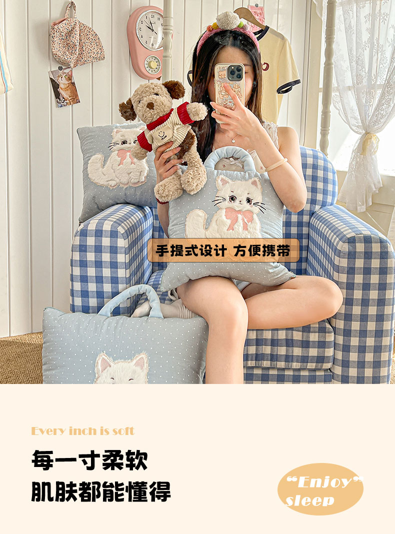 商品名称:番茄+ 2026新款ins风猫咪抱枕被 奶芙猫-波点蓝