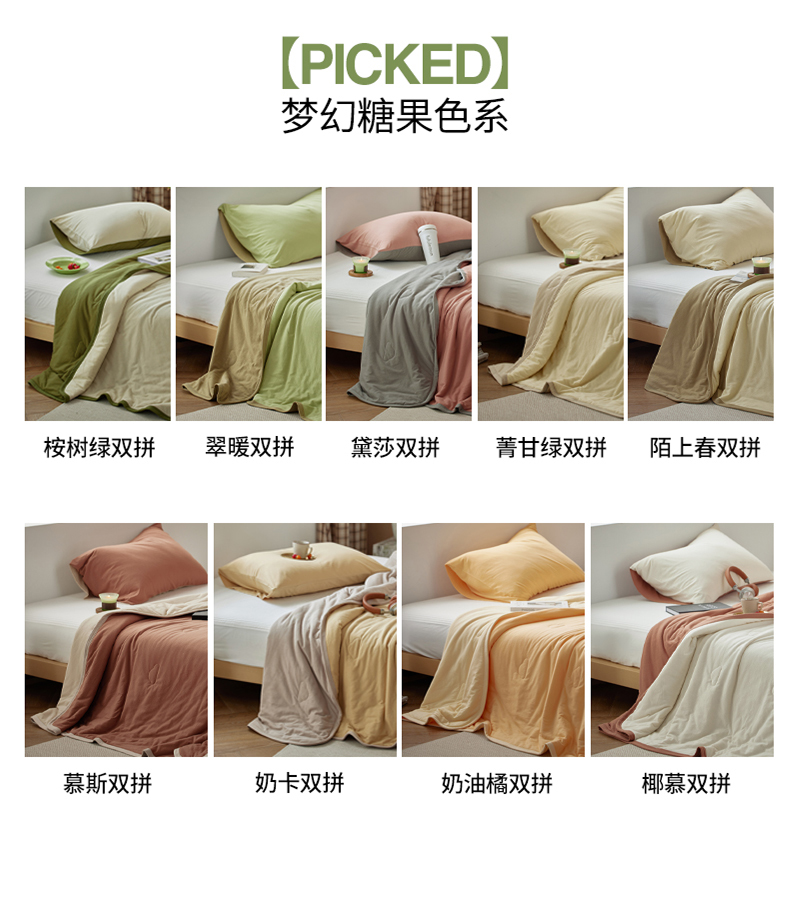 • 91家纺网 家纺一手货源 找家纺 (总)风向标家纺 2026新款全棉云感针织棉双拼夏被夏凉被空调被,白茶双拼(爆款色),清欢白双拼,桉树绿双拼,翠暖双拼,黛莎双拼,菁甘绿双拼,陌上春双拼,慕斯双拼,奶豆绿双拼,奶卡双拼,奶油橘双拼,椰慕双拼,婴儿蓝双拼,芋紫粉双拼,组合图仅供展示-不可下单
