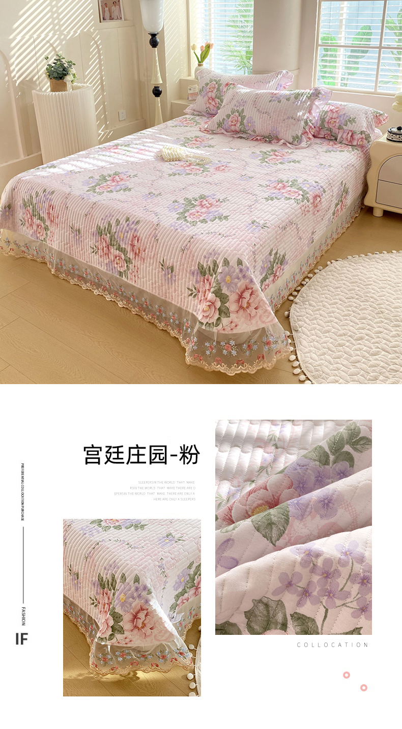 • 91家纺网 家纺一手货源 找家纺 欧妮家纺 2026新款全棉面料蕾丝花边夹棉绗缝床盖 全棉蕾丝款床盖-诺曼底庄园蓝
