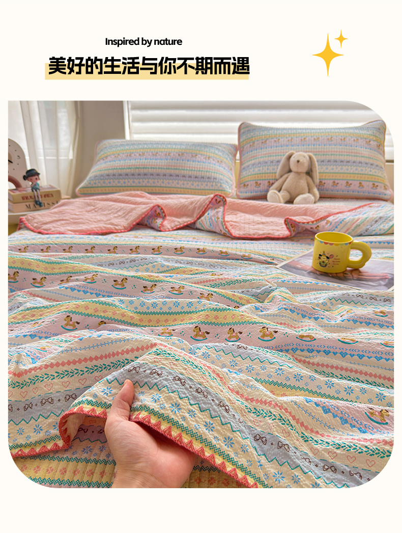 • 91家纺网 家纺一手货源 找家纺 梵朴 2026新款A类泡芙双层纱贝壳边床盖夏被四件套三角针夏凉被空调被 费尔岛木马 91家纺网 家纺一手货源 找家纺 梵朴 2026新款A类泡芙双层纱贝壳边床盖夏被四件套三角针夏凉被空调被 费尔岛木马