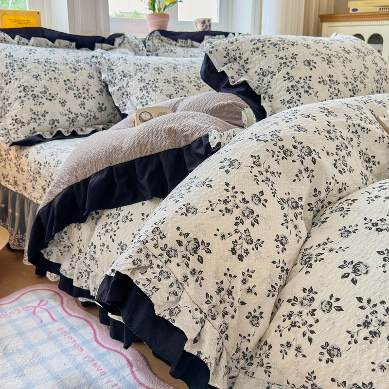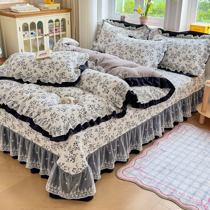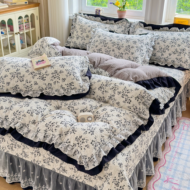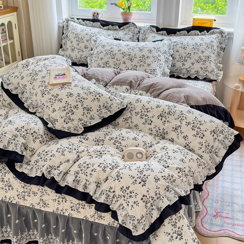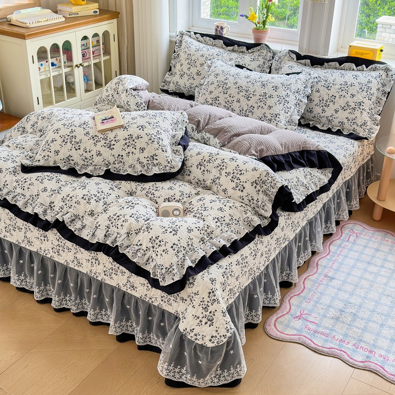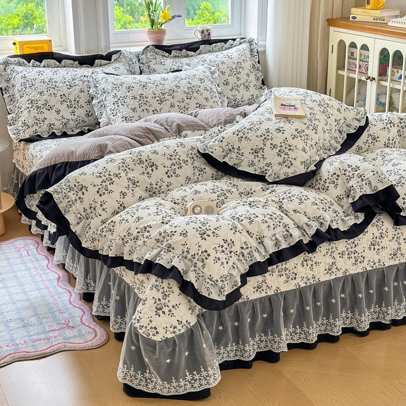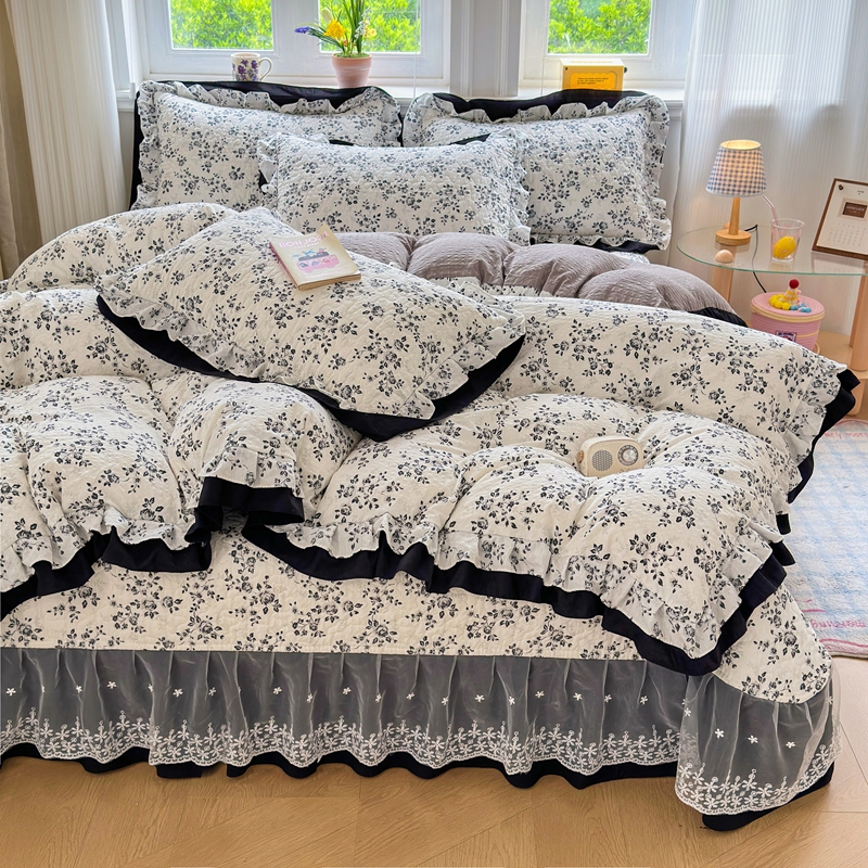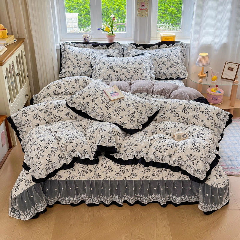 当前位置: 91家纺网 > 商品网购 > 床品套件 > 四件套 > 双层纱四件套 > 雅眠居 2026直播爆款泡芙双层纱蕾丝花边被套款床盖款四件套 墨染