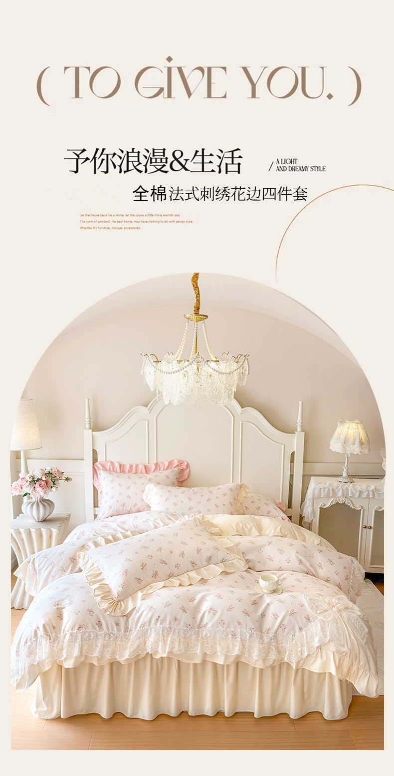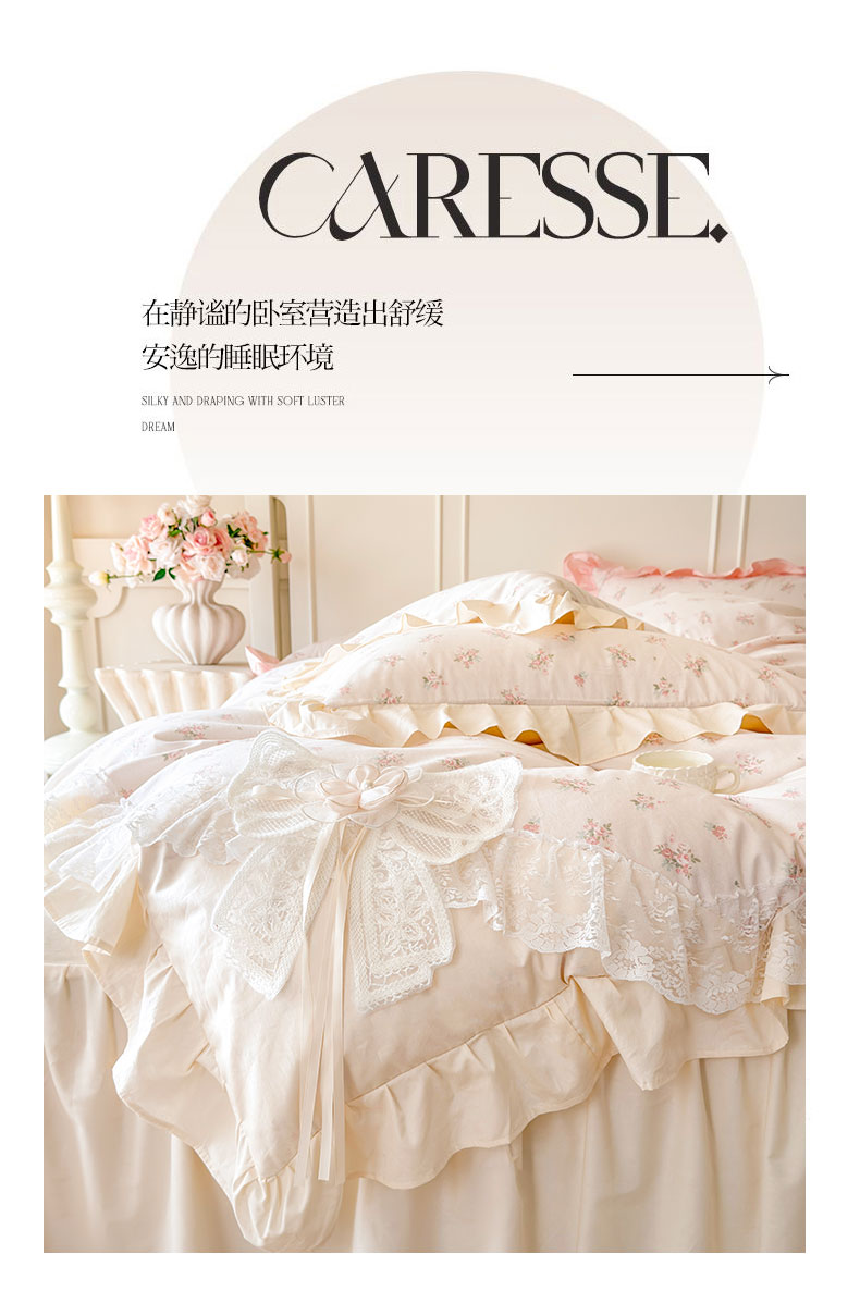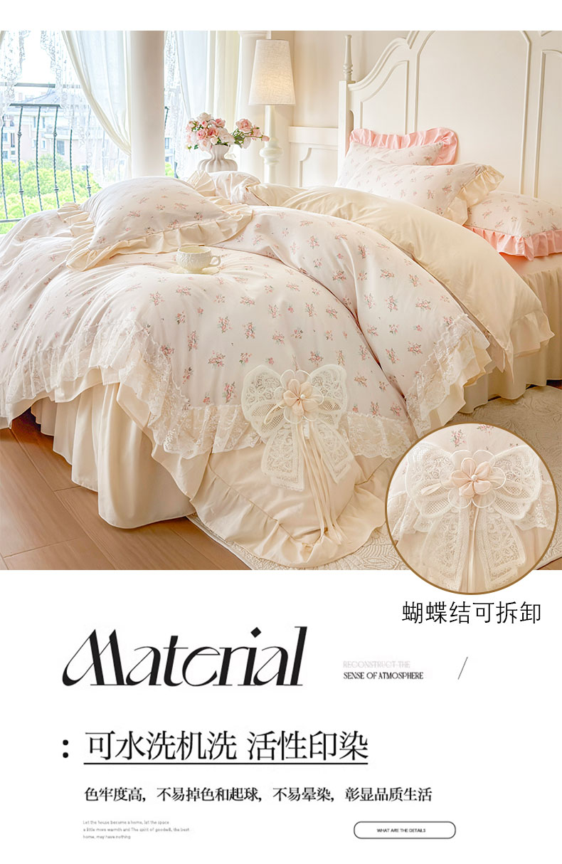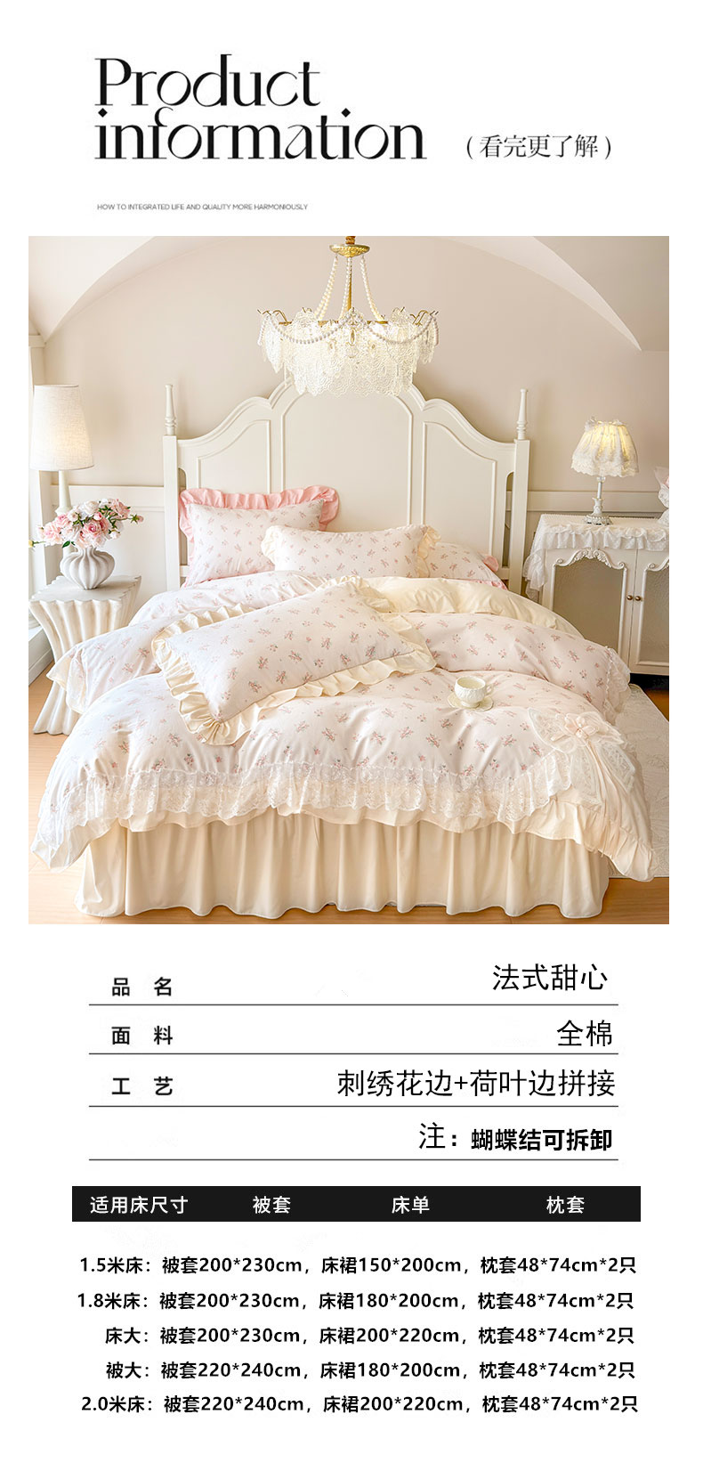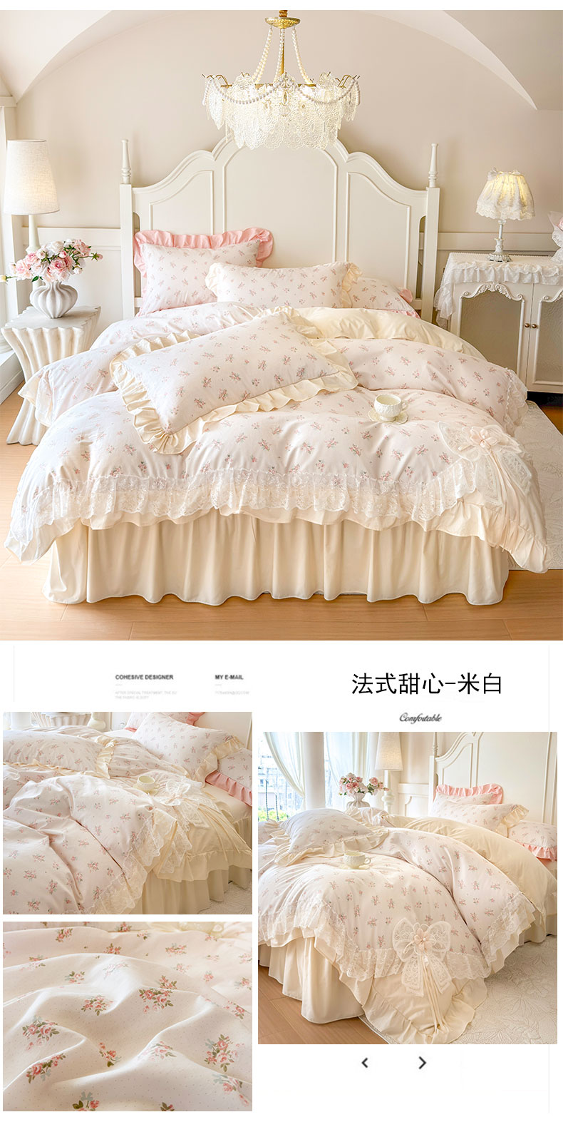当前位置: 91家纺网 > 商品网购 > 床品套件 > 四件套 > 全棉普通四件套 > 花香四季家纺 2026新款法式全棉纯棉印花床裙款四件套-法式甜心 法式甜心-米白