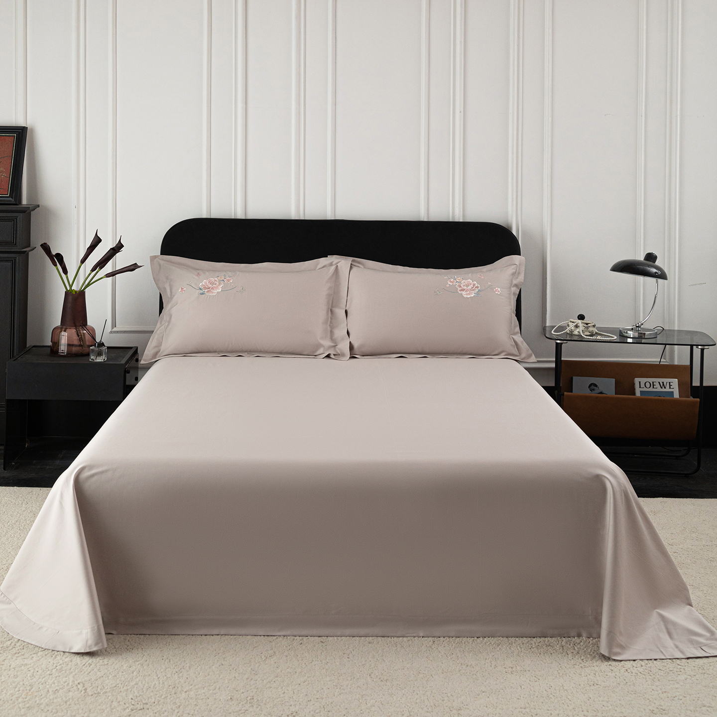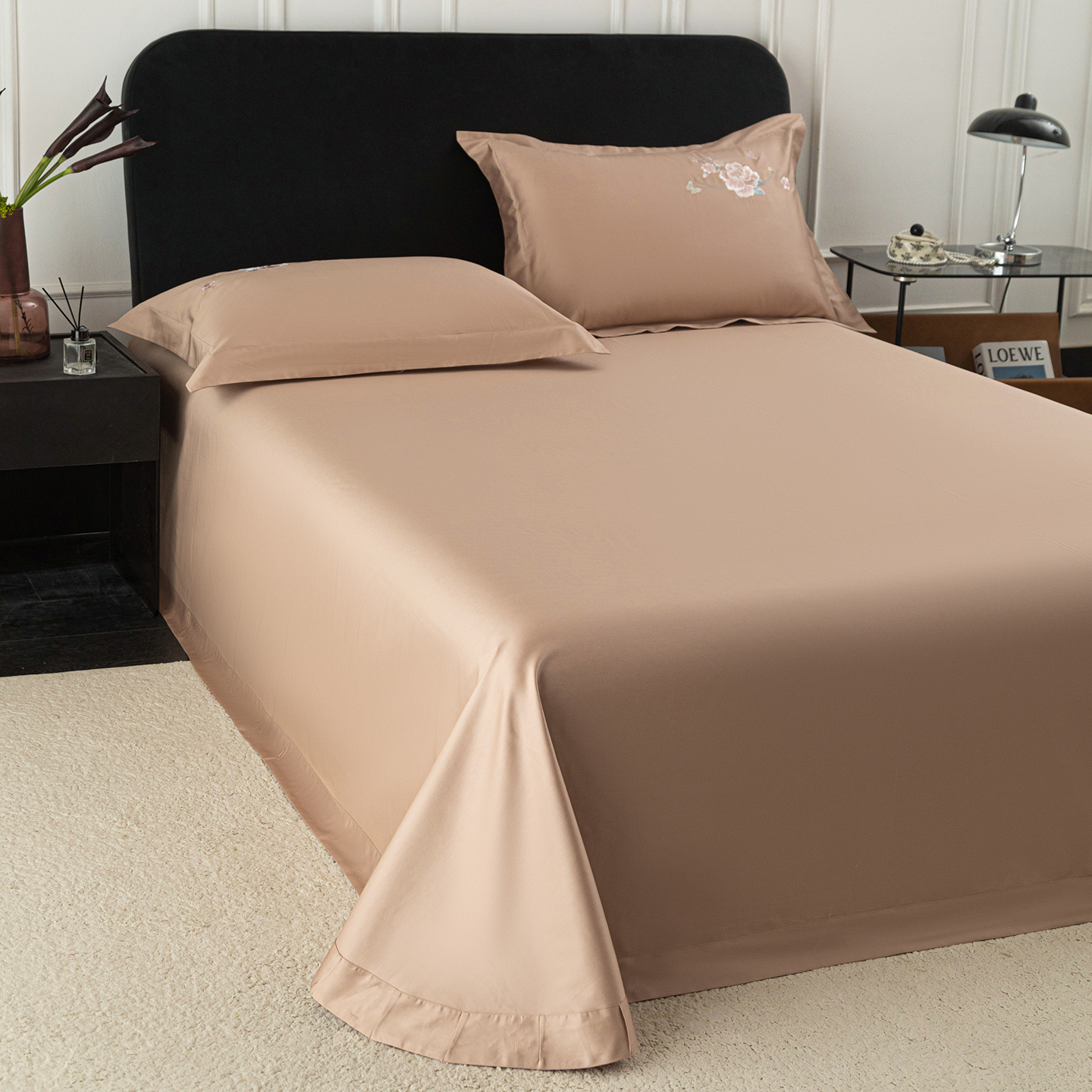 • 91家纺网 家纺一手货源 找家纺 莉迪娅 2026新款50s双股长绒棉纯色简约绣花床单三件套--花开牡丹系列 卡其牡丹
