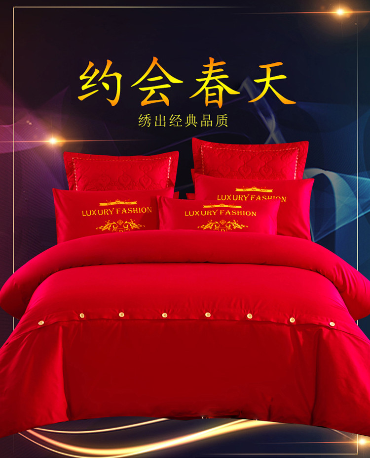 慕她家纺 简约婚庆四件套大红色刺绣全棉纯棉六多件套约会春天