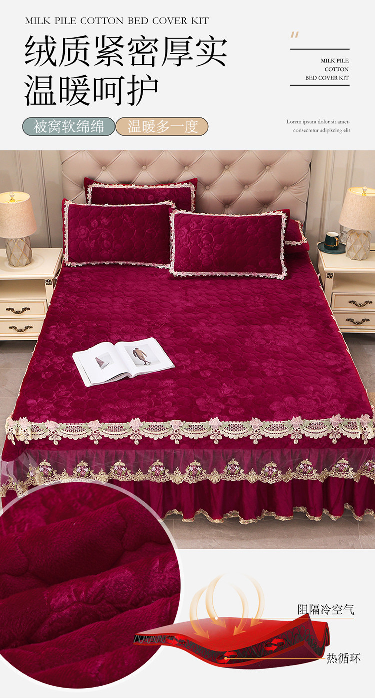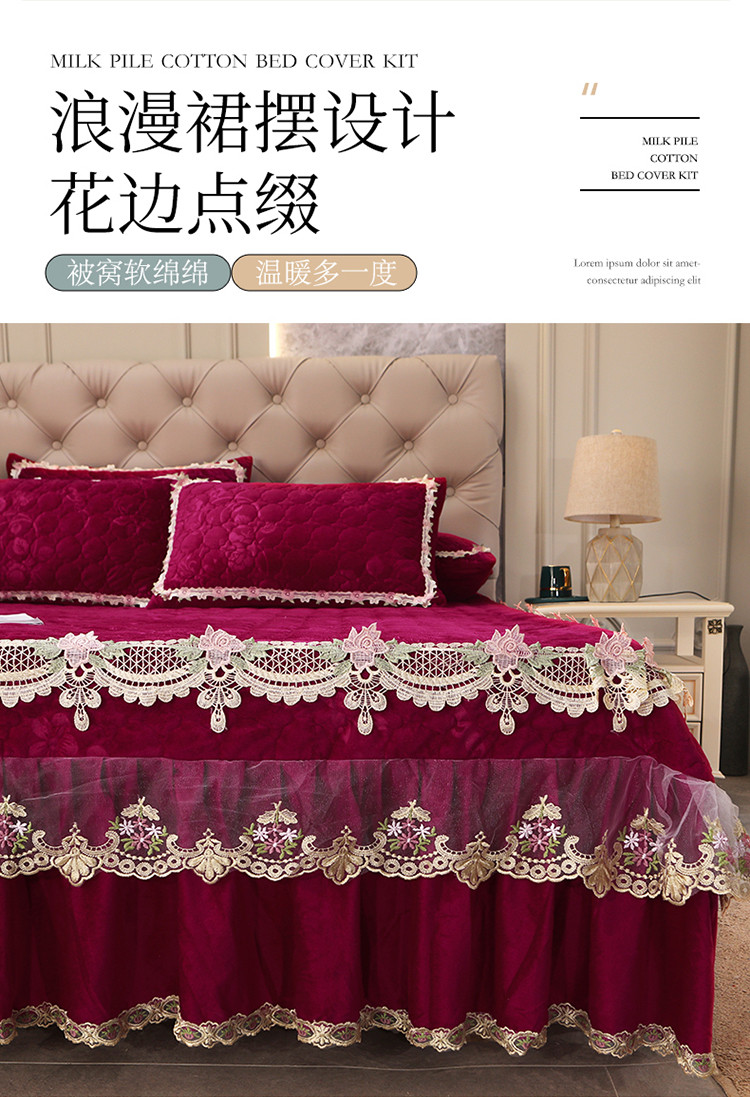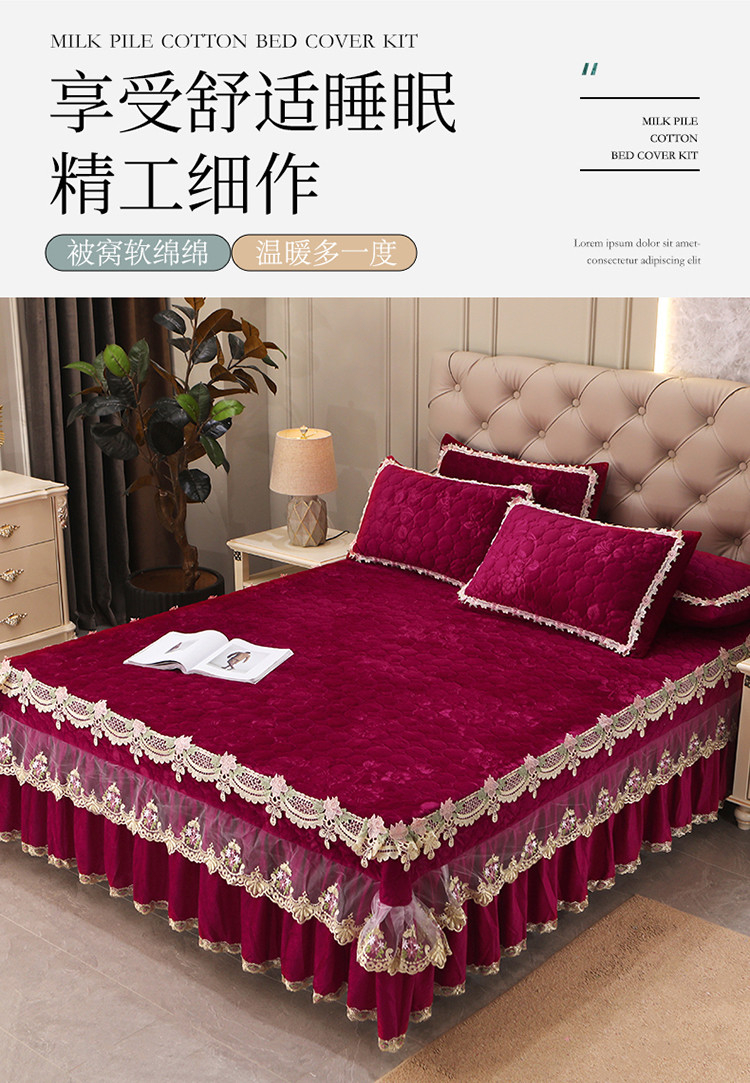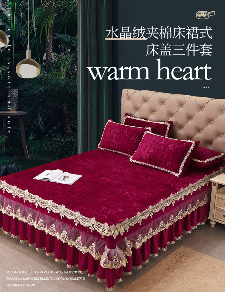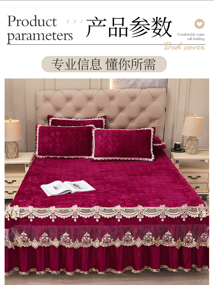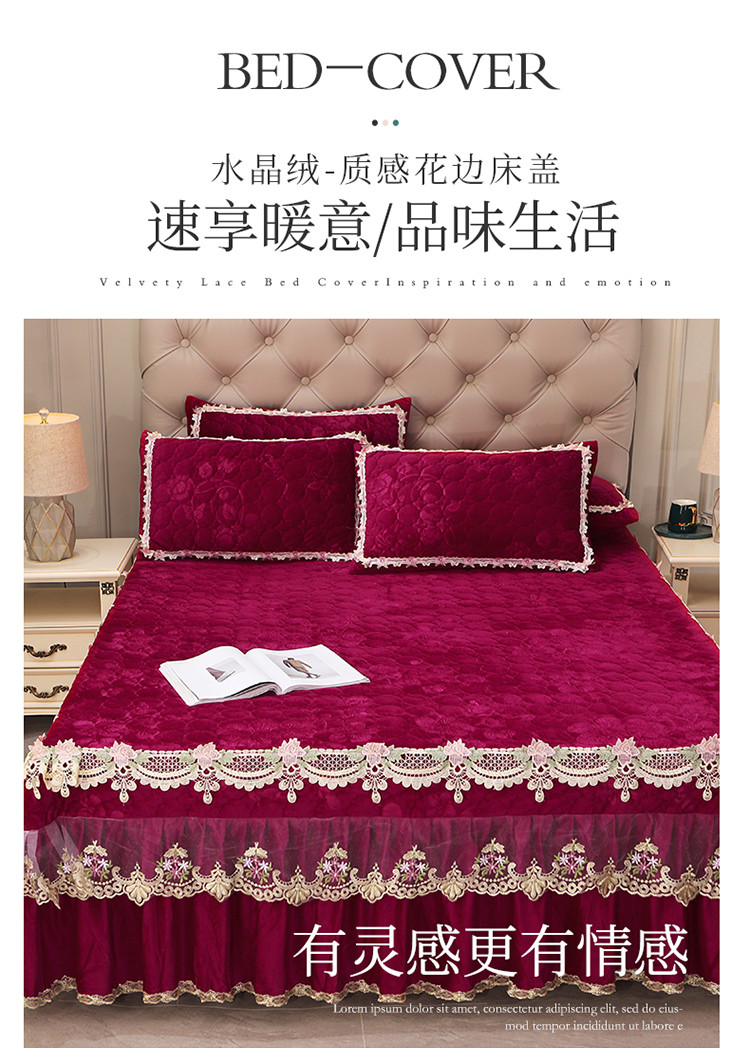 商品名称:宜凡家纺 2021新款水晶绒床裙式床盖三件套 冬日恋歌-酒红
