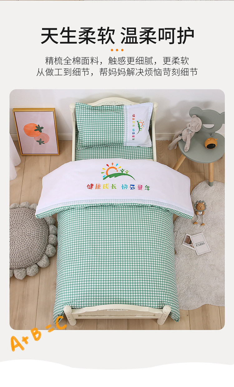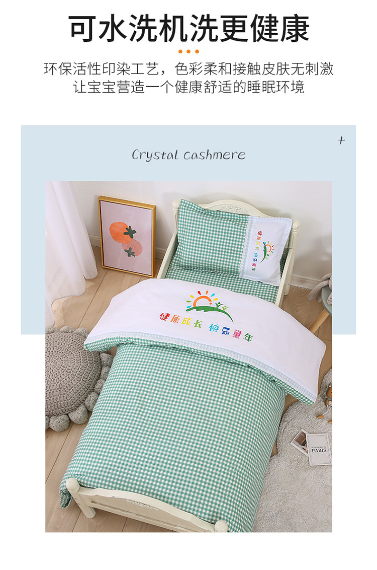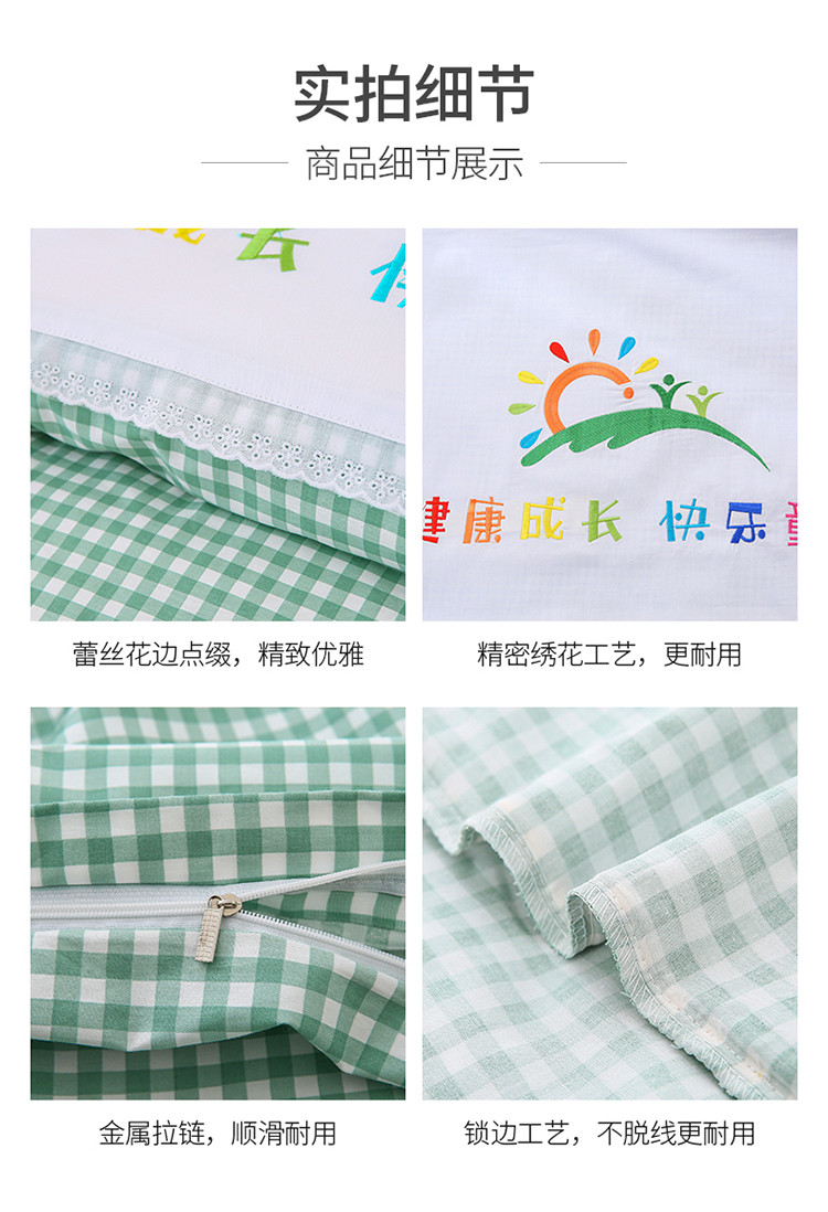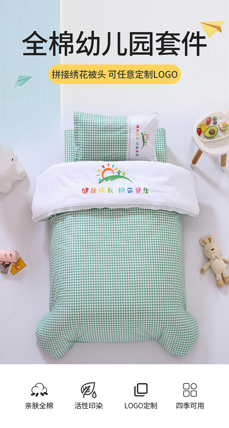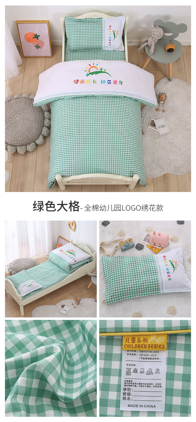 当前位置: 91家纺网 > 商品网购 > 床品套件 > 多件套 > 多件套 > 订做纯色绣花logo纯棉刺绣园标幼儿园被子三件套午睡六件套 绿色大格