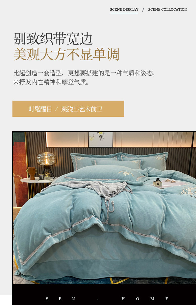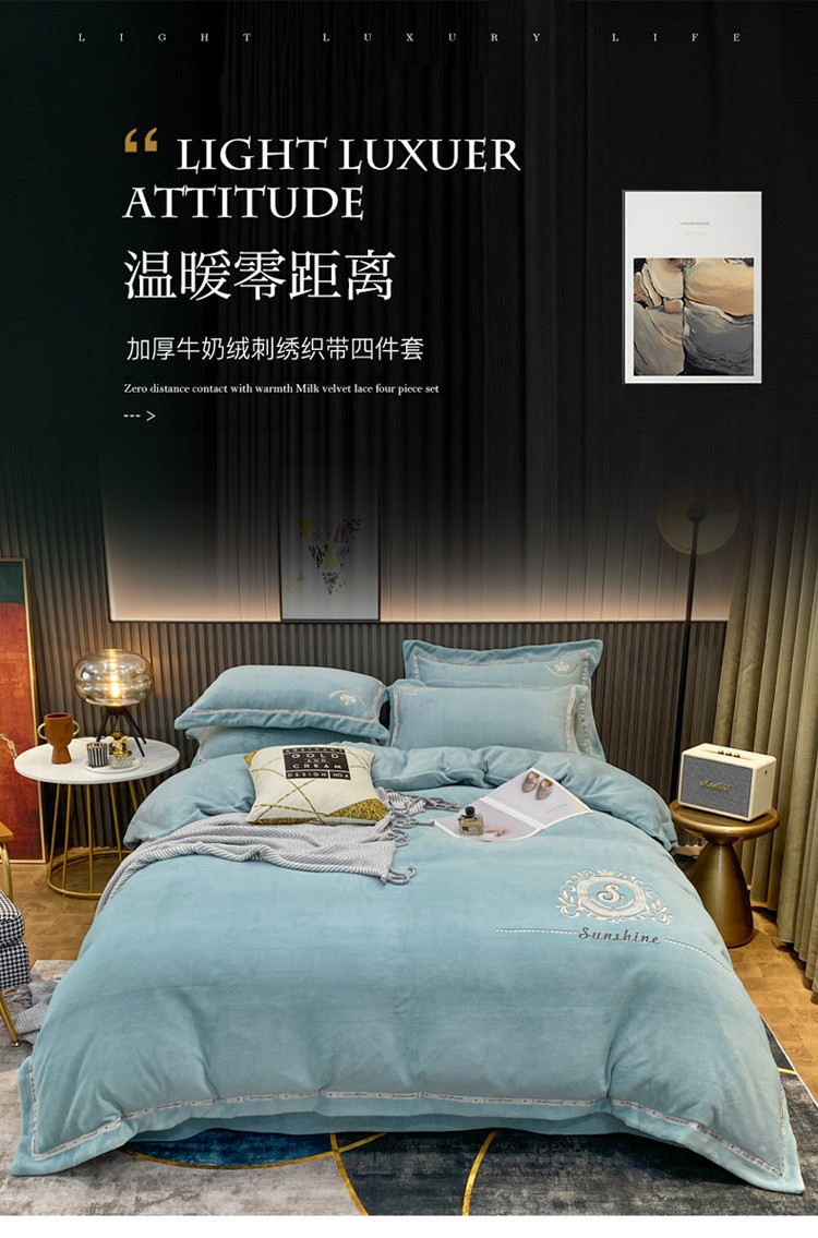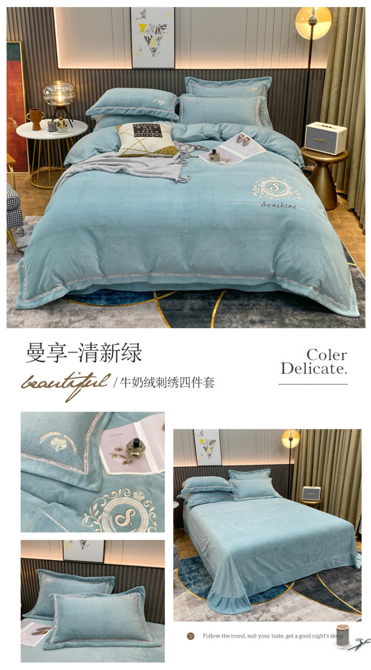 星尚新款A类牛奶绒加厚保暖轻氧绒法莱绒水晶绣花四件套 曼享-清新绿