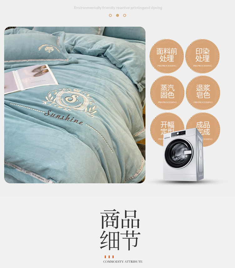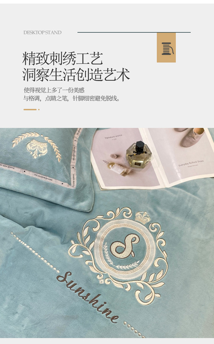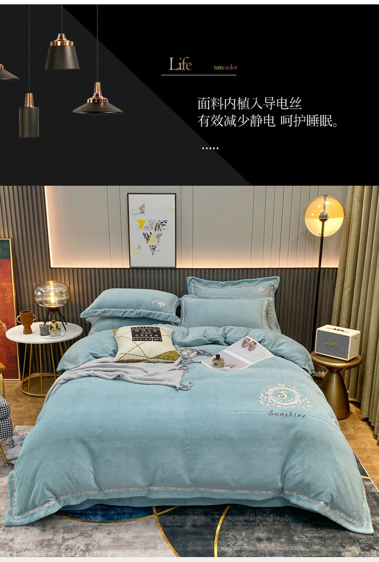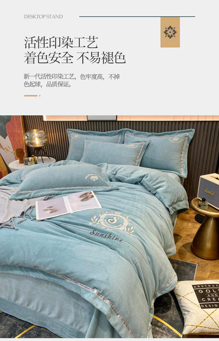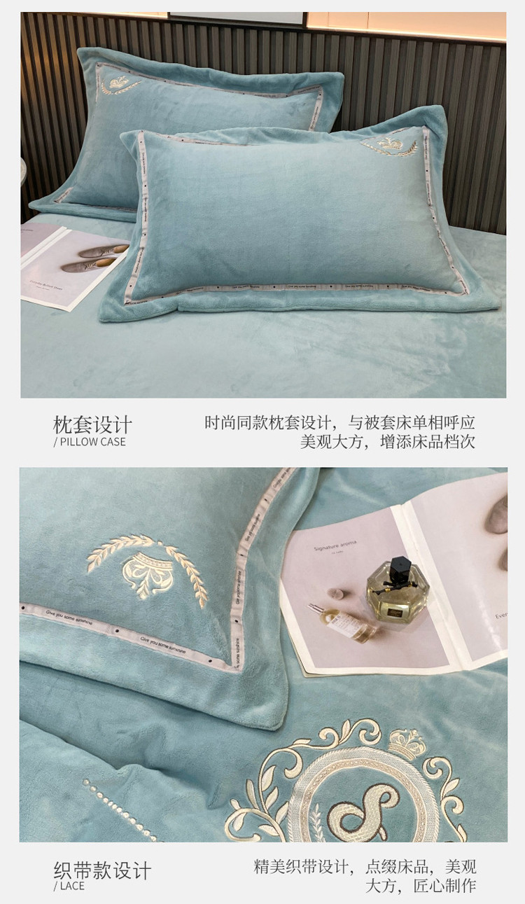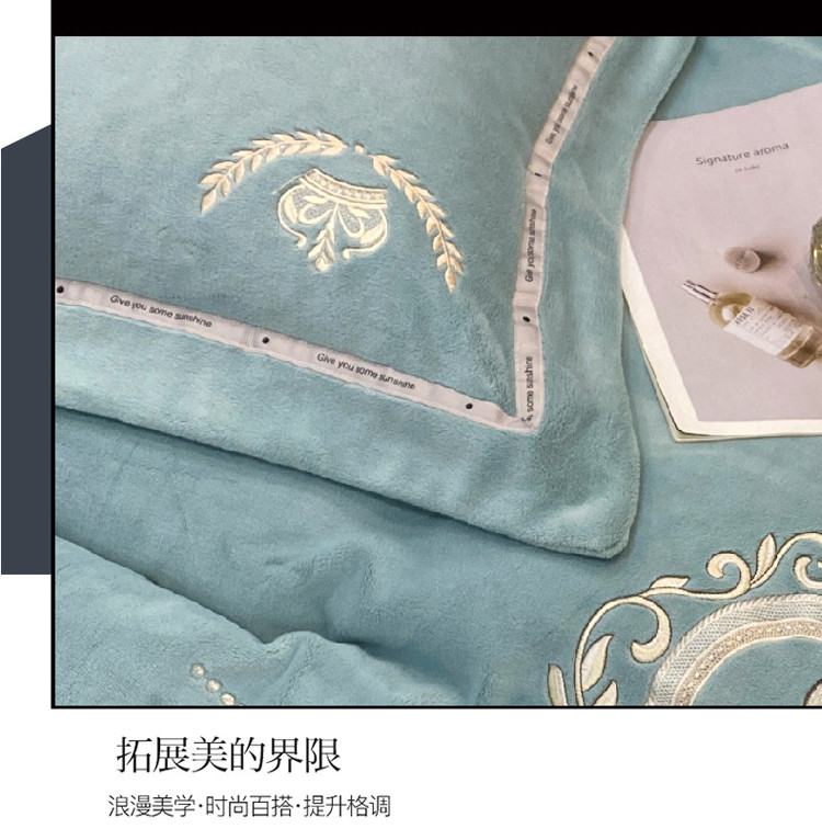 商品名称:星尚新款A类牛奶绒加厚保暖轻氧绒法莱绒水晶绣花四件套 曼享-清新绿