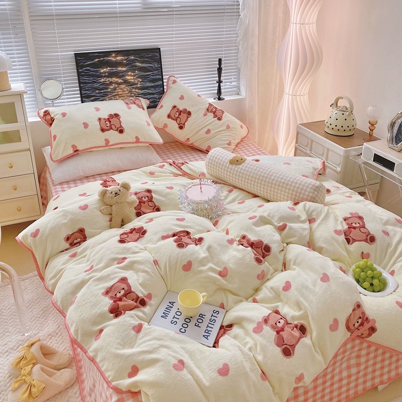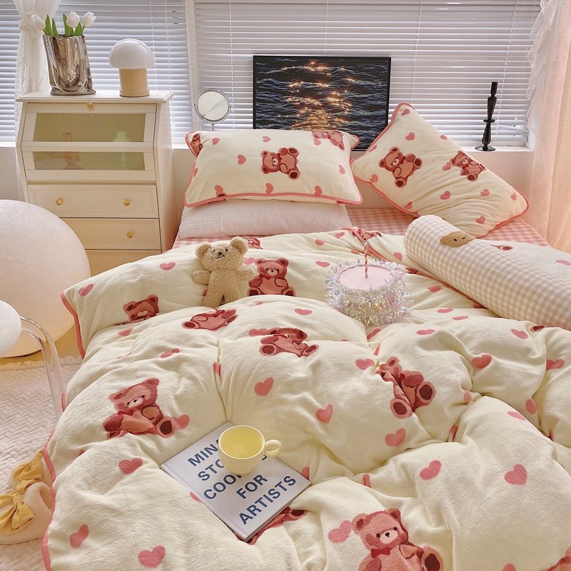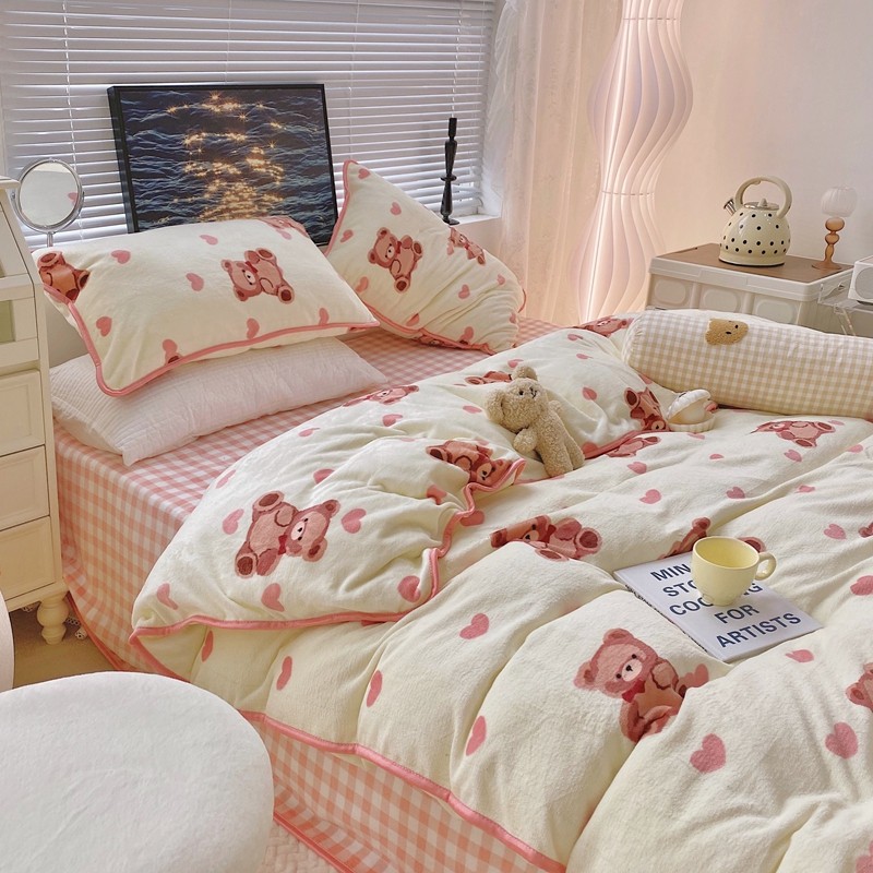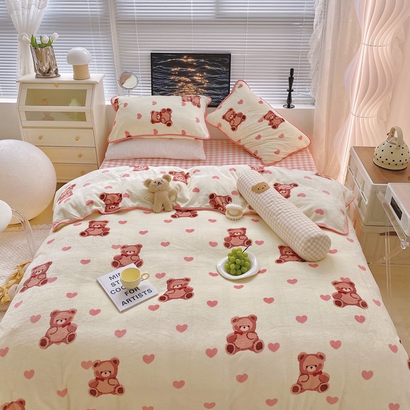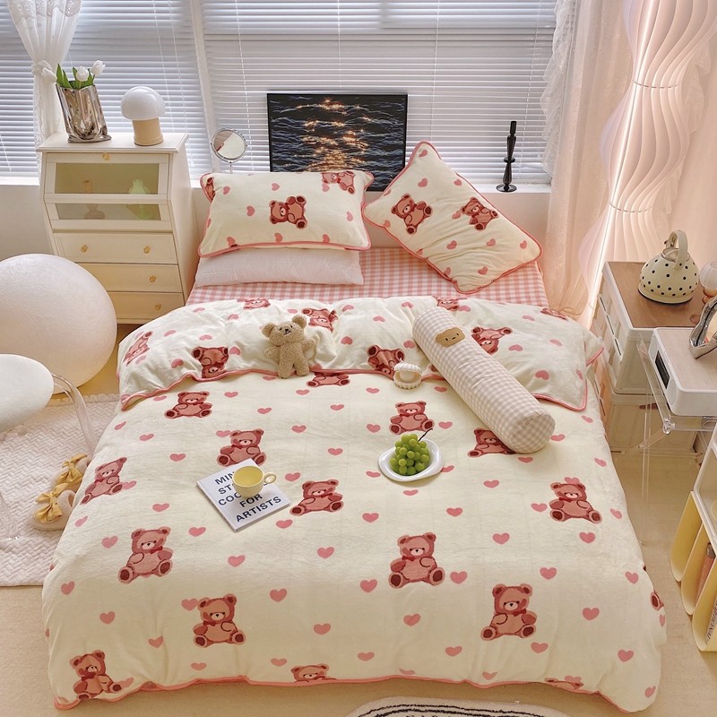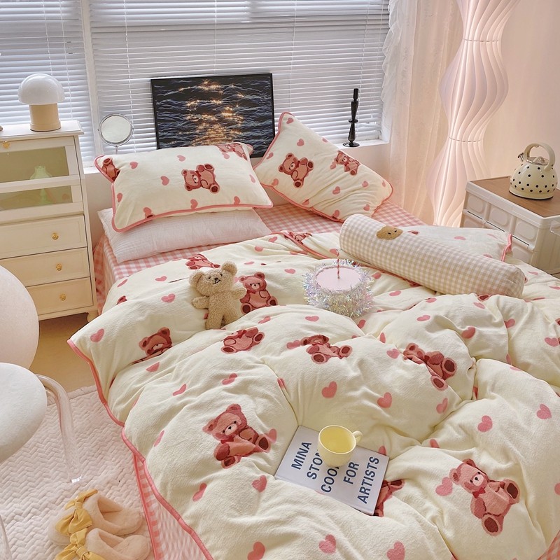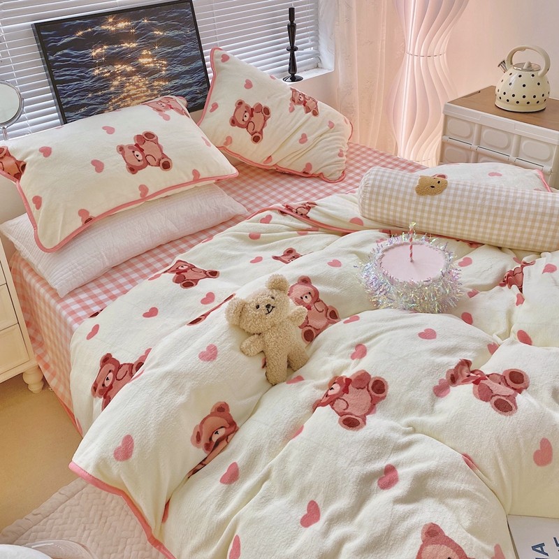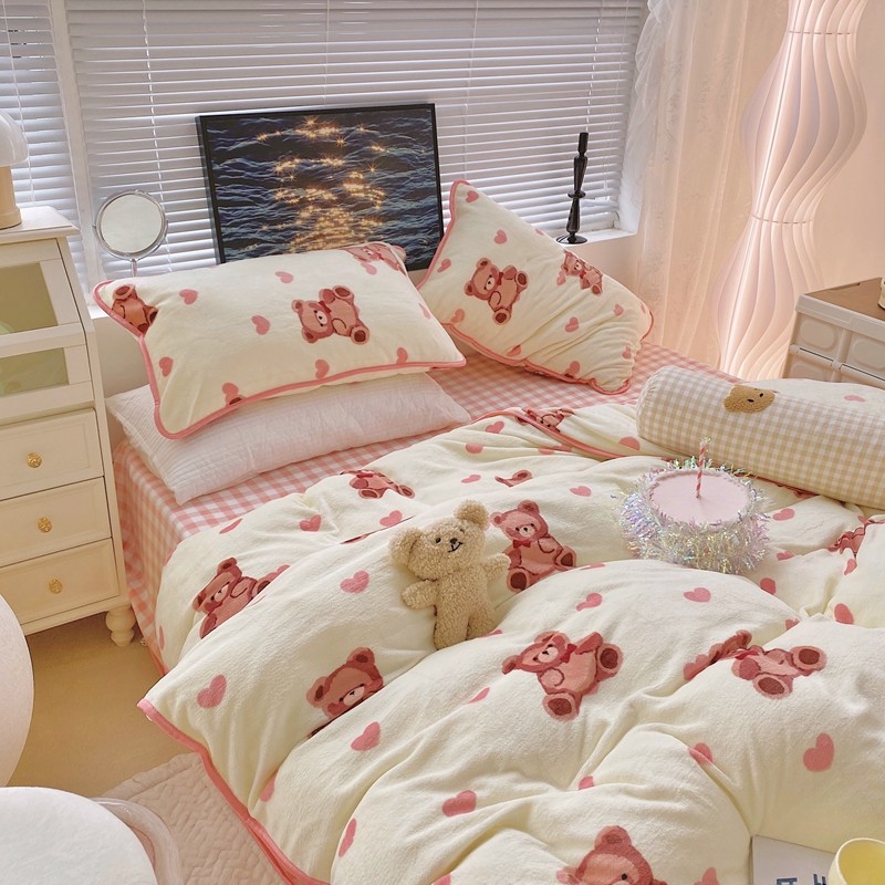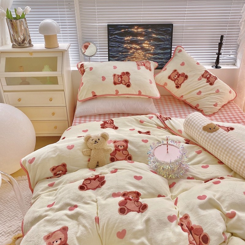 顾里家纺2021新款ins韩国高端保暖牛奶绒四件套爱心熊仔