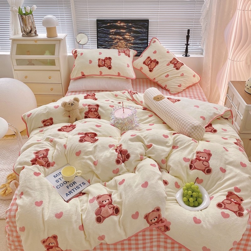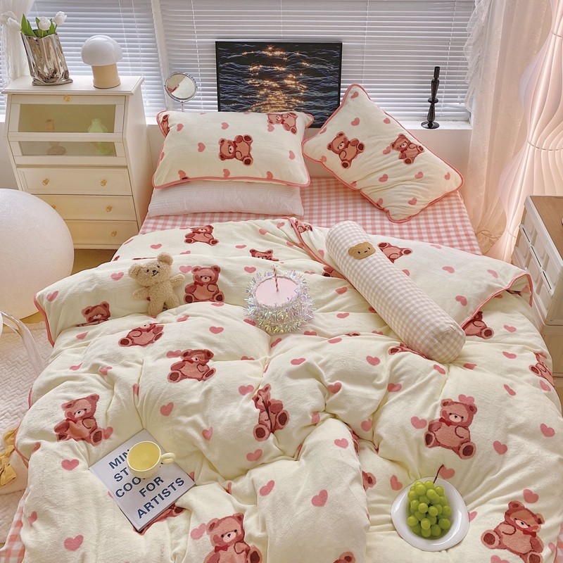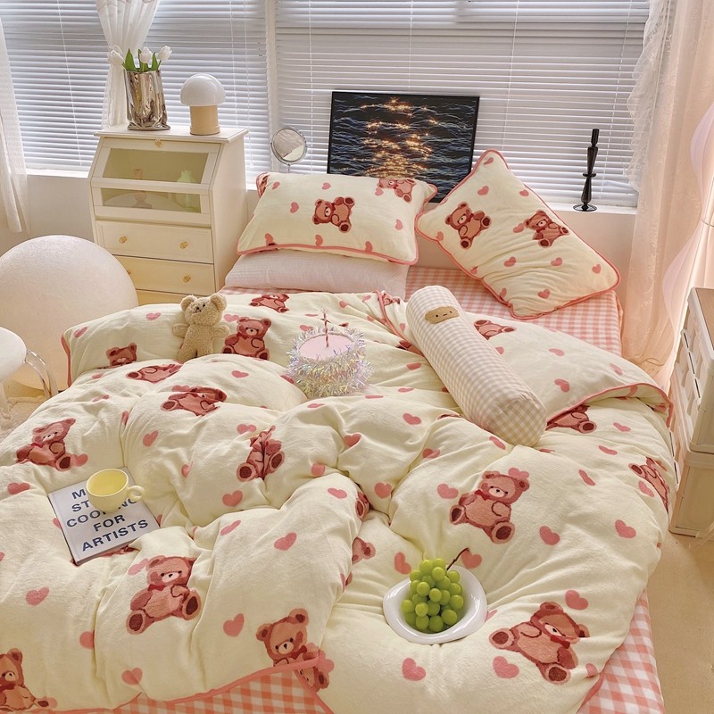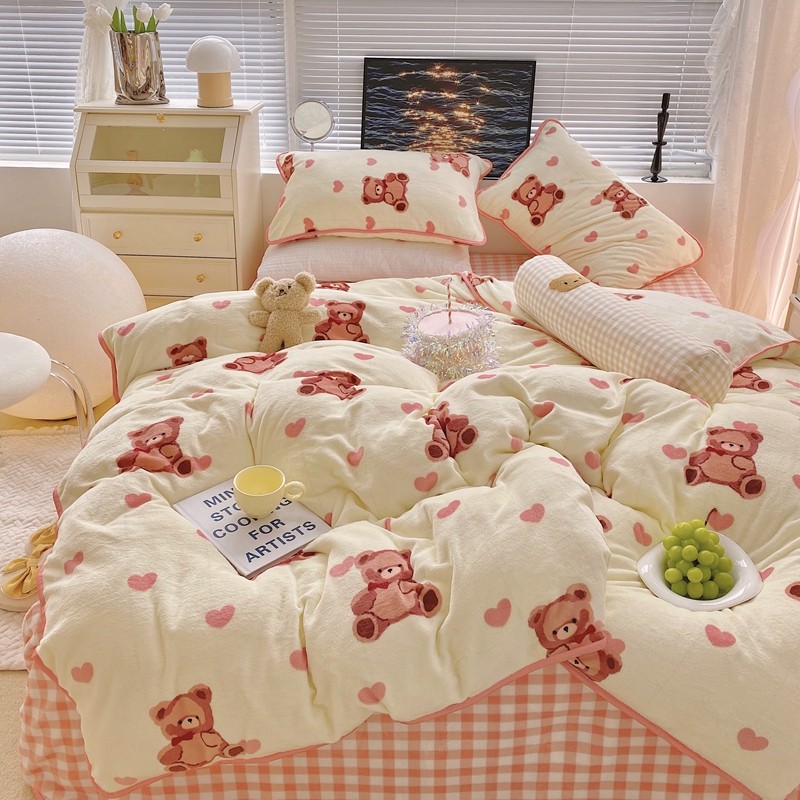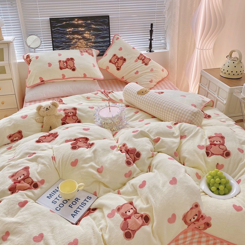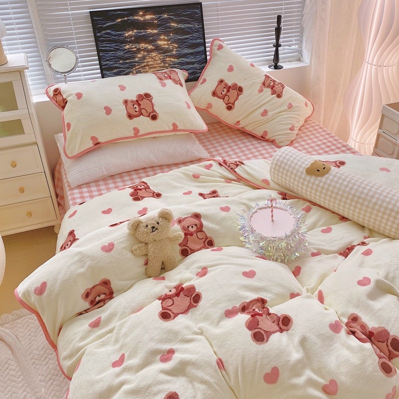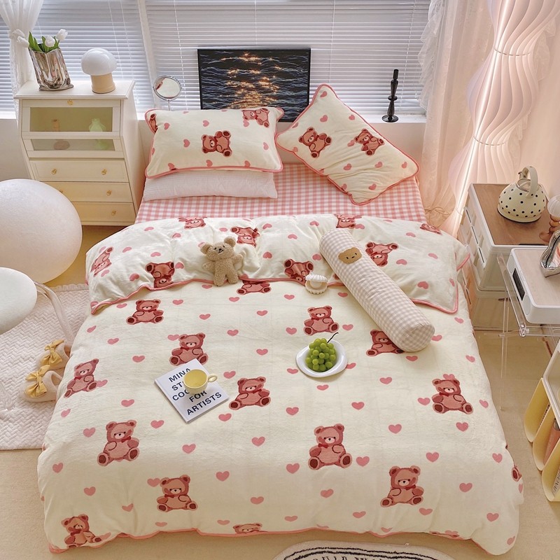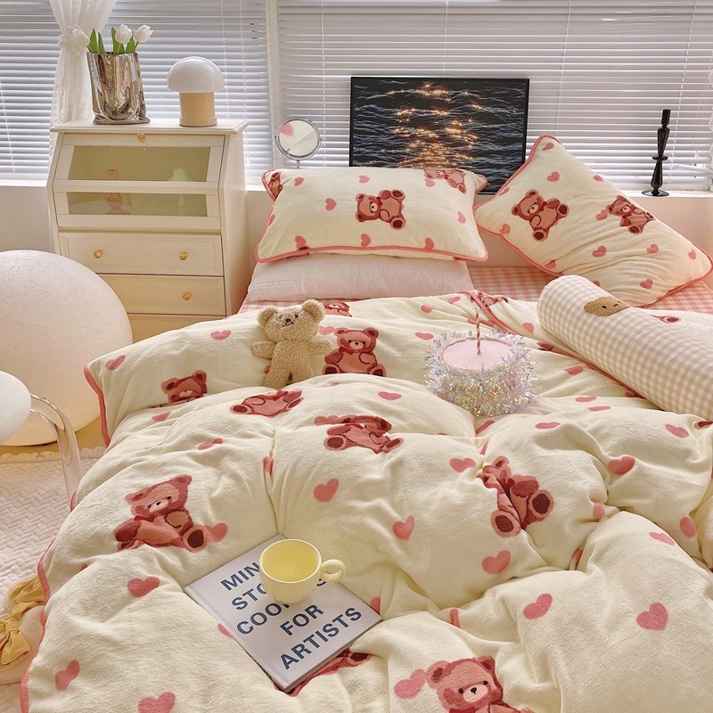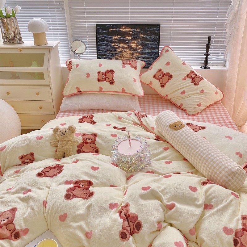 顾里家纺2021新款ins韩国高端保暖牛奶绒四件套爱心熊仔