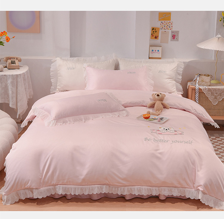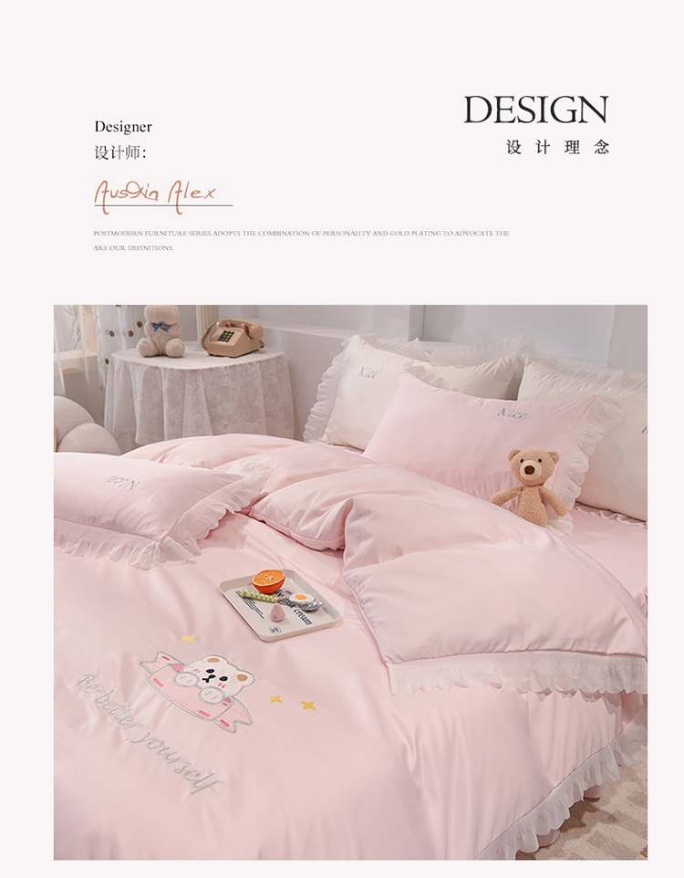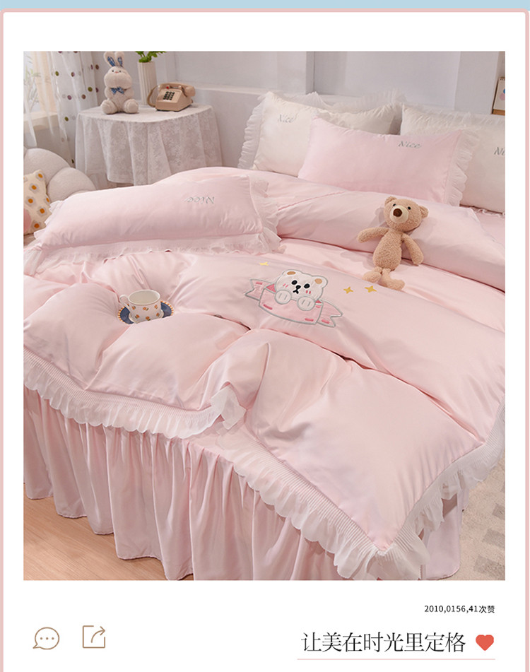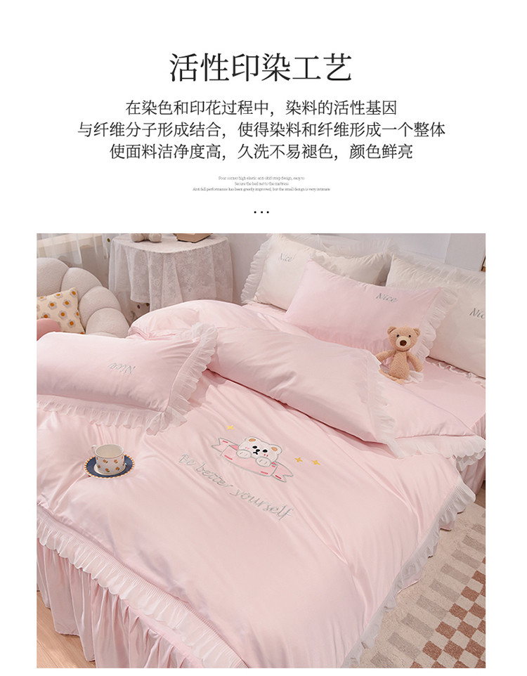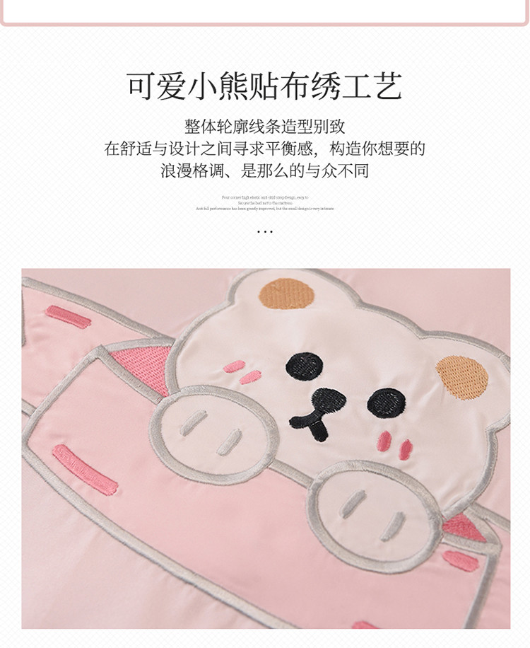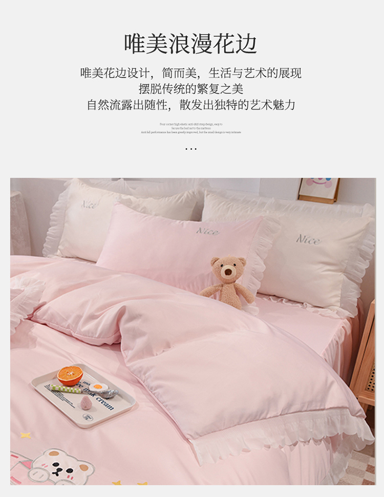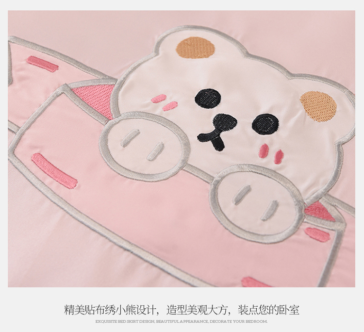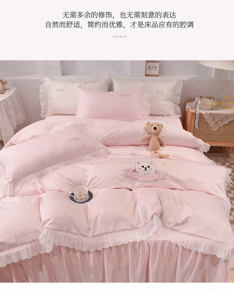 商品名称:艾米家居 2025新款水洗真丝雪纺花边贴布绣四件套-达菲小熊 淡粉