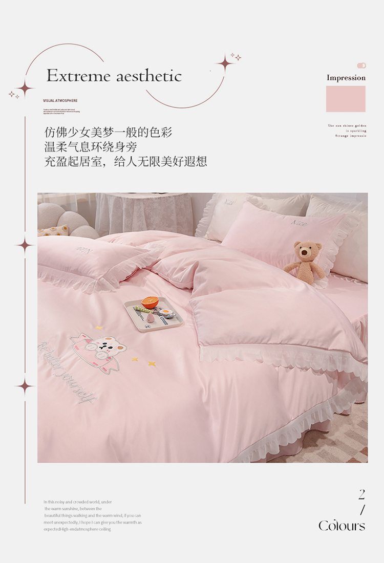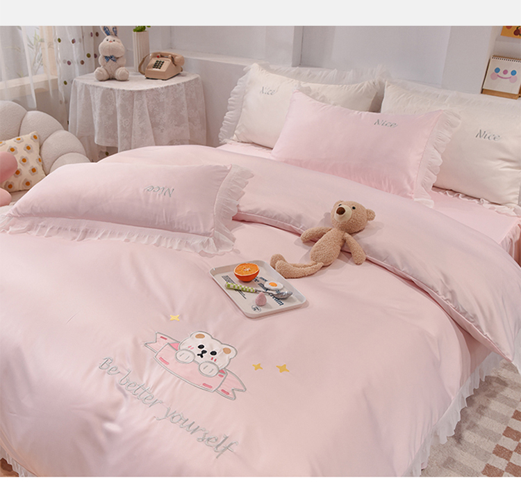 艾米家居 2025新款水洗真丝雪纺花边贴布绣四件套-达菲小熊 淡粉