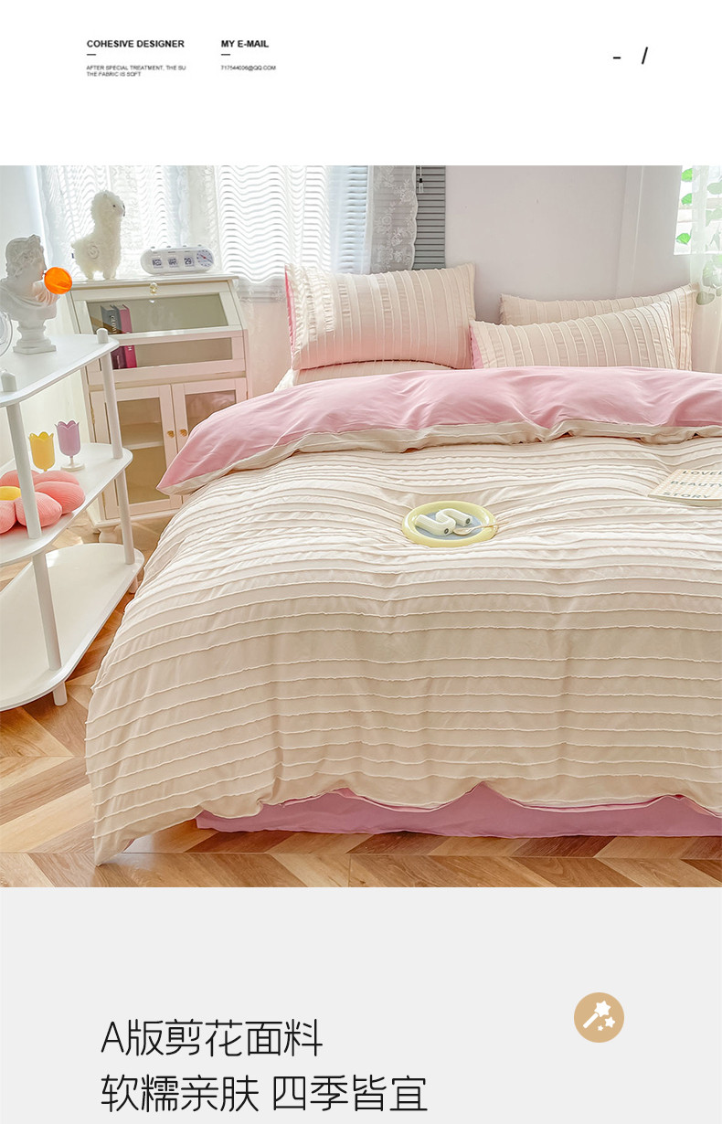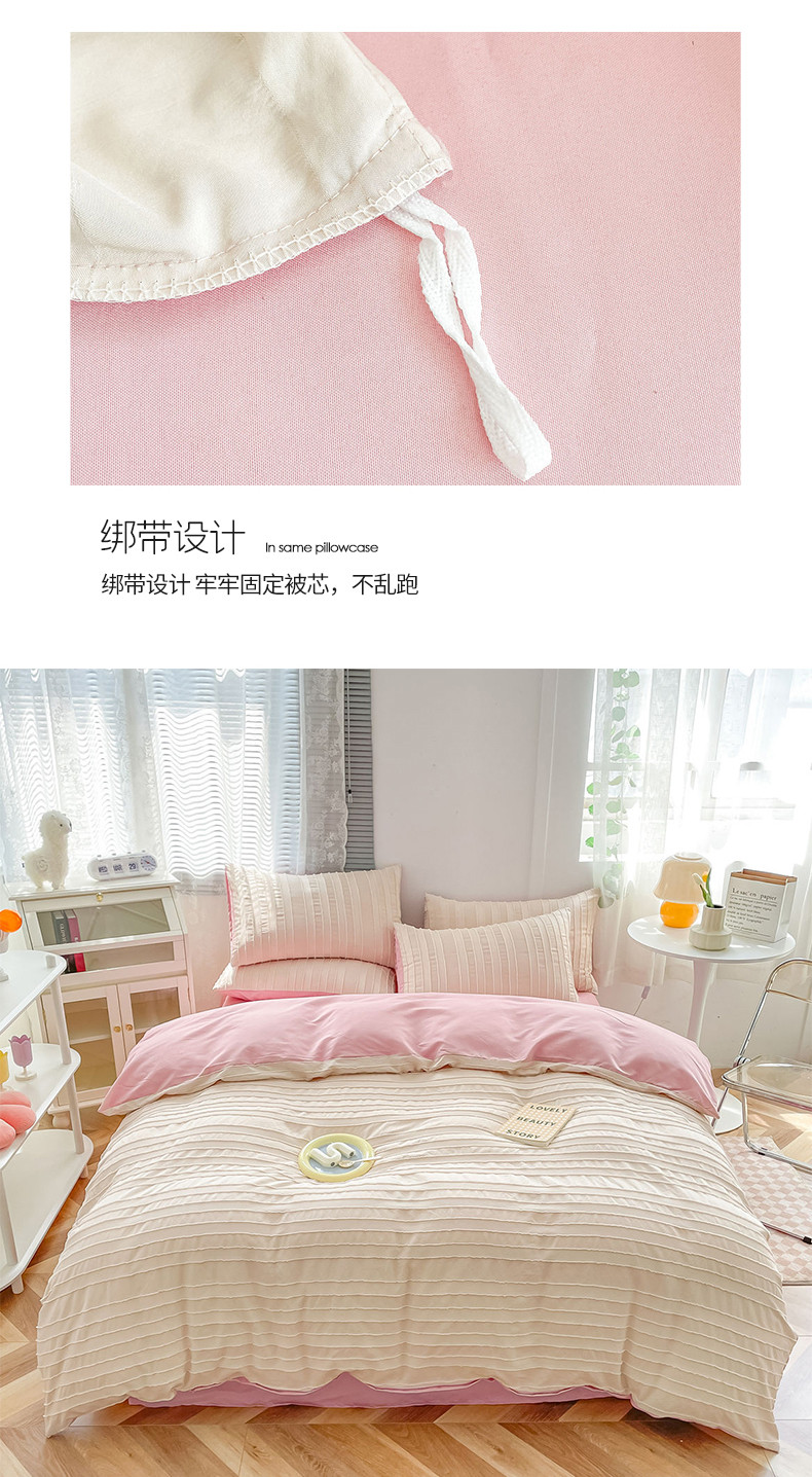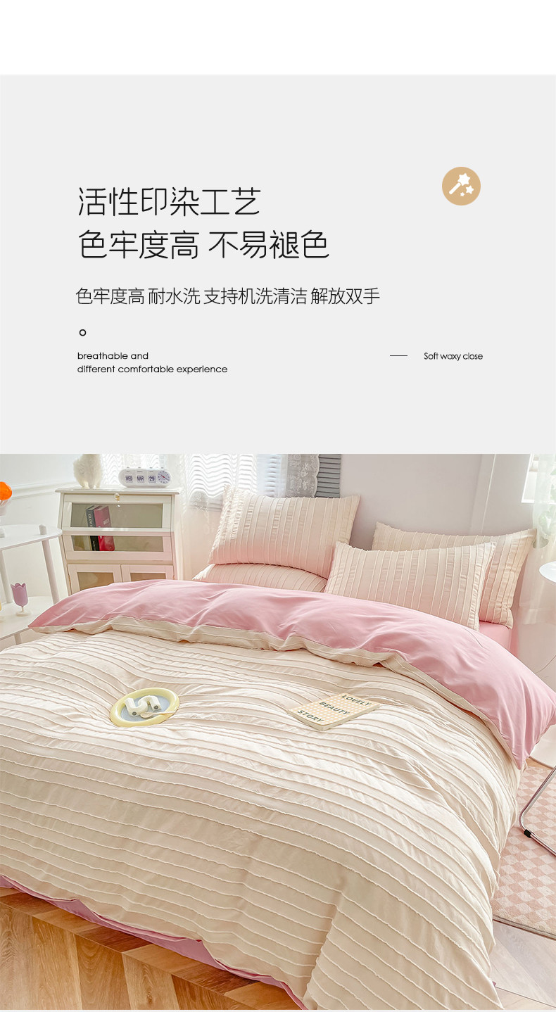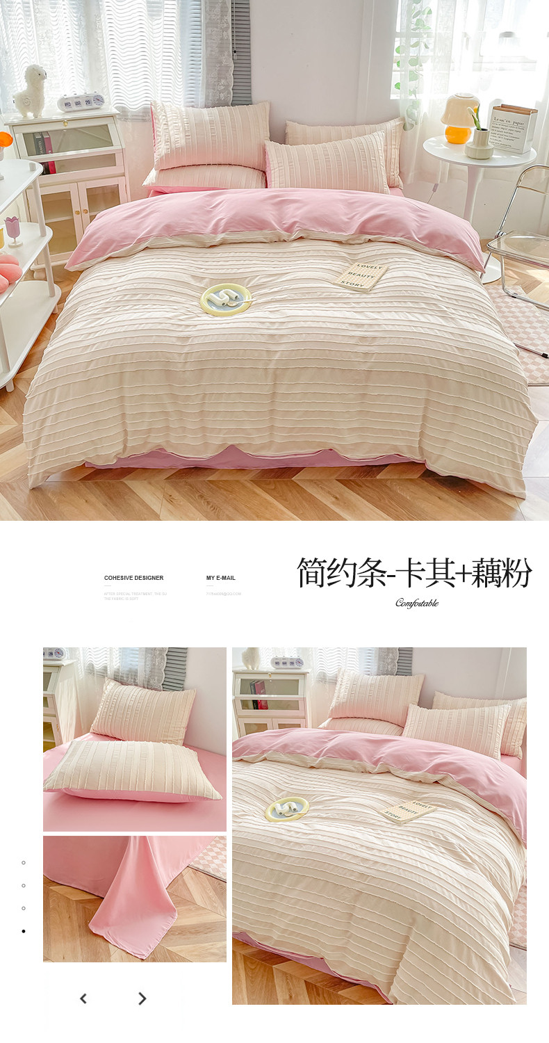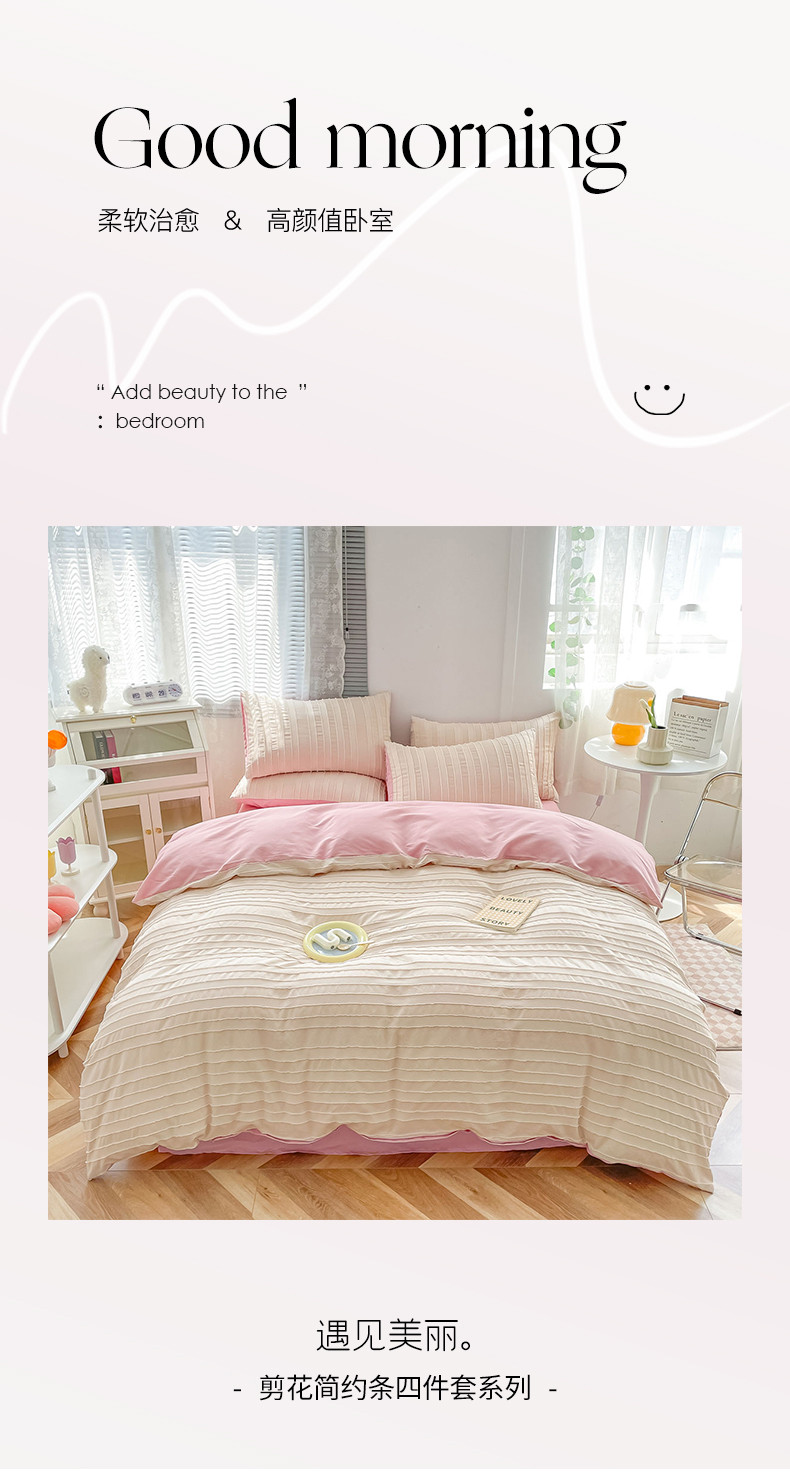 商品名称:古吉梦 2022新款剪花简约条系列四件套简约条-卡其+藕粉
