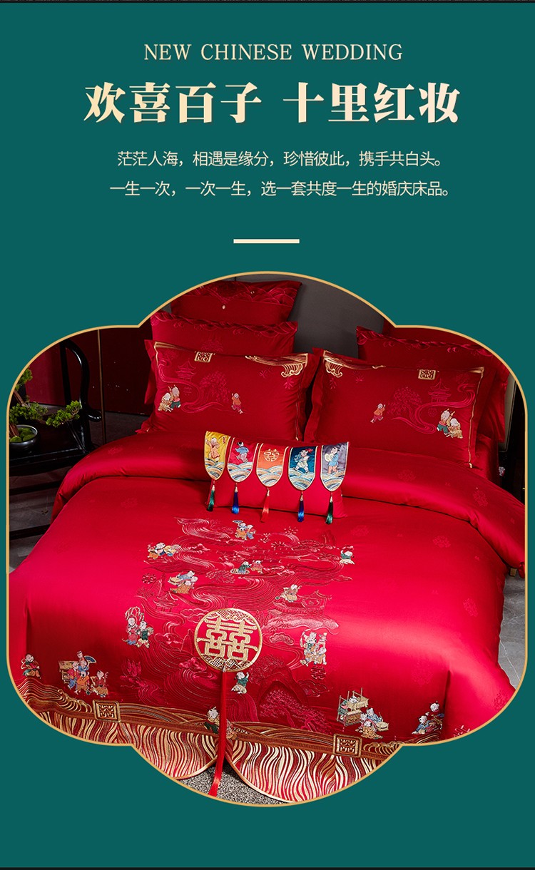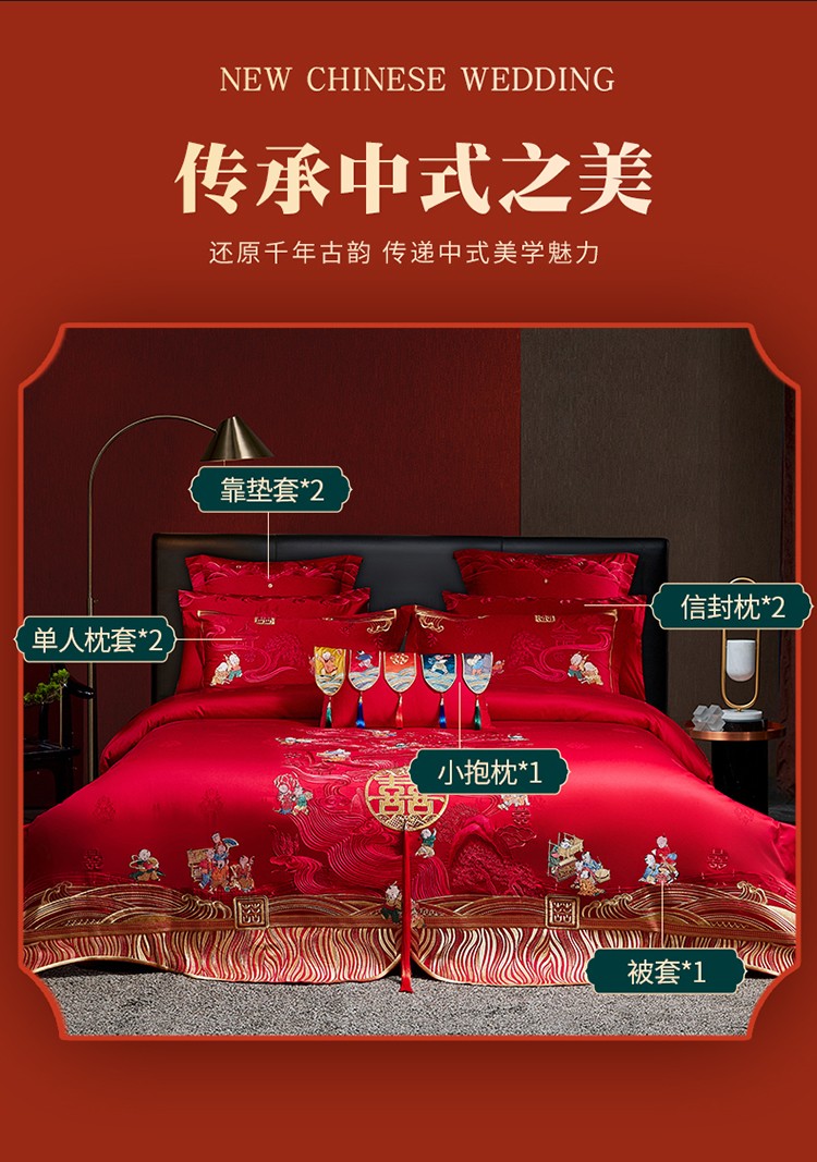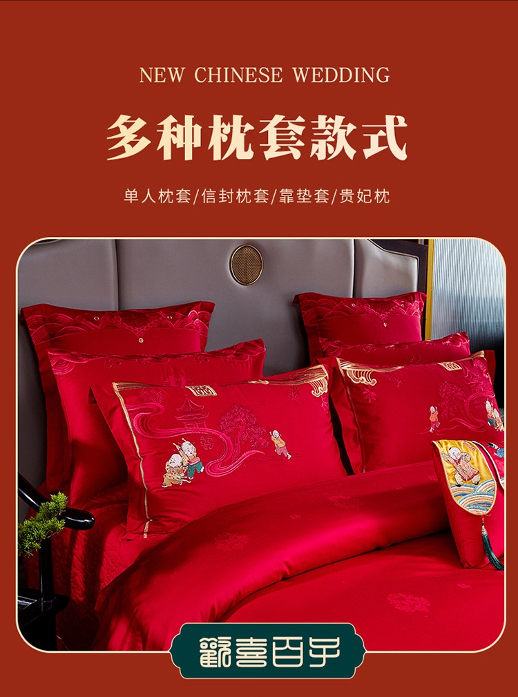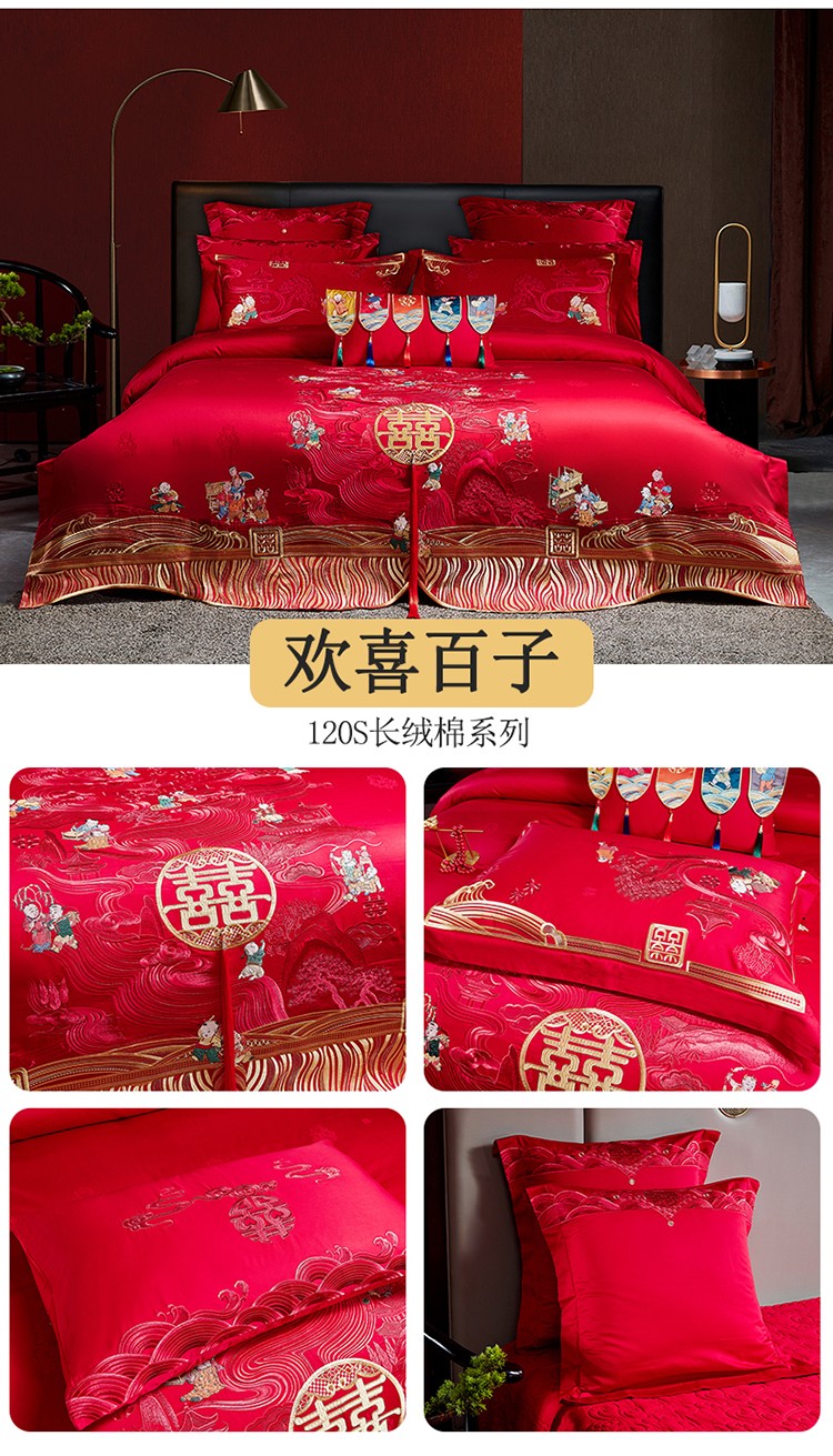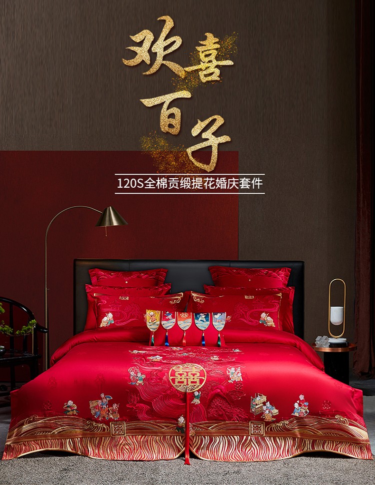 当前位置: 91家纺网 > 商品网购 > 床品套件 > 四件套 > 婚庆四件套 > 2022新款高支高密长绒棉婚庆套件 欢喜百子