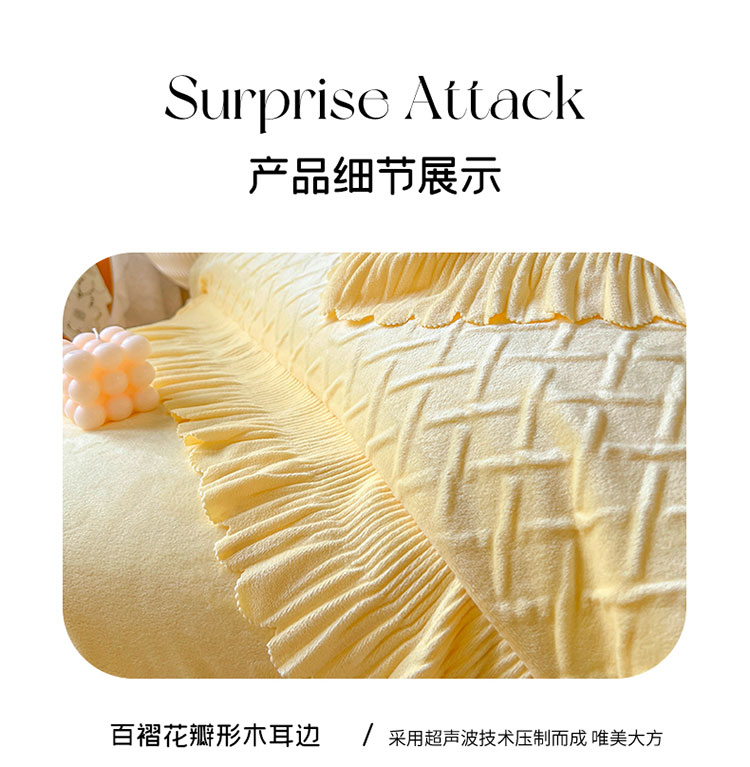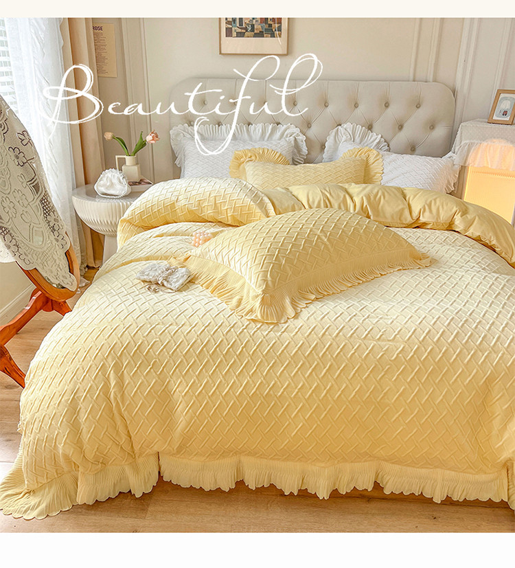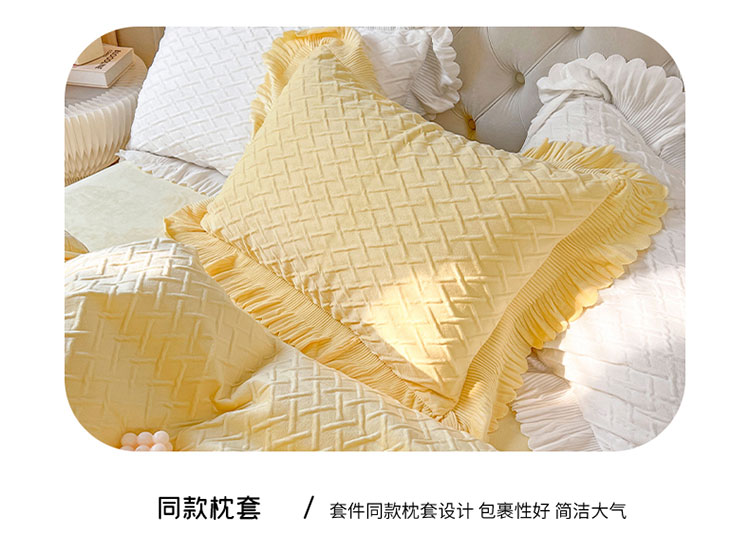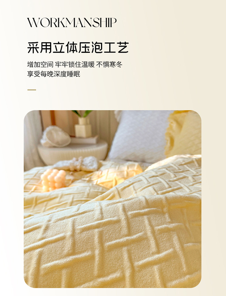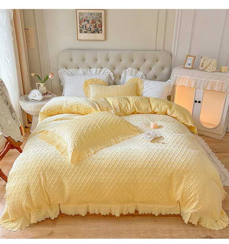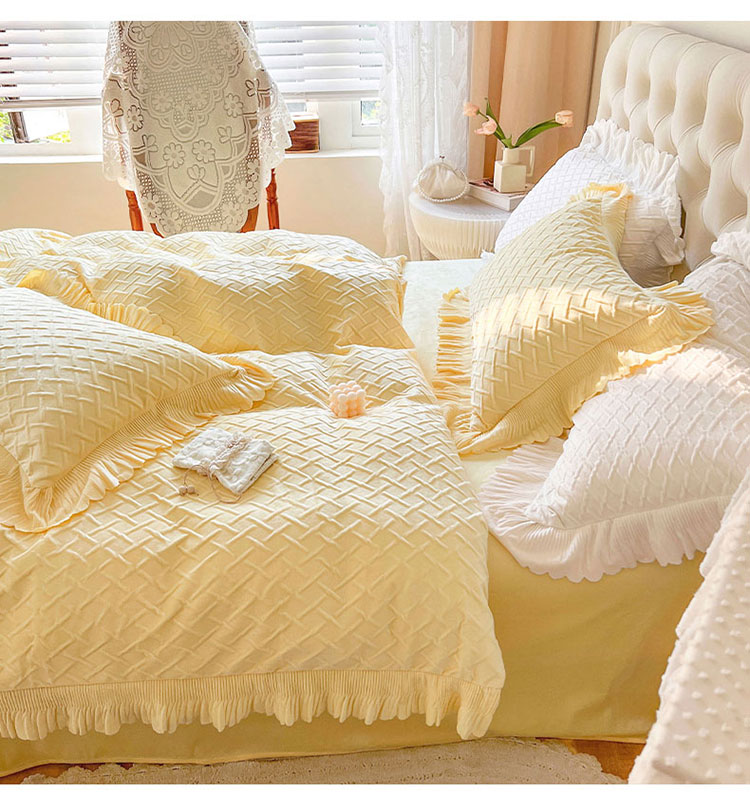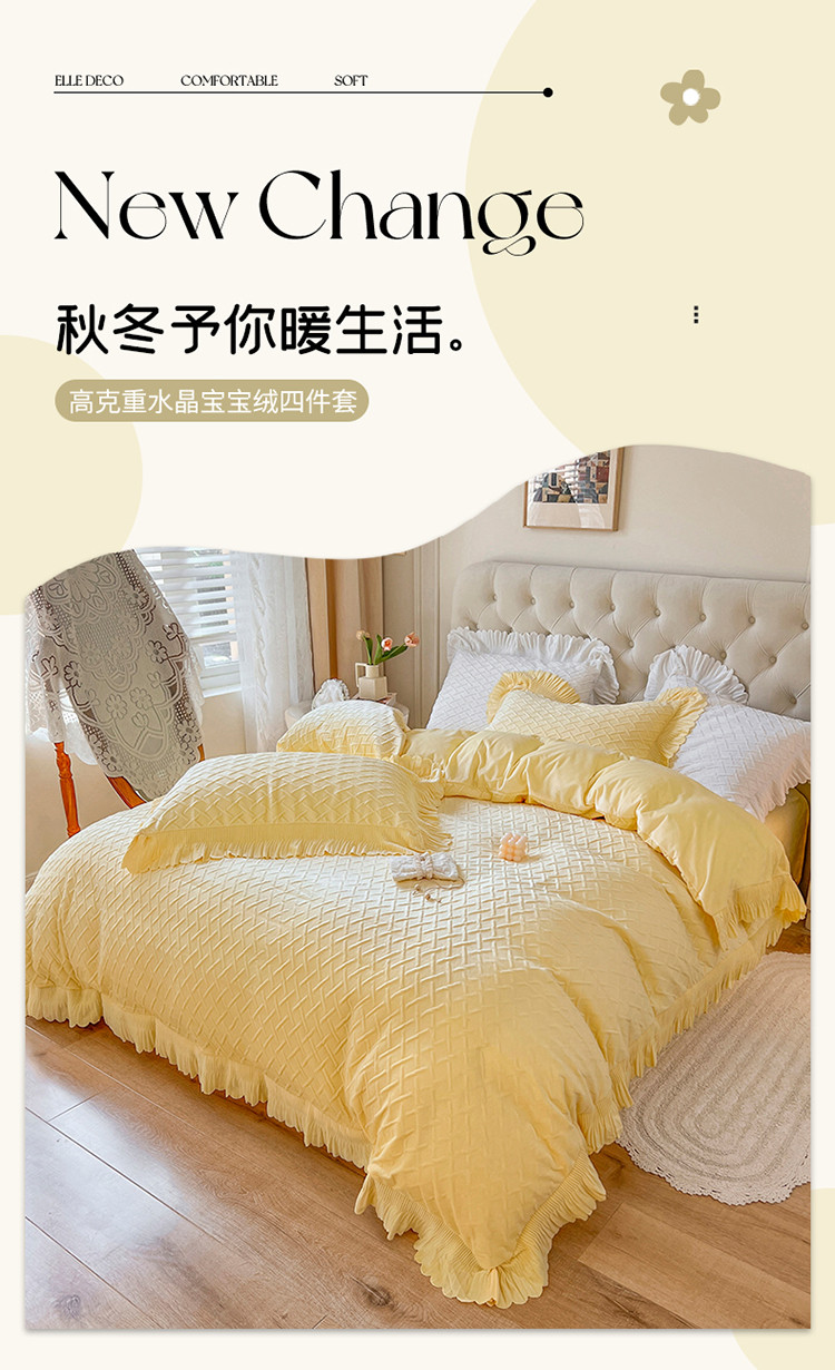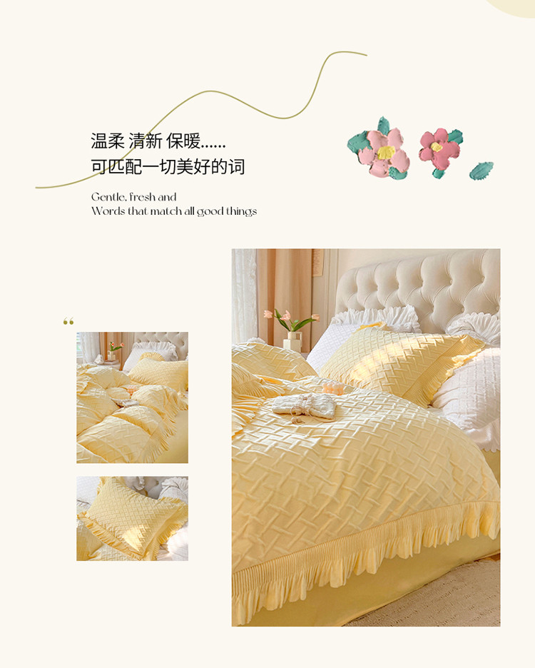 当前位置: 91家纺网 > 商品网购 > 床品套件 > 四件套 > 宝宝绒四件套 > 惯盈新款高克重水晶绒宝宝绒四件套压泡荷叶边四件套-泡泡格 黄
