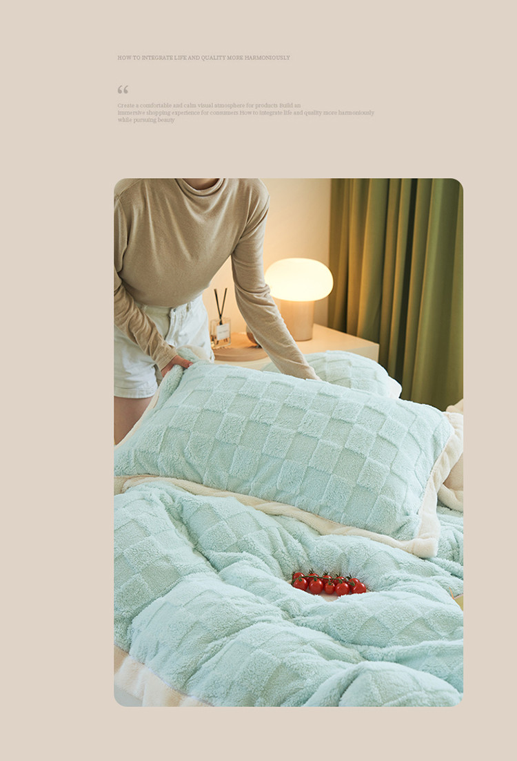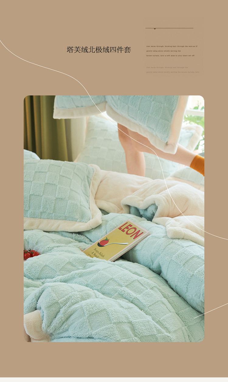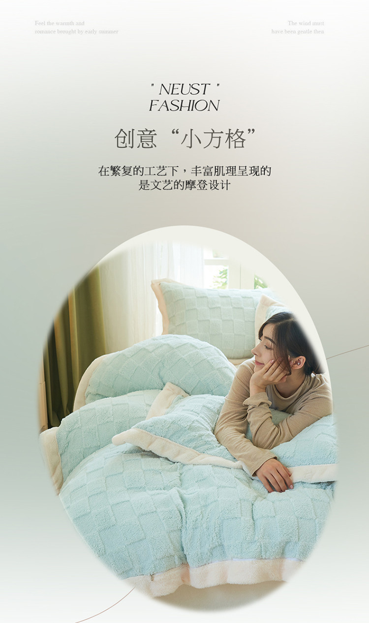 商品名称:晨曦2022塔芙绒北极绒牛奶绒法莱绒四件套 小方格-粉蜡淡绿