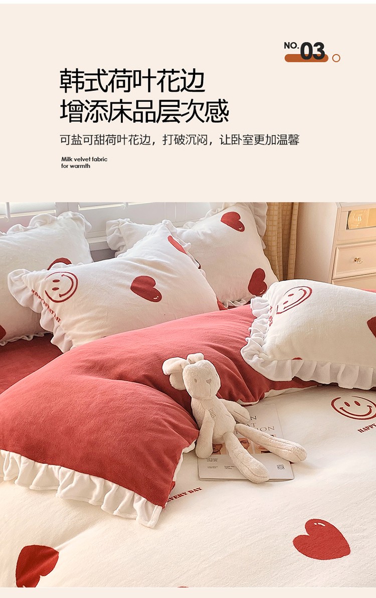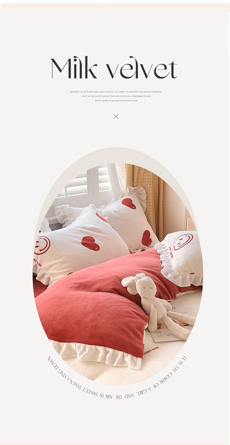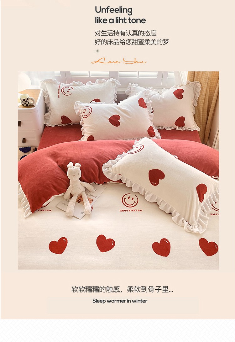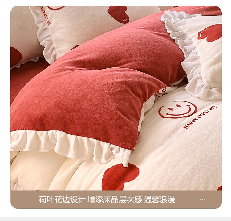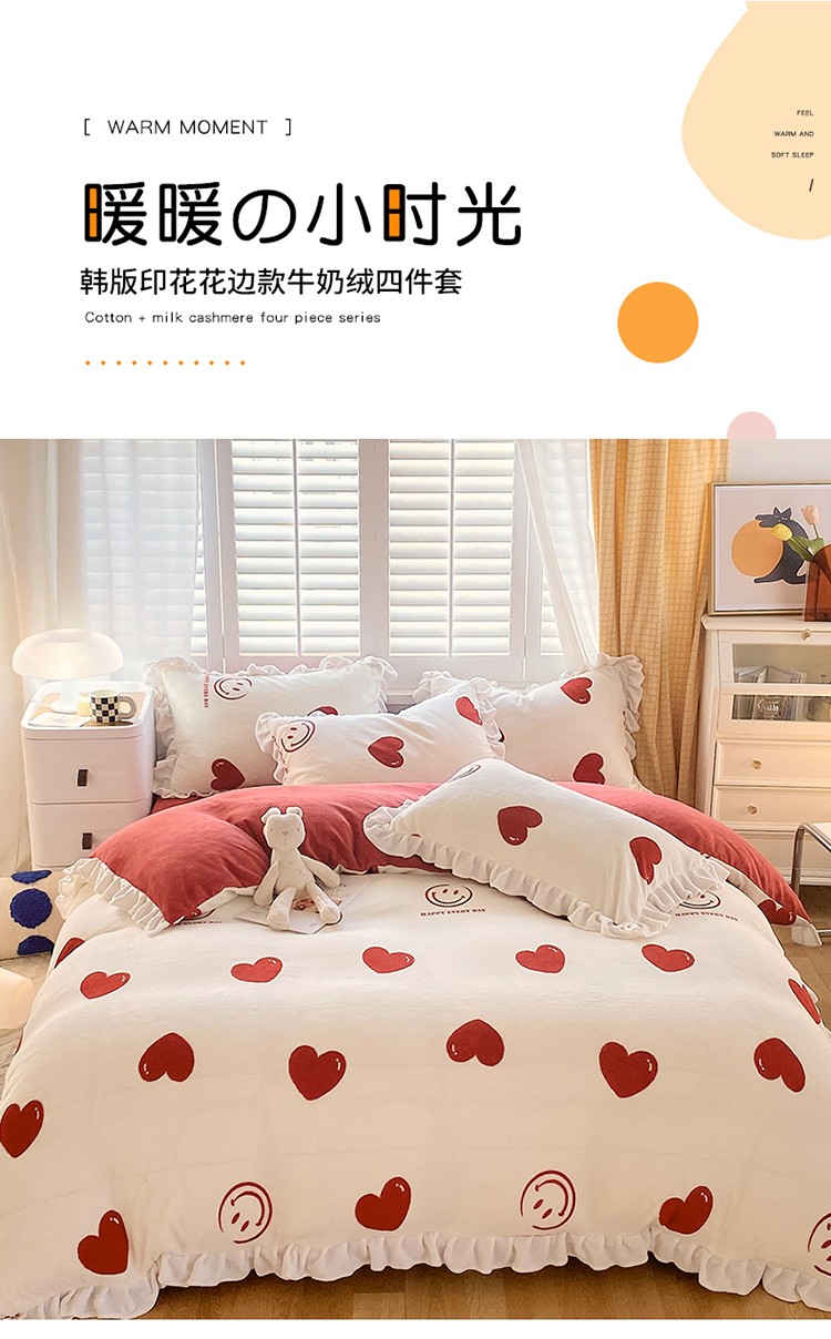 商品名称:雅绅阁 2022新款高克重印花牛奶绒四件套花边款直播 一见倾心
