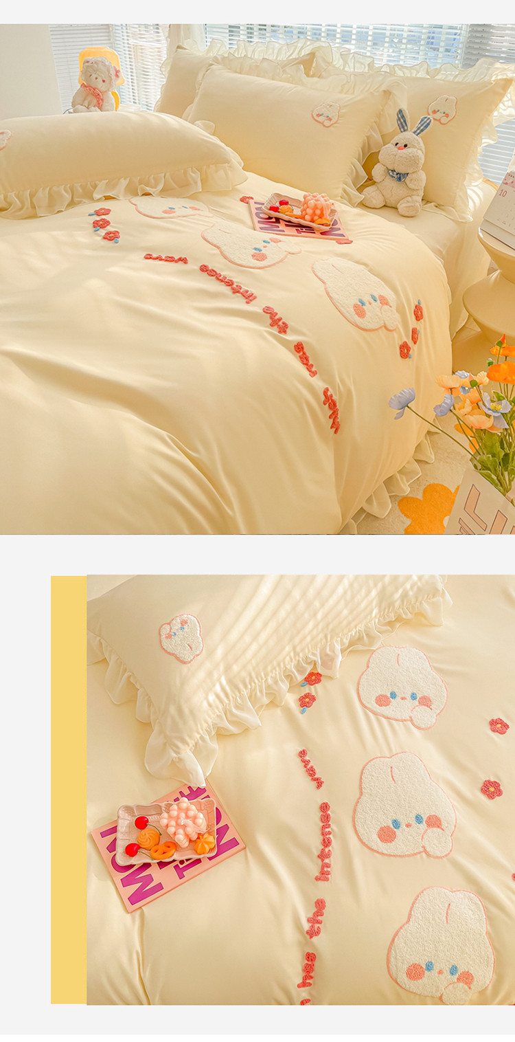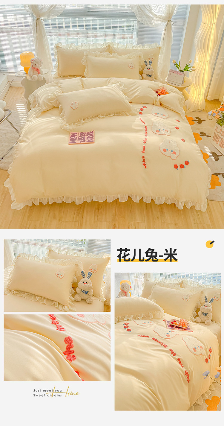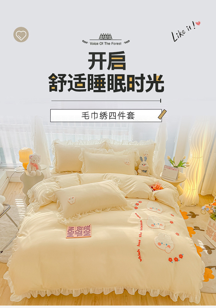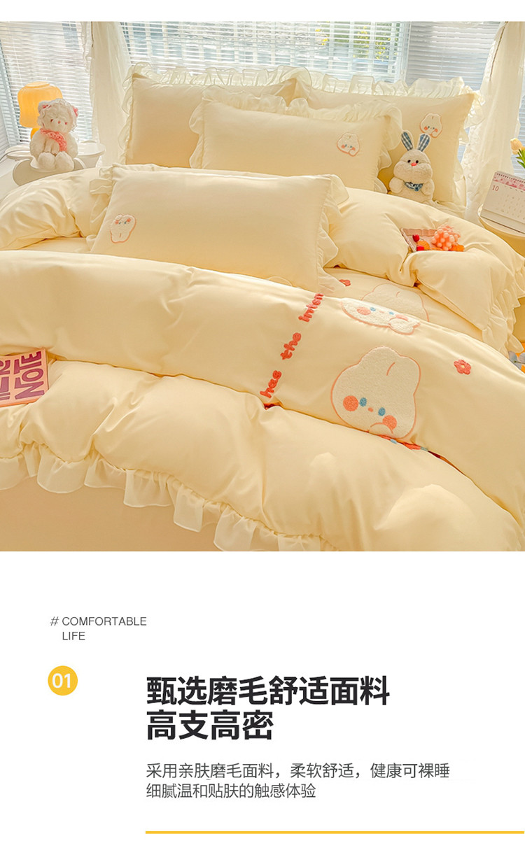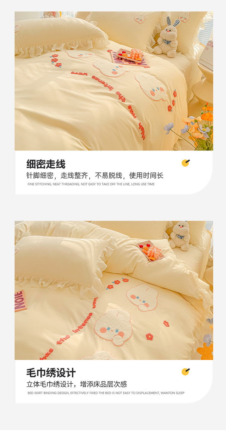 当前位置: 91家纺网 > 商品网购 > 床品套件 > 四件套 > 毛巾绣四件套 > 我心 2023新款毛巾绣四件套-萌兔系列 花儿兔-米