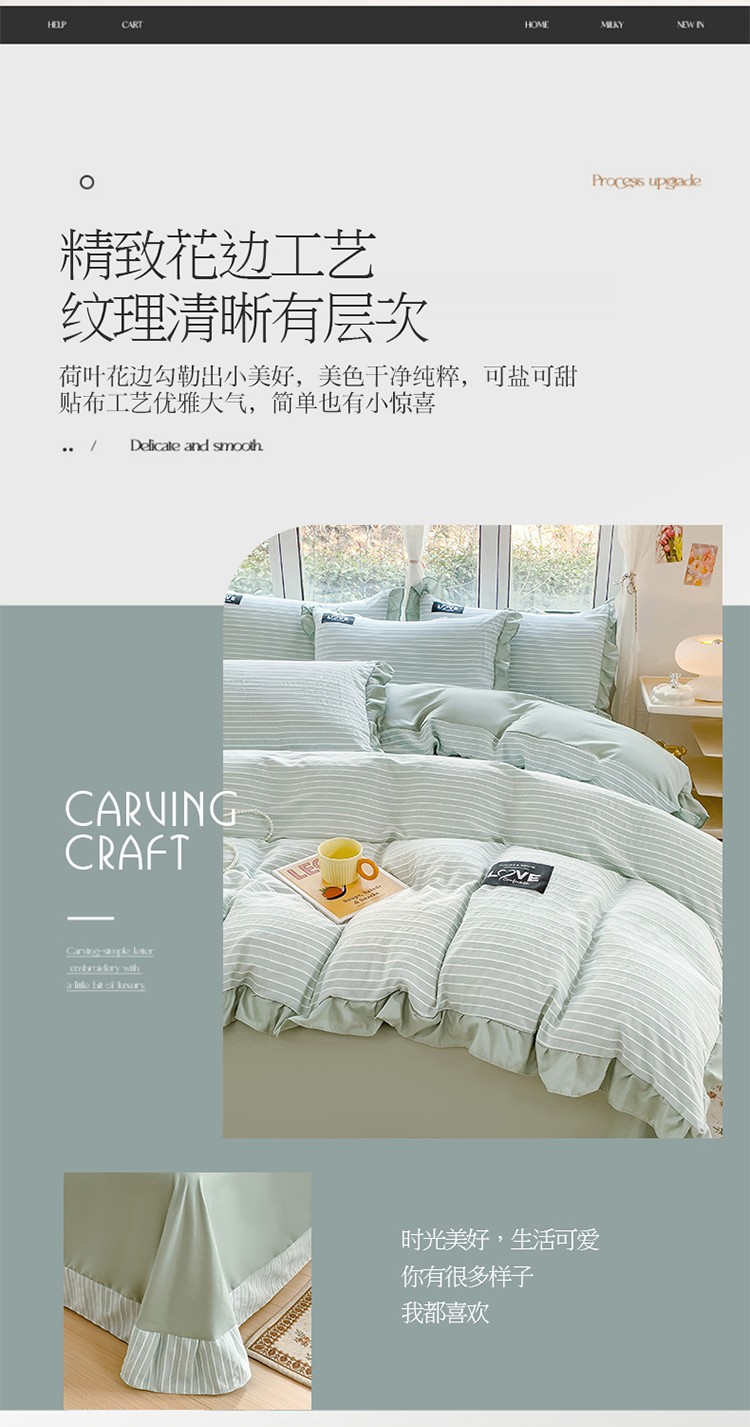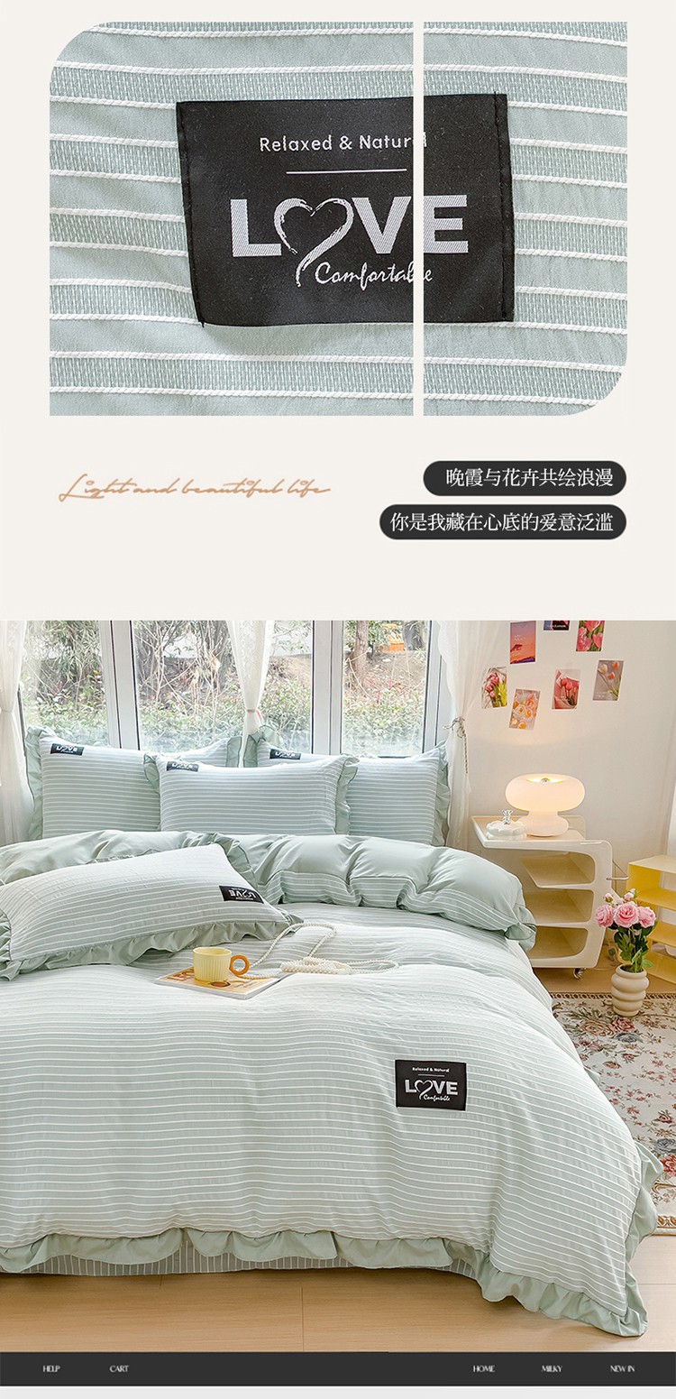 金米诺 新款韩版花边水洗棉泡泡纱四件套公主条四件套 褶皱-浅绿,褶皱-浅绿
