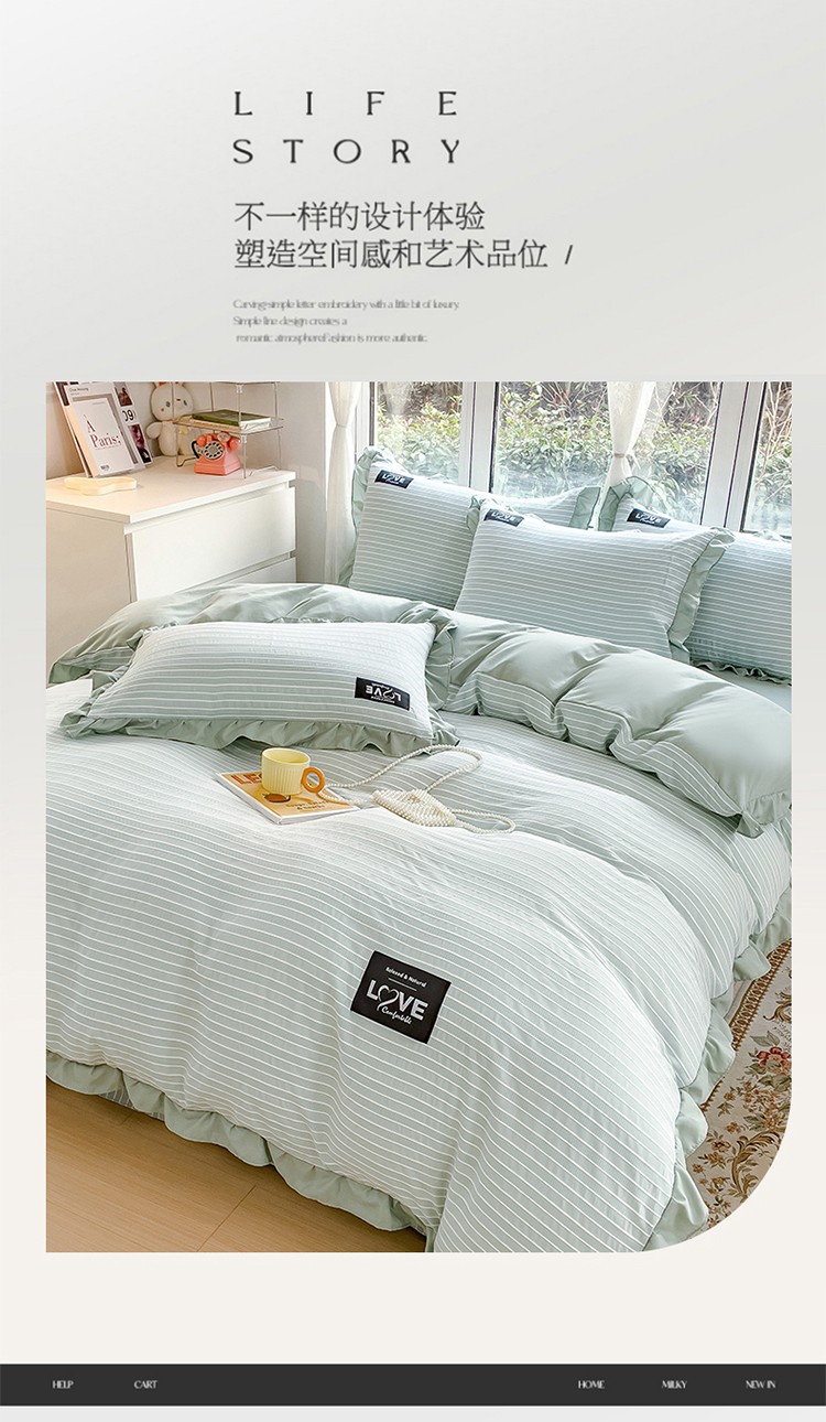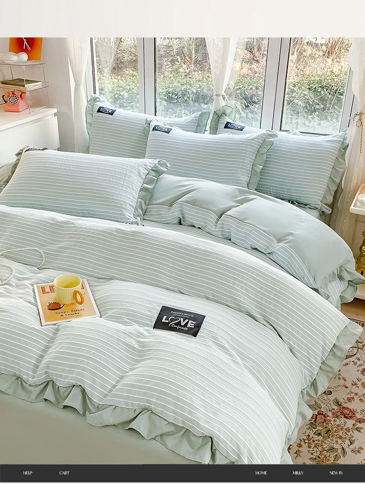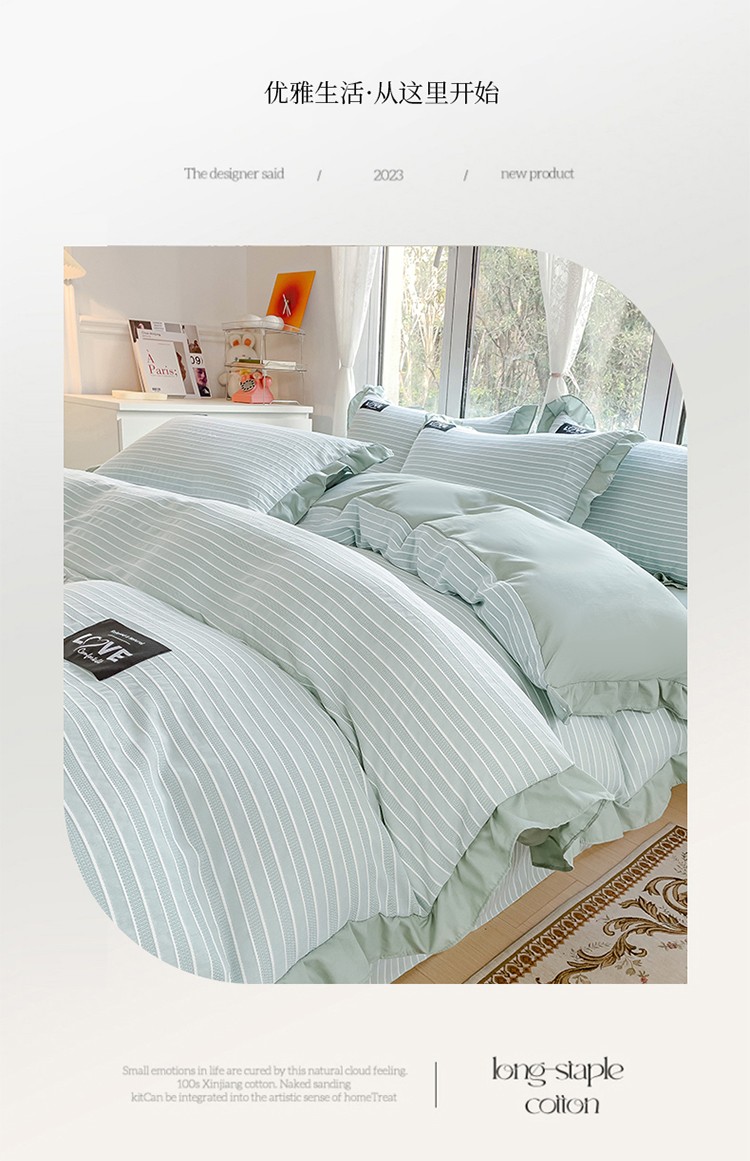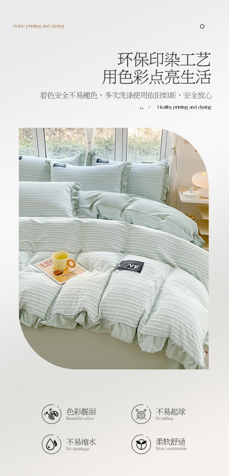 金米诺 新款韩版花边水洗棉泡泡纱四件套公主条四件套 条纹-清新绿