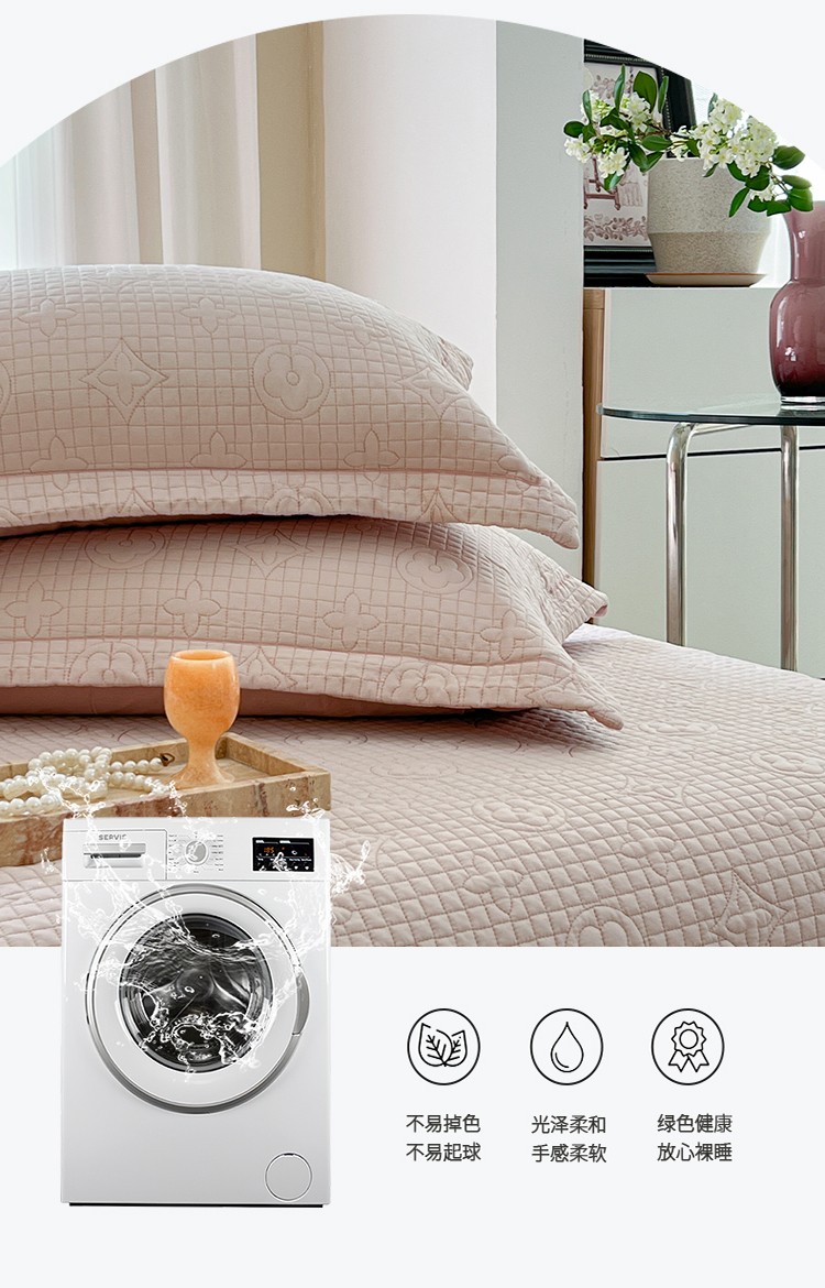 2022新款40S纯棉水洗棉全棉荷叶边夹棉床盖三件套青草绿,青草绿