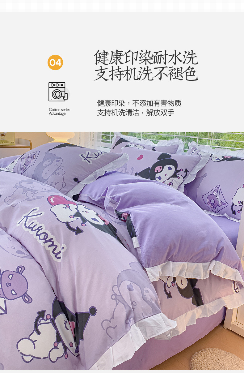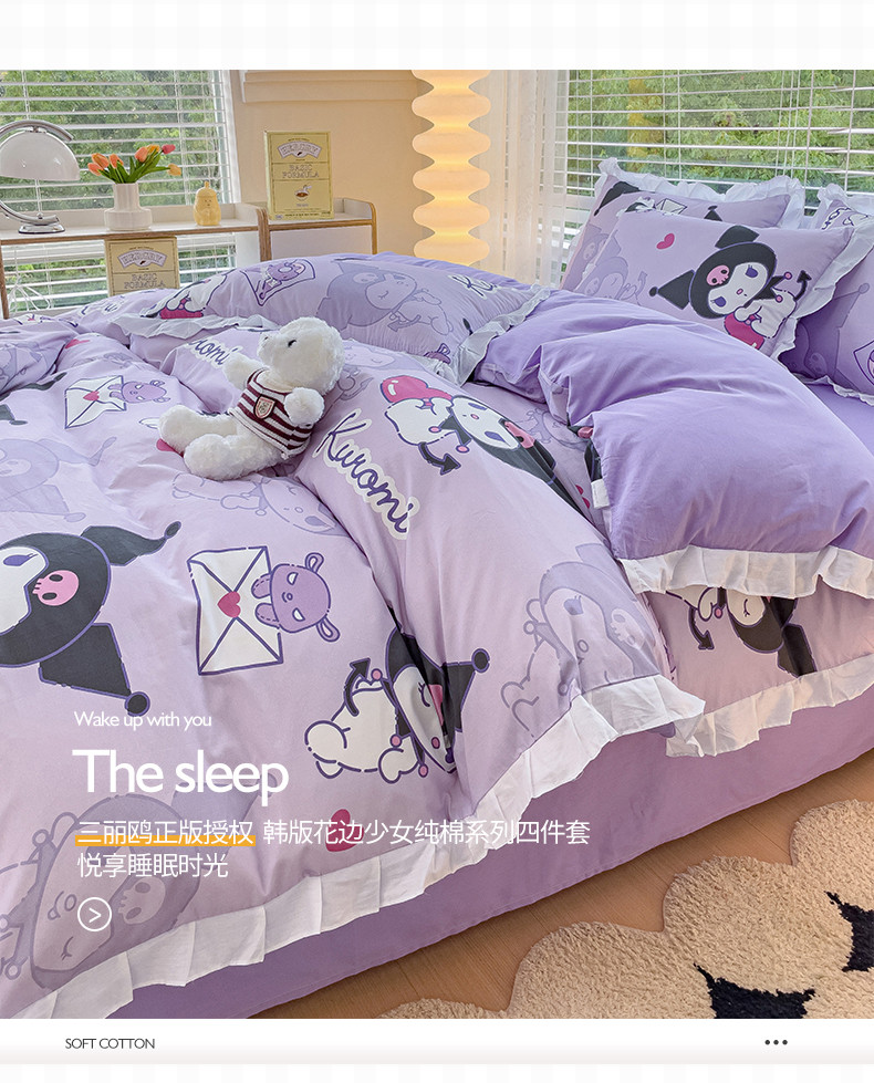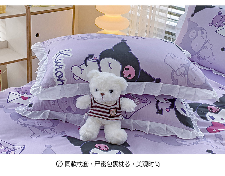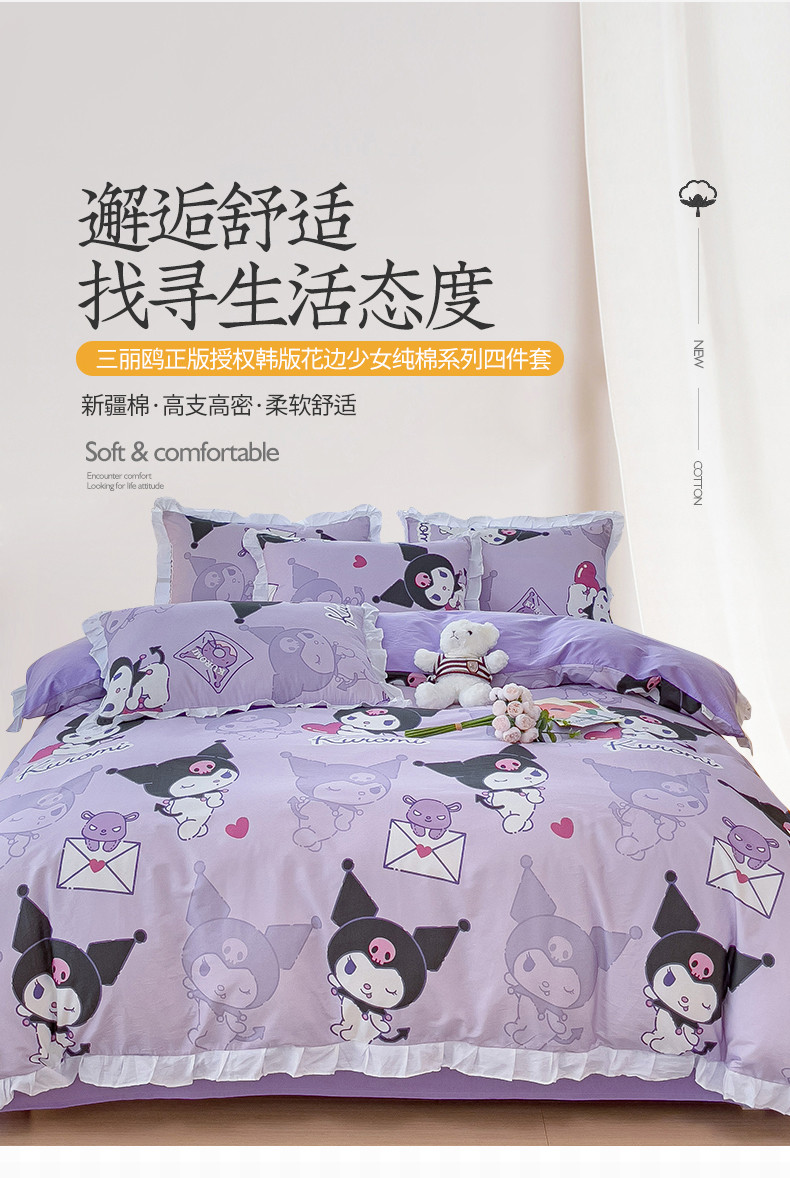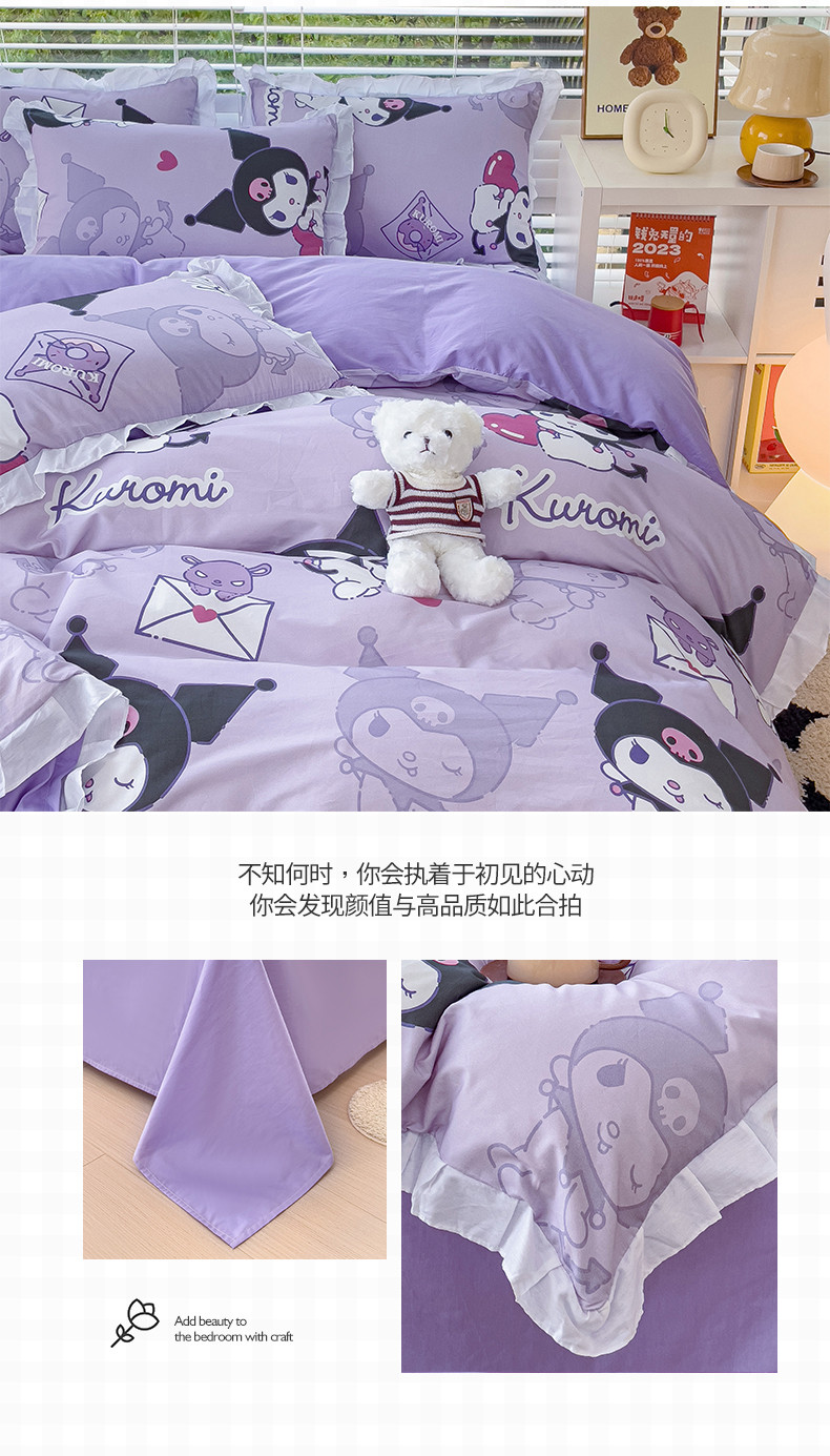 商品名称:桃子 2023新款三丽鸥正版授权韩版花边少女纯棉系列四件套 棉花边-紫紫库洛米
