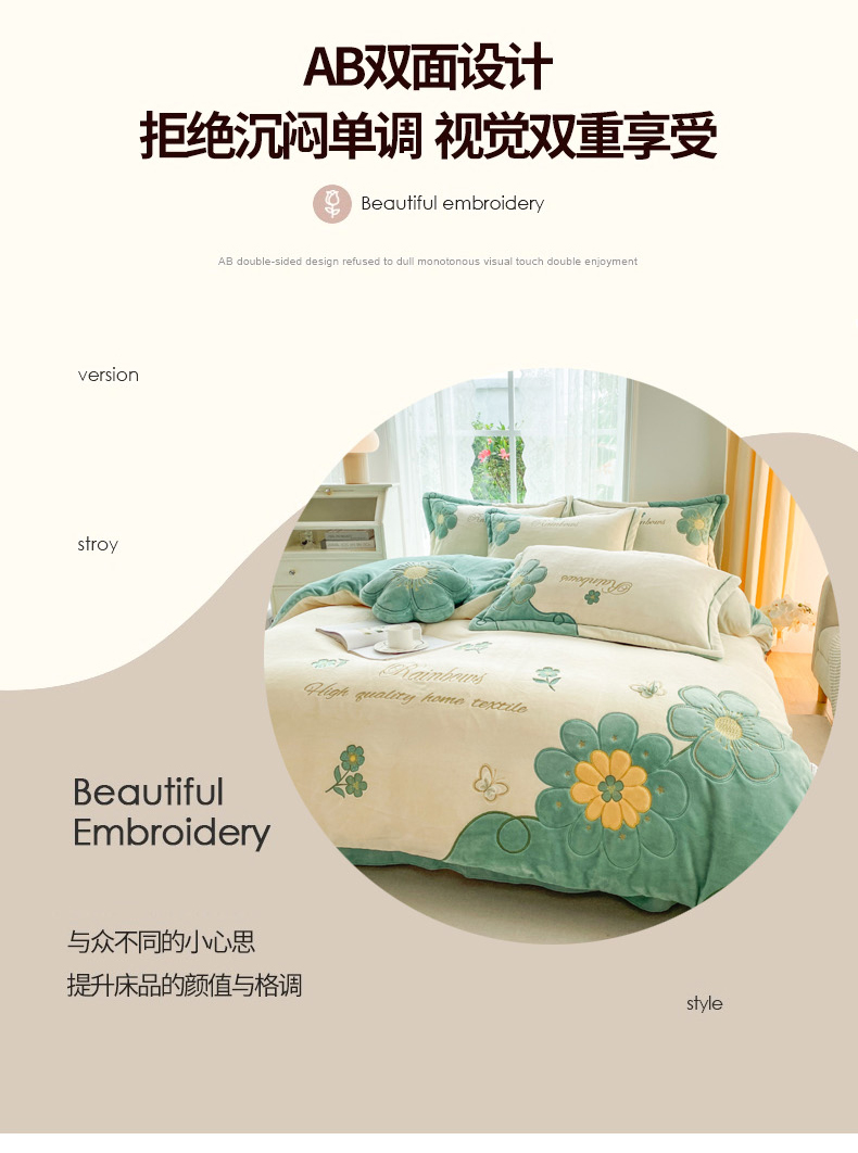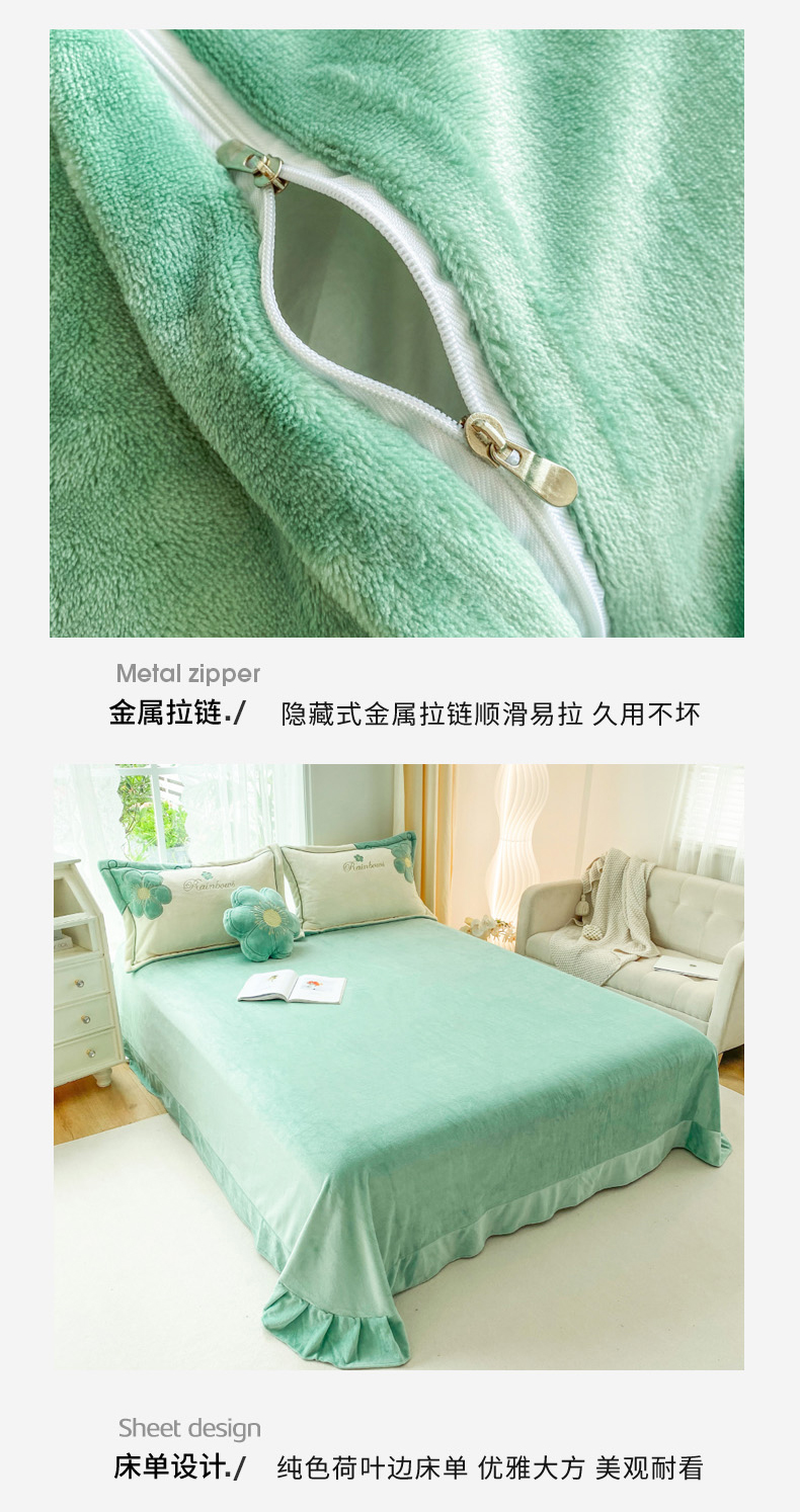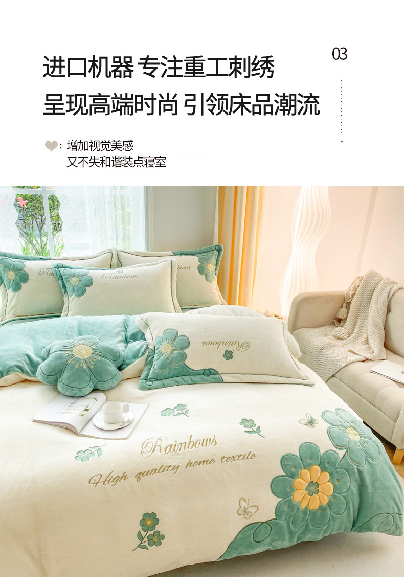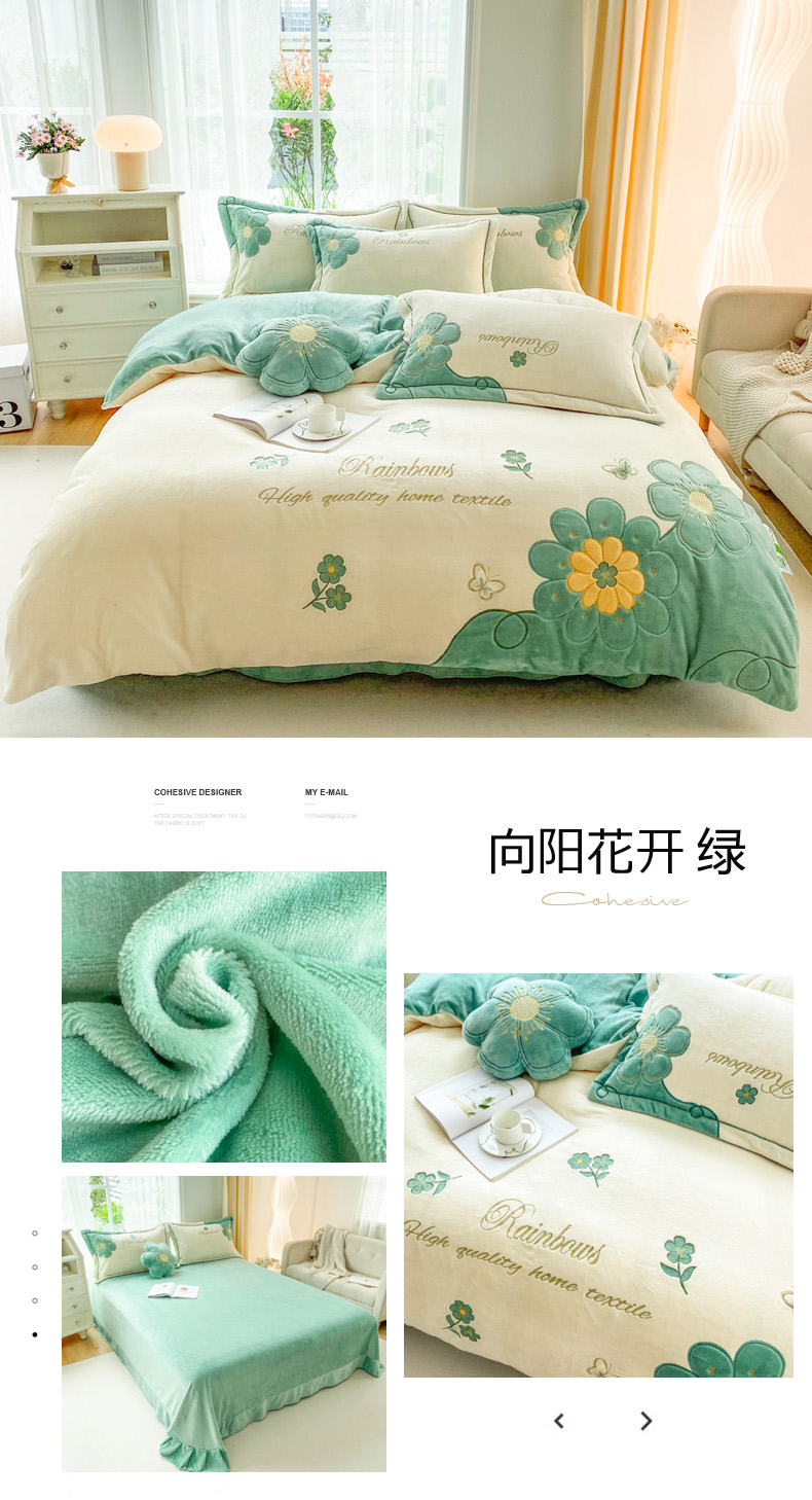 商品名称:金窝窝家纺 2024新款重工刺绣280克A类婴儿牛奶绒刺绣四件套系列-向阳花开 向阳花开—绿