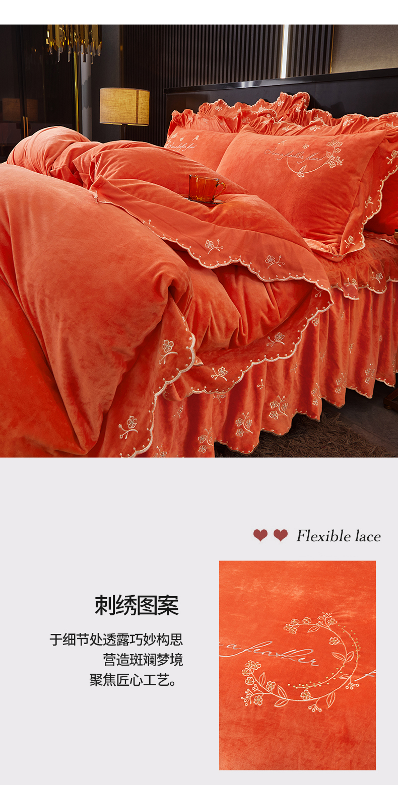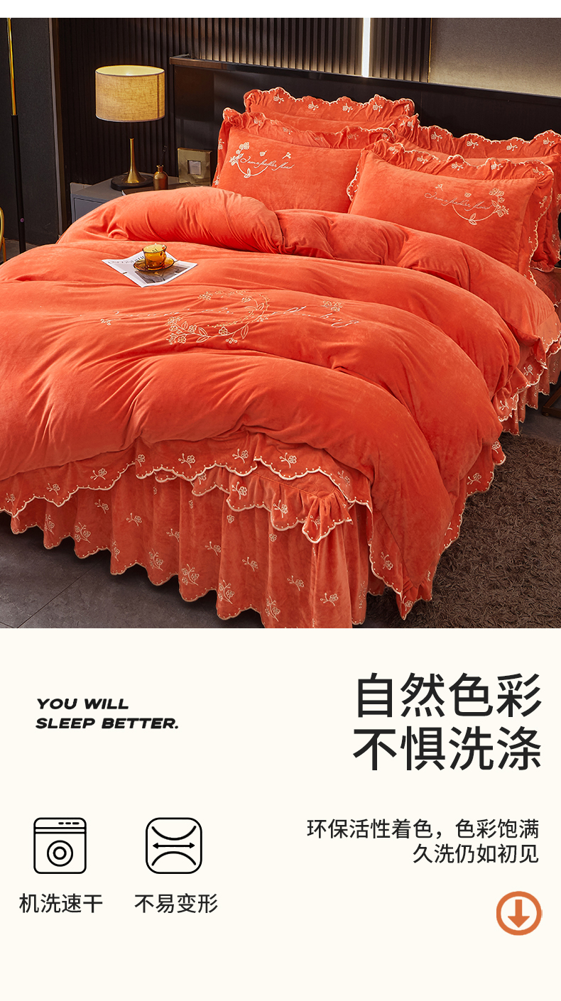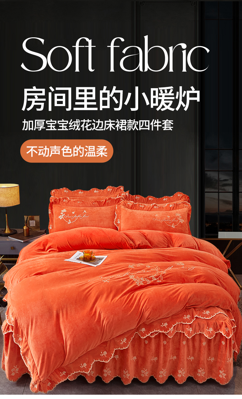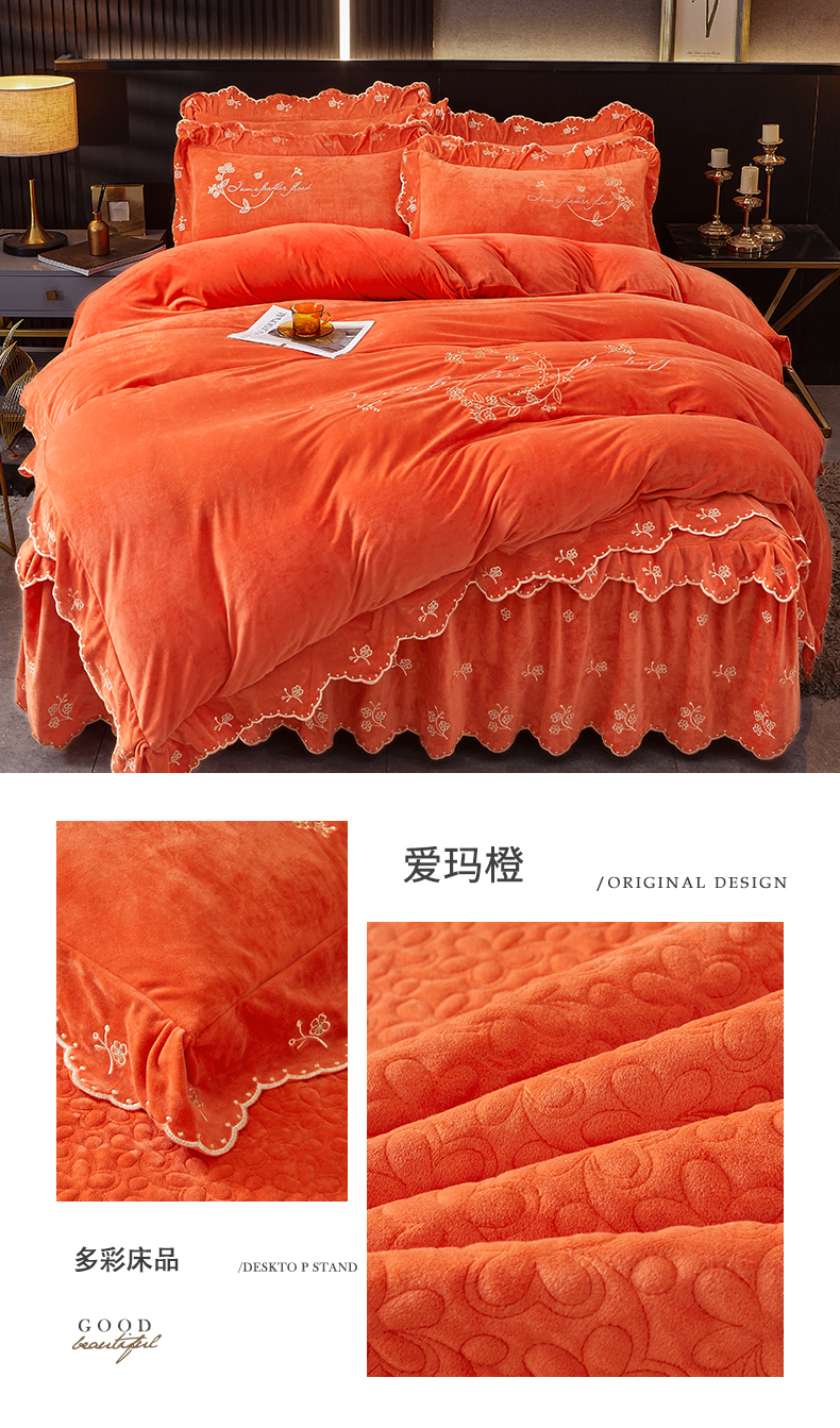 当前位置: 91家纺网 > 商品网购 > 床品套件 > 四件套 > 宝宝绒四件套 > 2023 恒爱家纺 花好月圆宝宝绒床裙四件套 爱玛橙