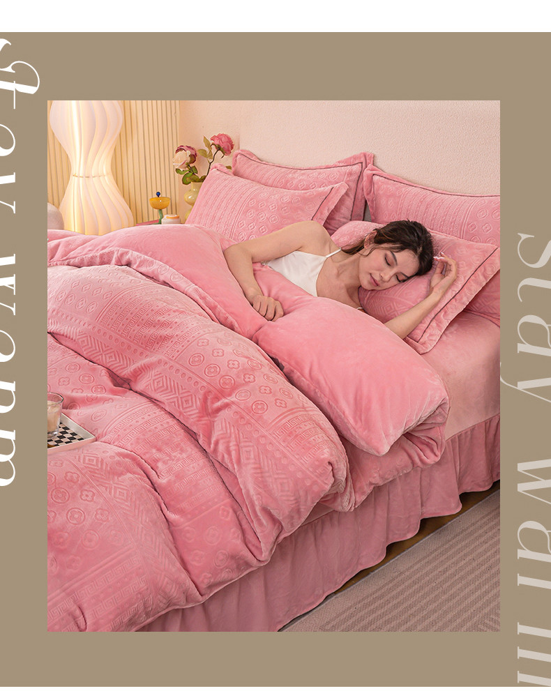 博兰蒂 2023新款时尚烂花牛奶绒四件套-多米系列 少女粉