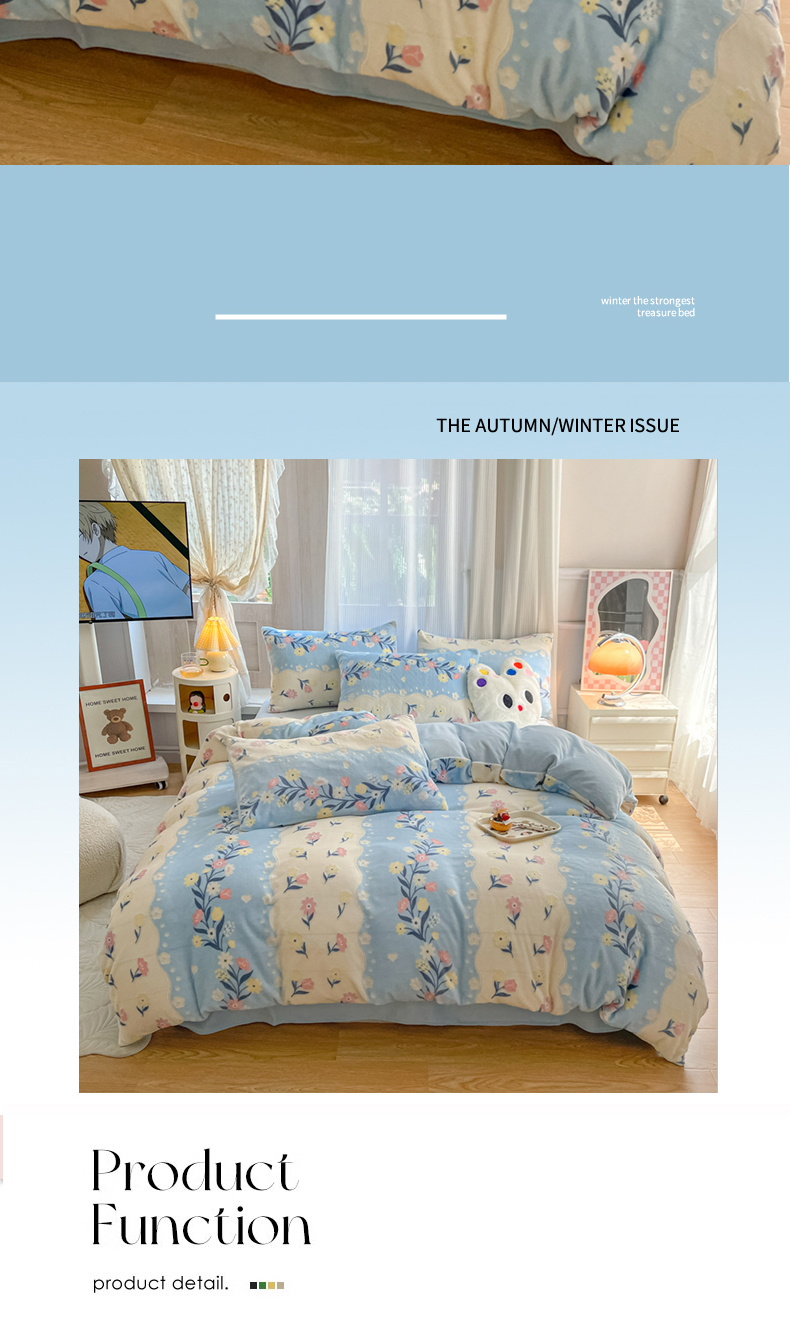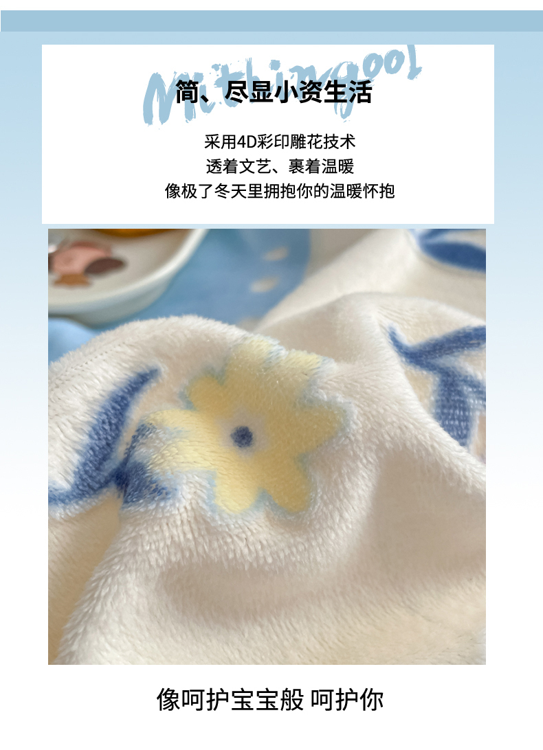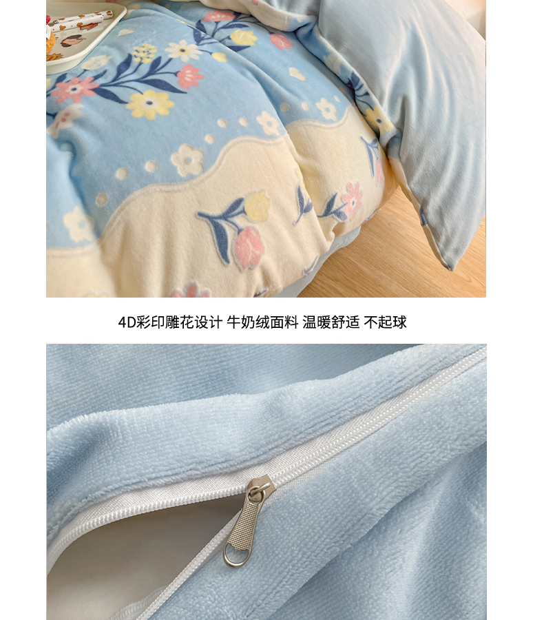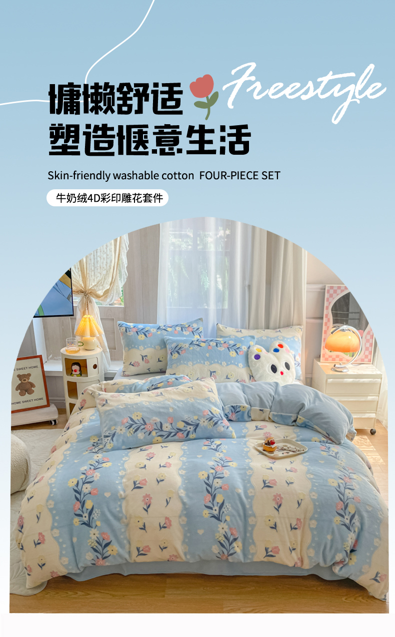 2023 索飞特 新款牛奶绒4D彩印雕花四件套 花雨-蓝
