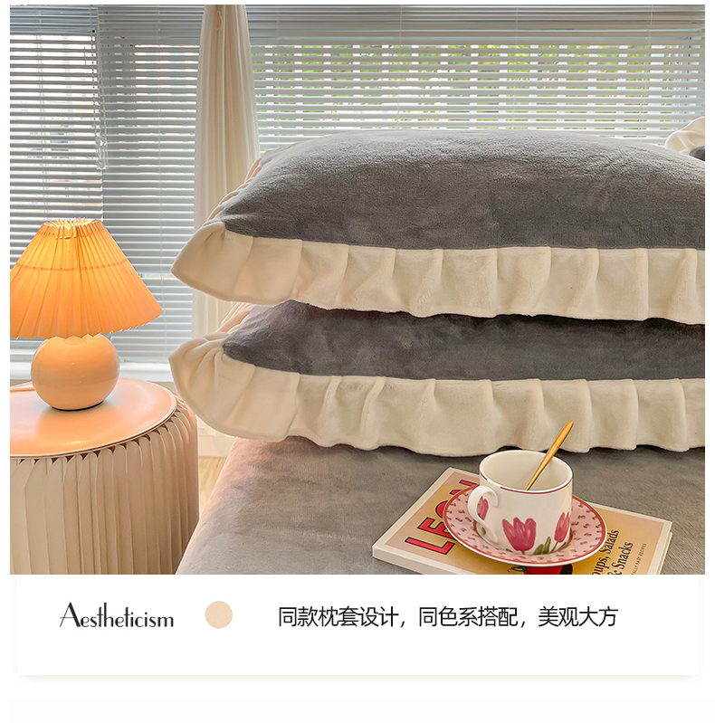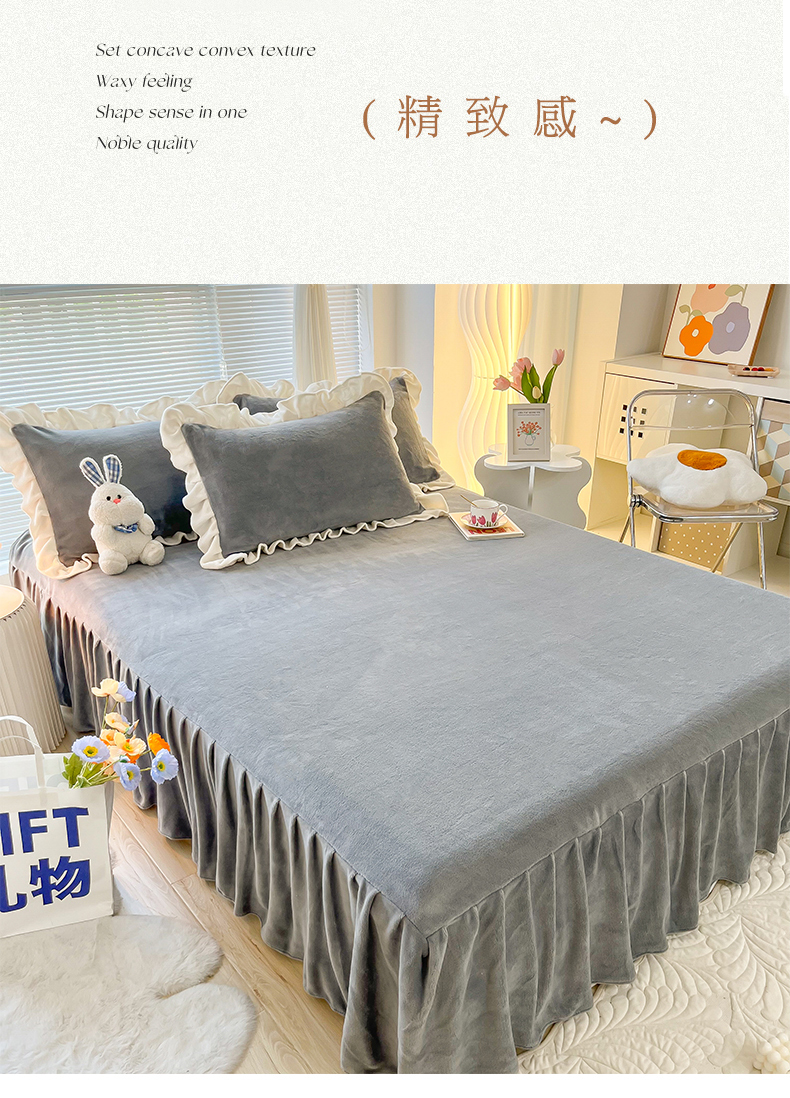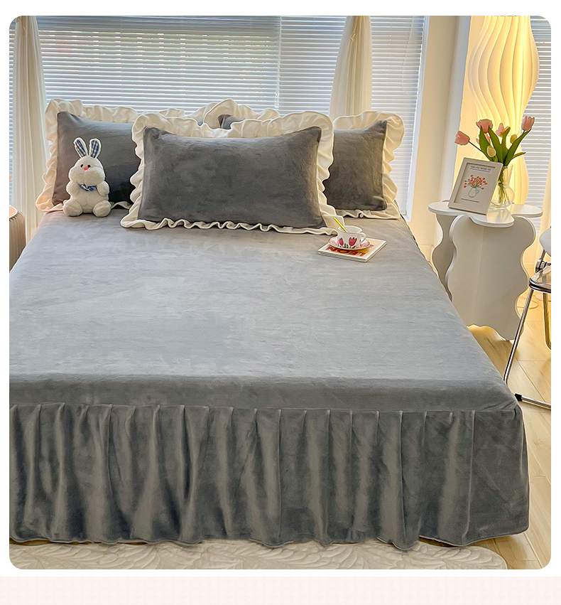 (总)十里居 2023新款纯色韩版花边牛奶绒单床裙三件套