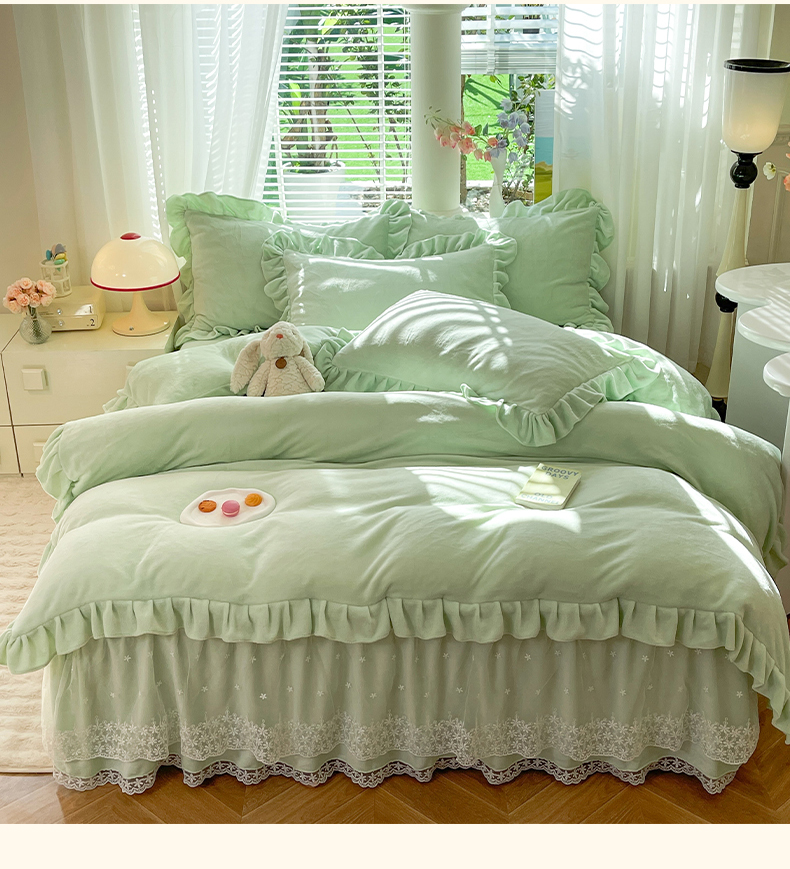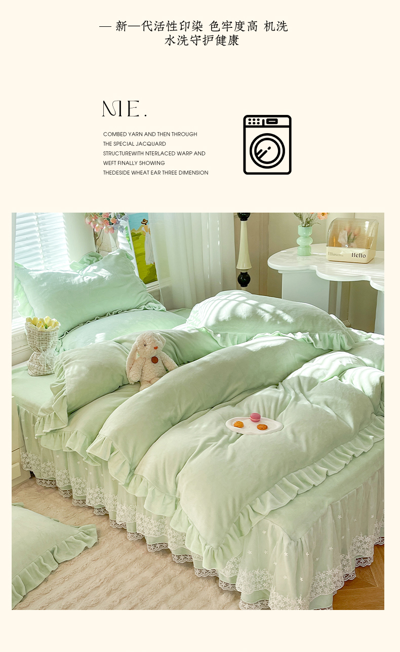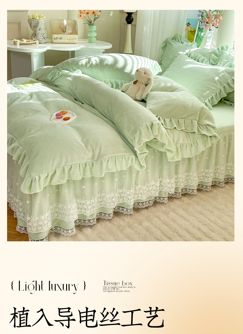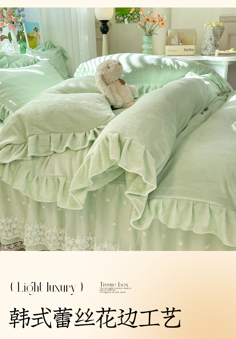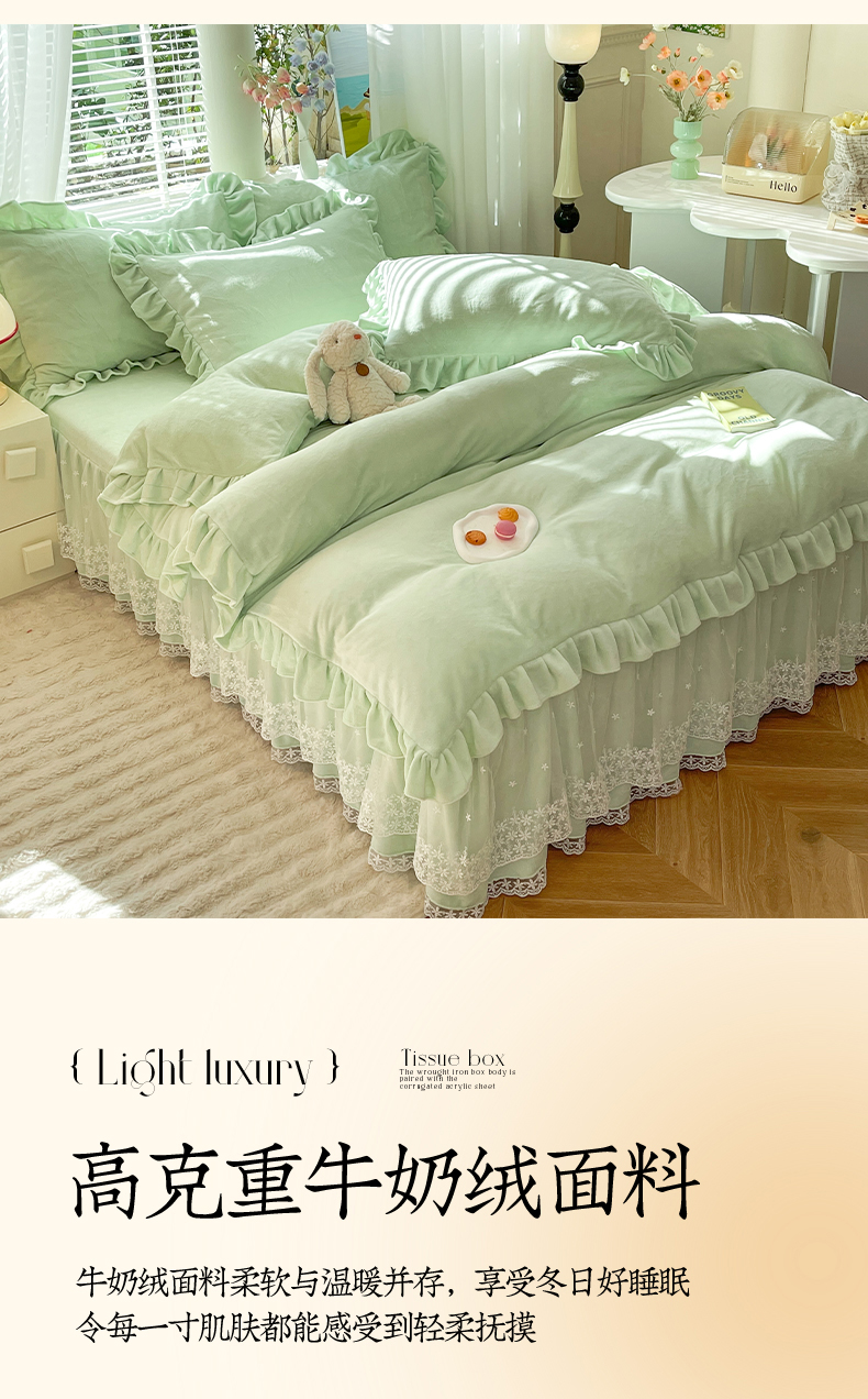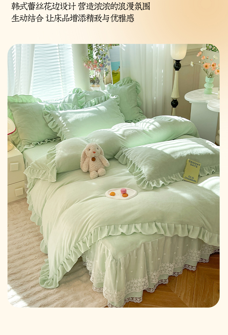 2023秋冬加厚牛奶绒蕾丝花边床裙四件套直播爆款-遇见 遇见-薄荷绿