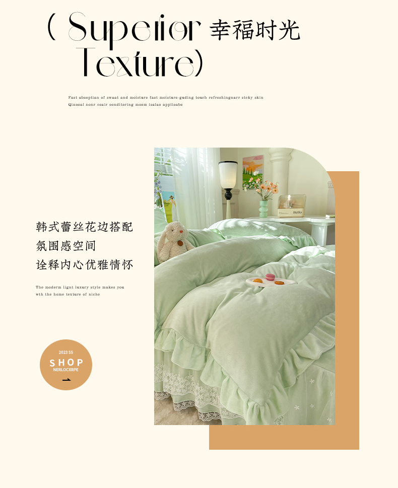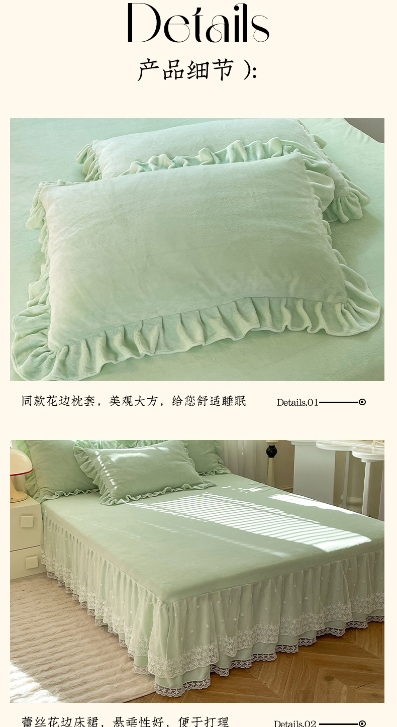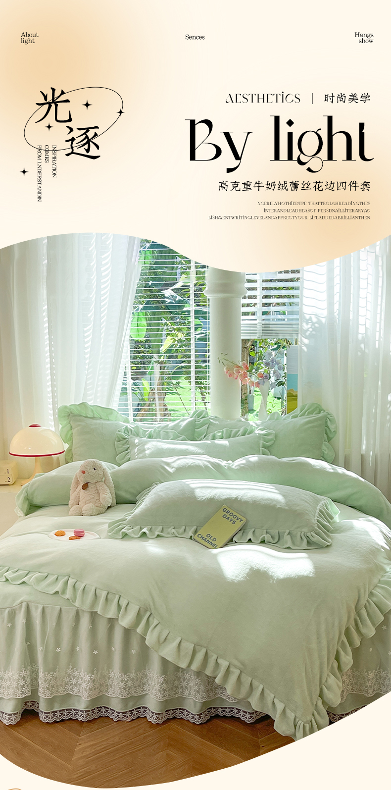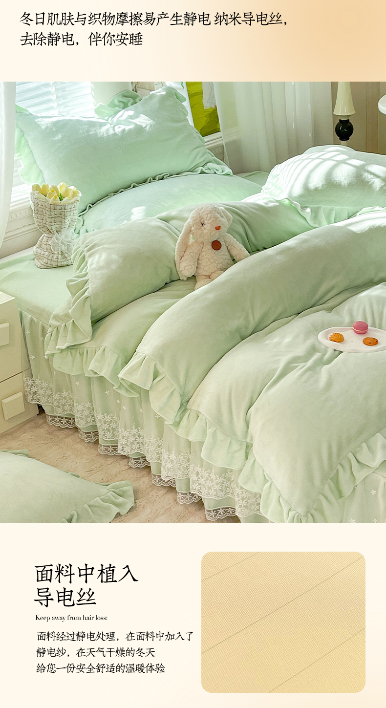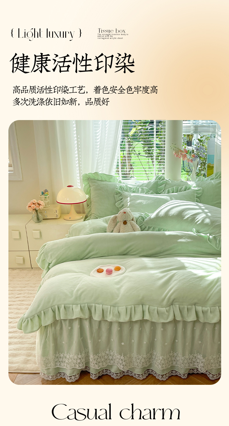 2023秋冬加厚牛奶绒蕾丝花边床裙四件套直播爆款-遇见 遇见-薄荷绿