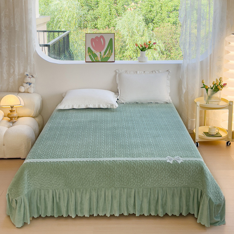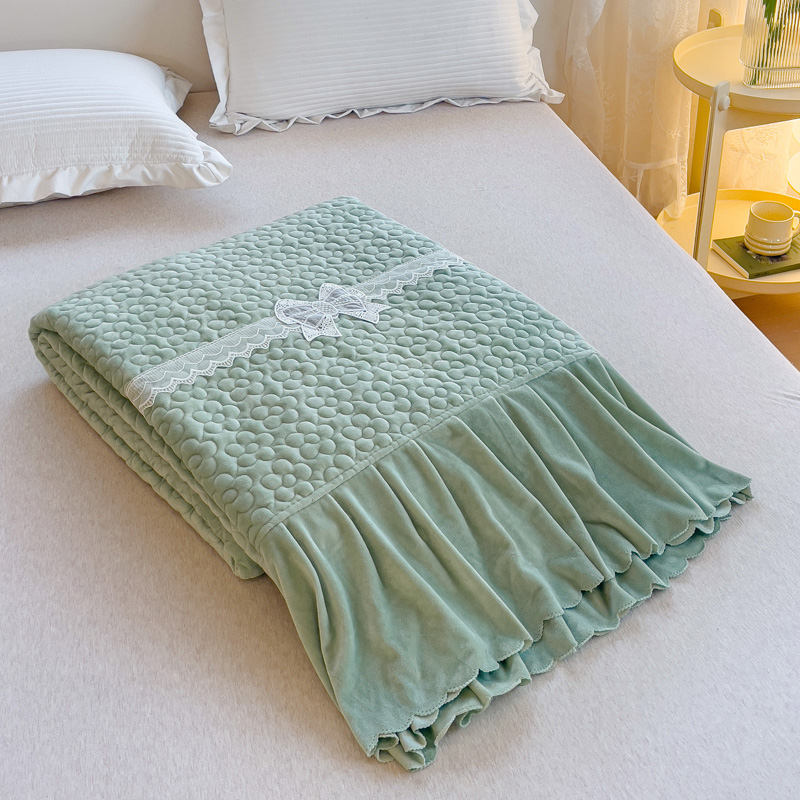 2023直播爆款纯色牛奶绒床盖床裙款蕾丝边素色婴儿绒床盖 蝴蝶结-晴绿
