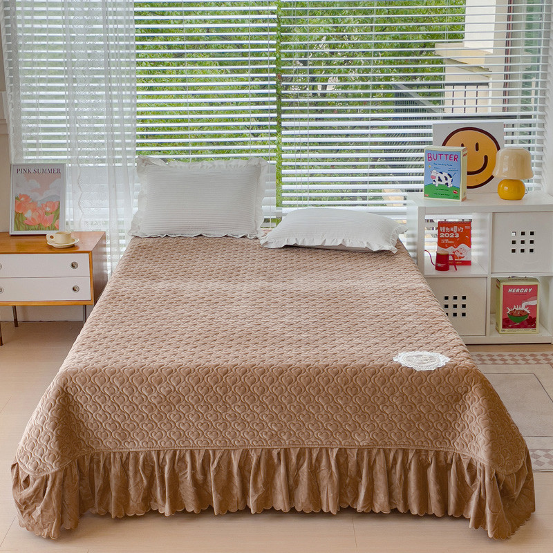 雅眠居 2023秋冬新款纯色牛奶绒床盖床裙款蕾丝边素色婴儿绒床盖 爱心-驼
