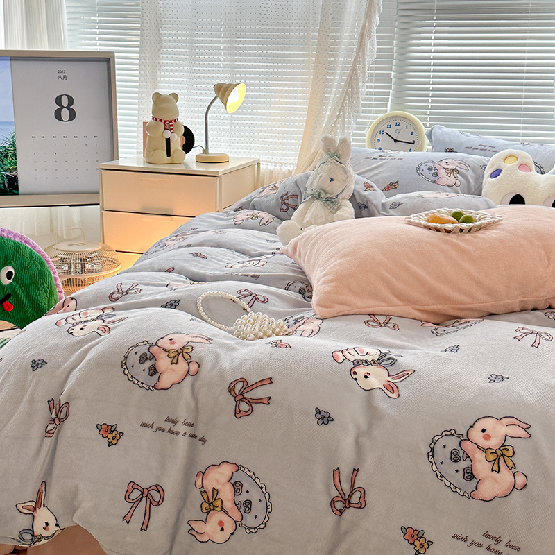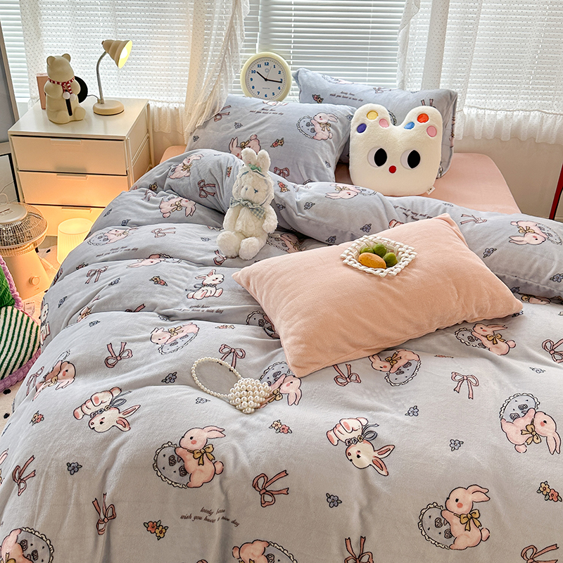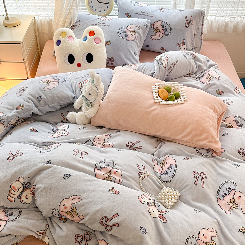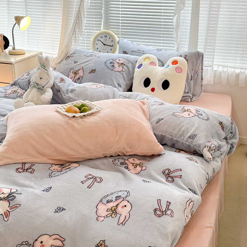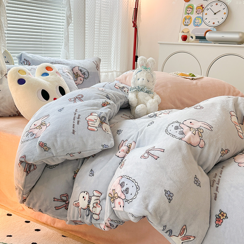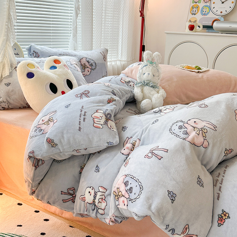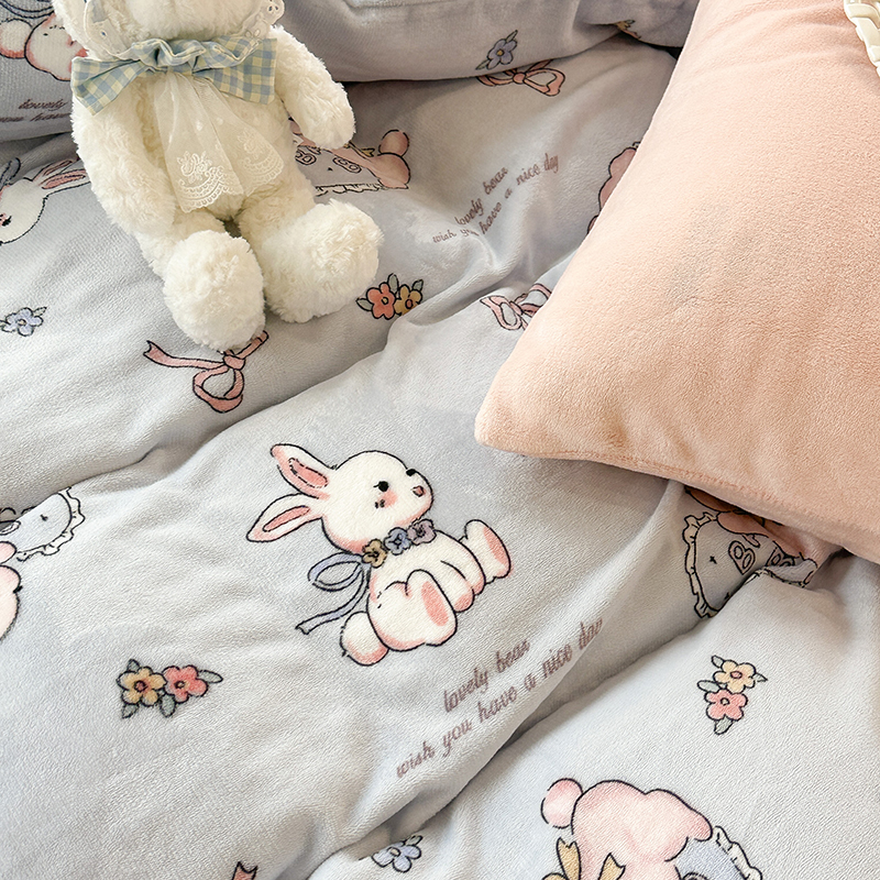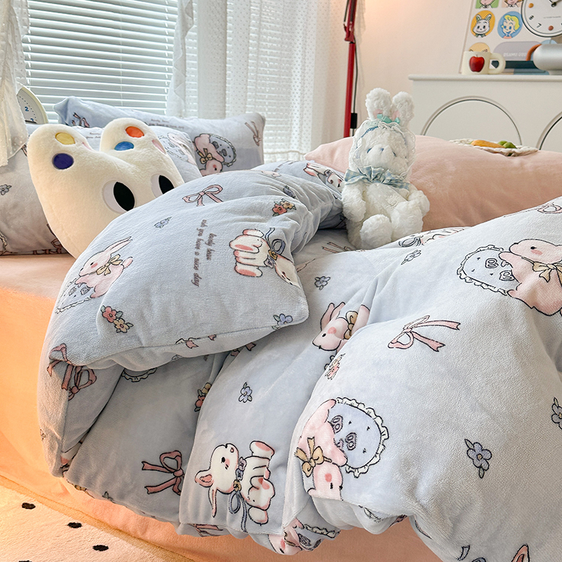 昔可家纺 2023新款高克重印花牛奶绒卡通系列四件套 蓝底抱枕小兔