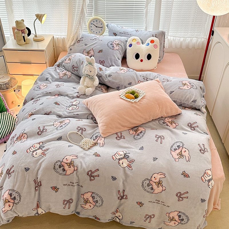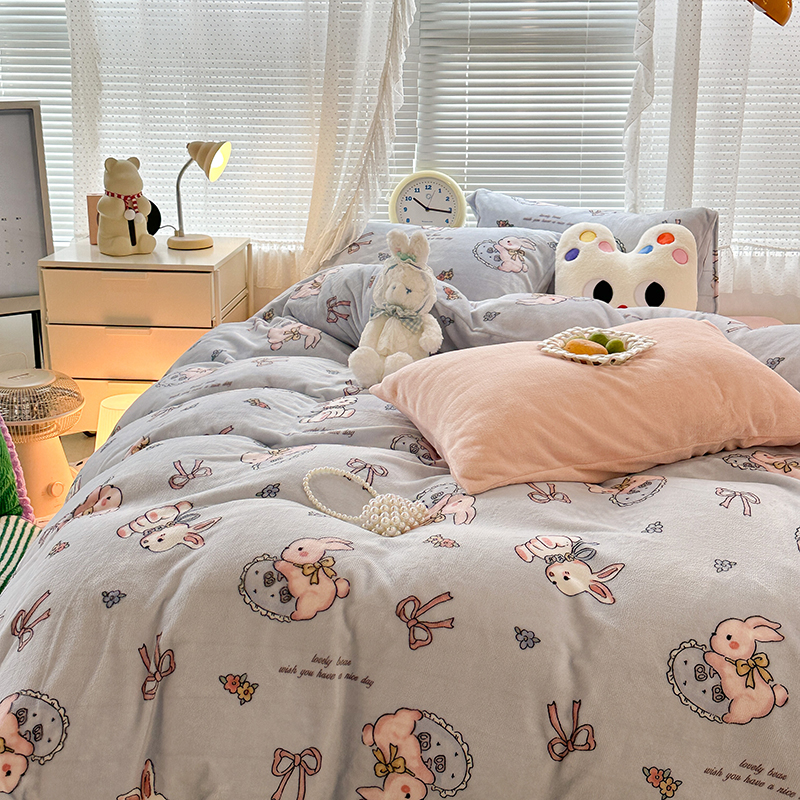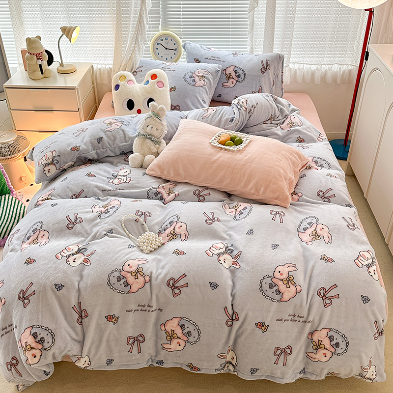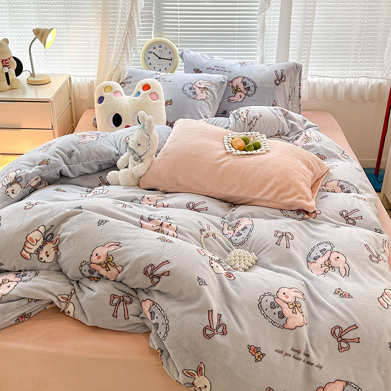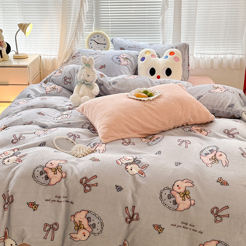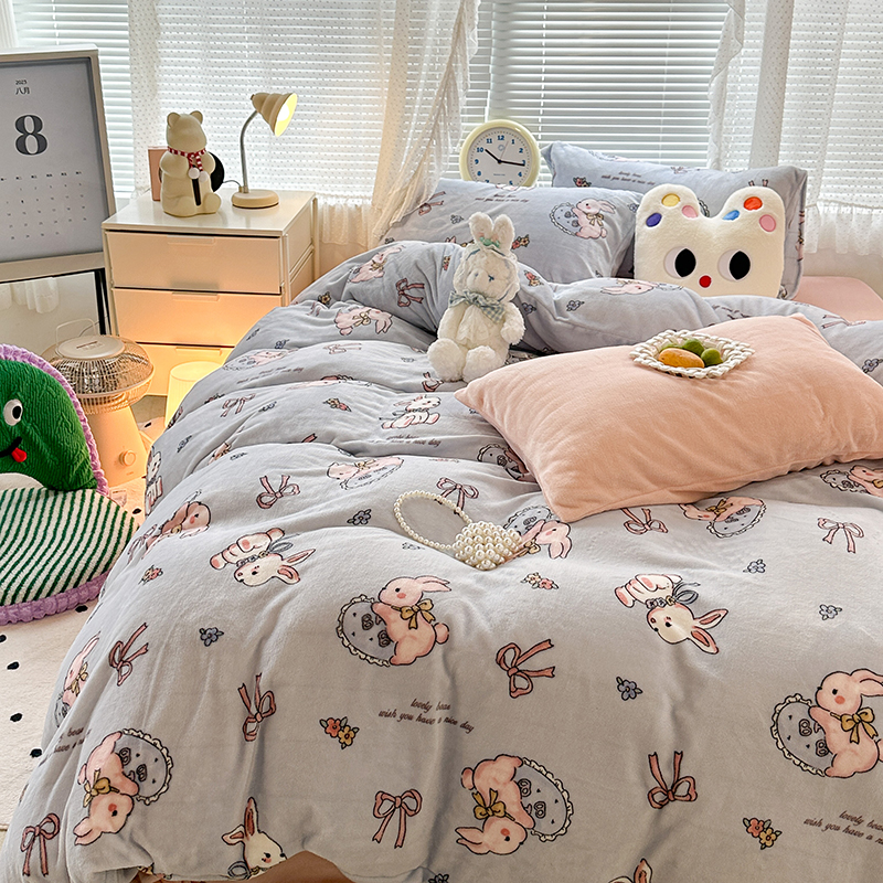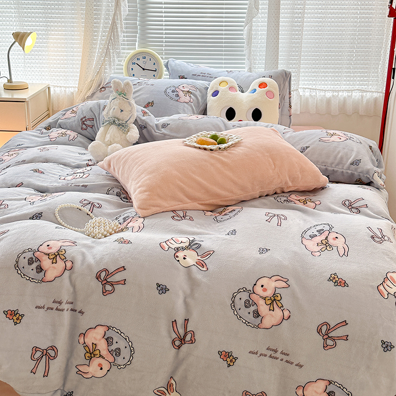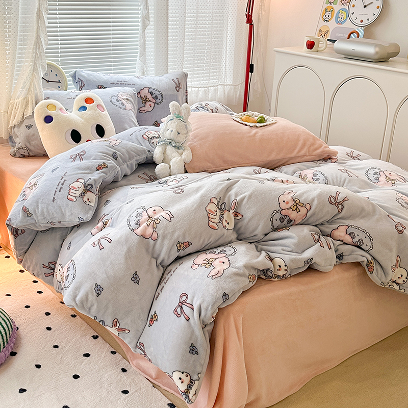 昔可家纺 2023新款高克重印花牛奶绒卡通系列四件套 蓝底抱枕小兔