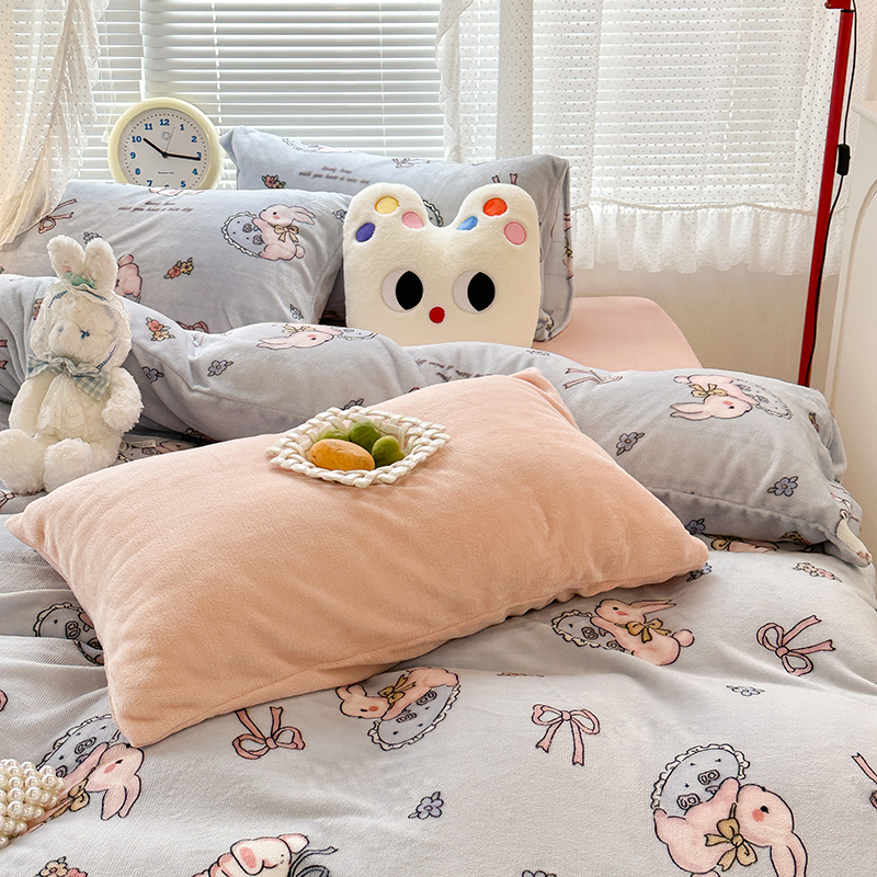商品名称:昔可家纺 2023新款高克重印花牛奶绒卡通系列四件套 蓝底抱枕小兔