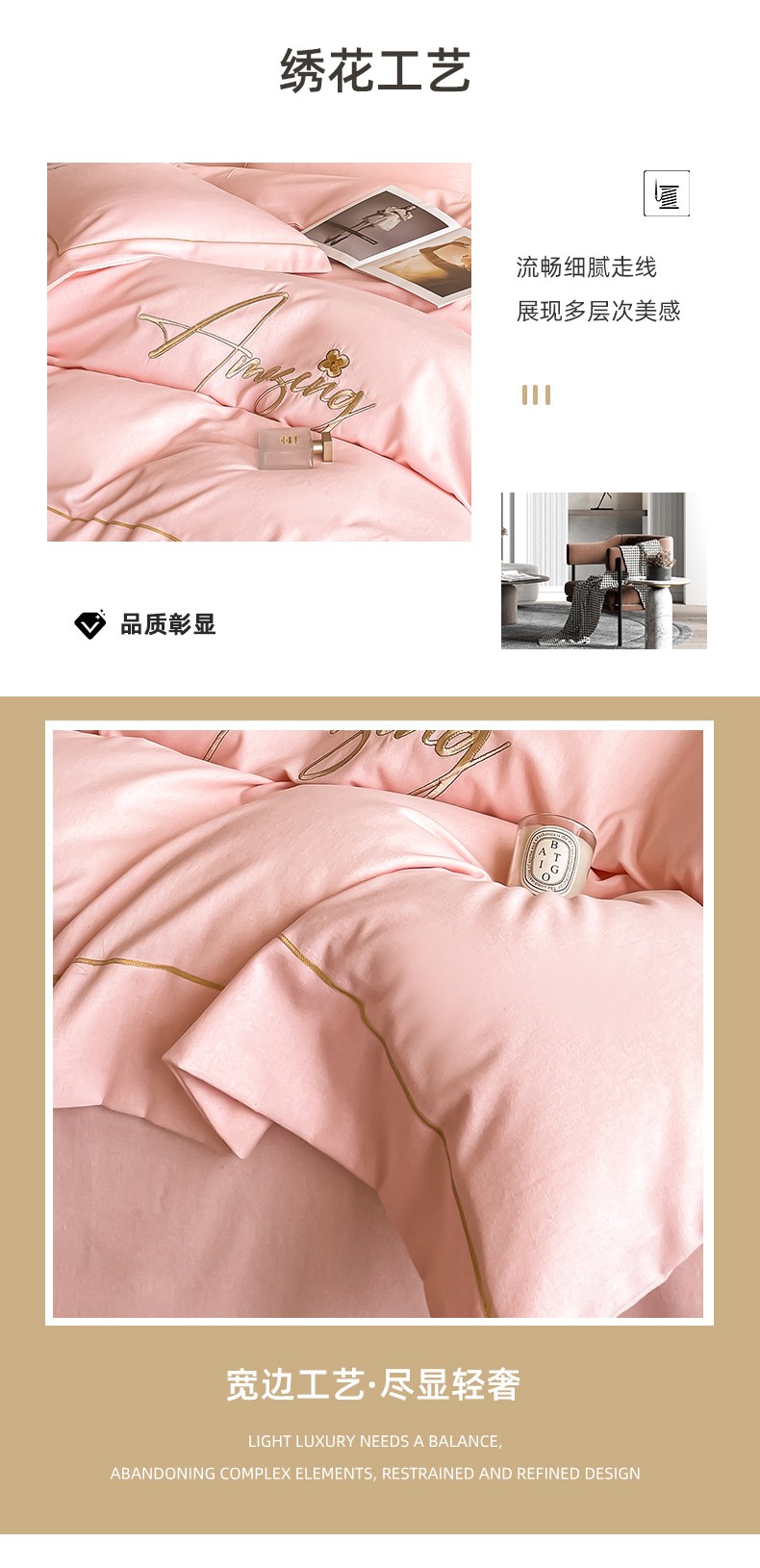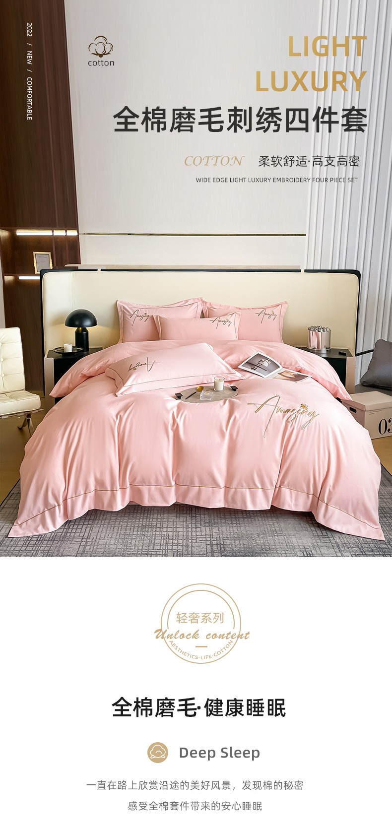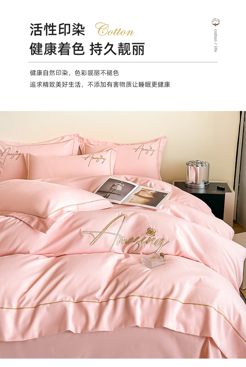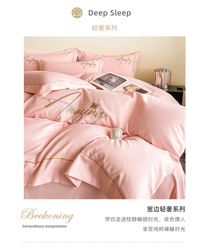 梧桐家居 2023新款全棉磨毛刺绣四件套 浅粉