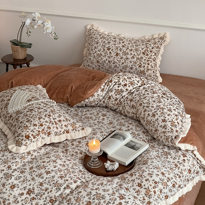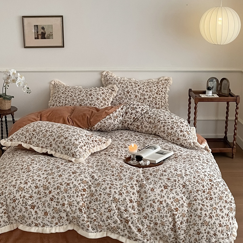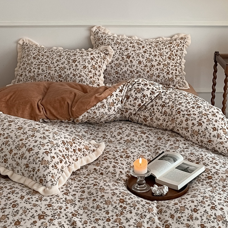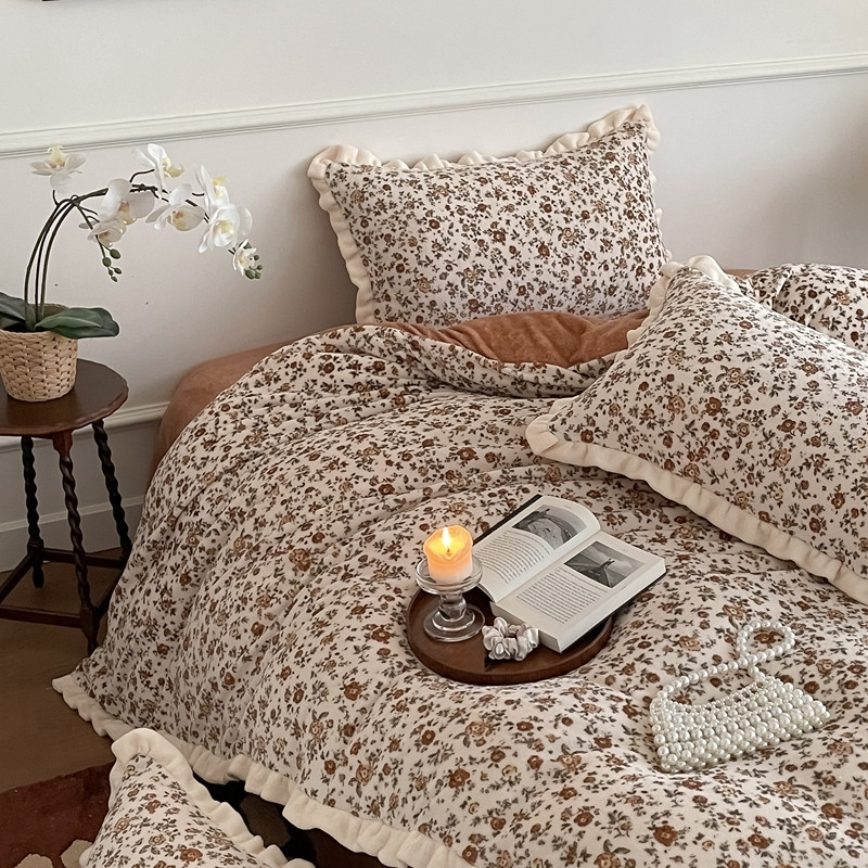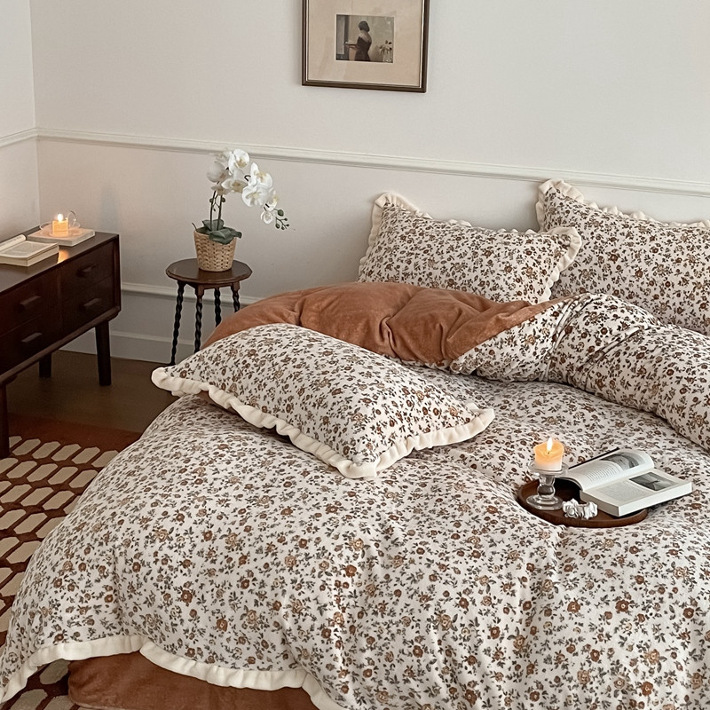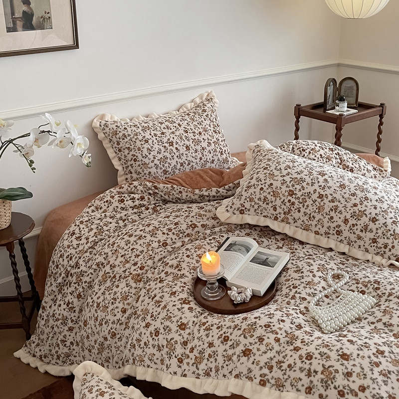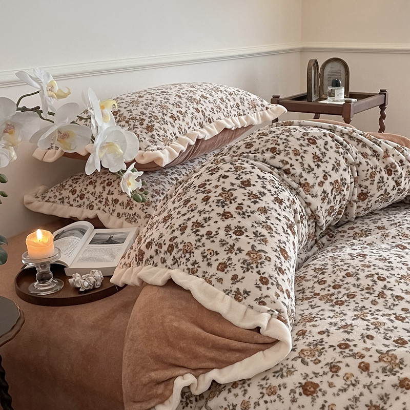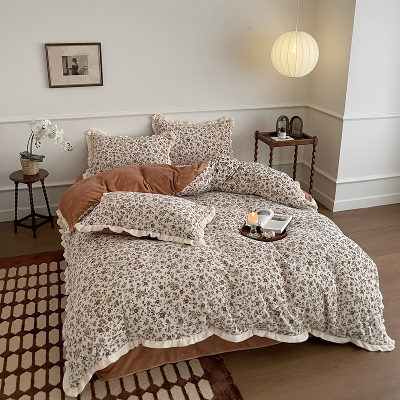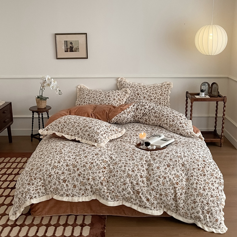潘朵拉 2023新款美拉德风牛奶绒花边款四件套 欢颜