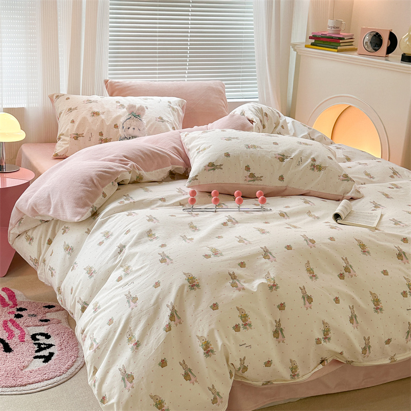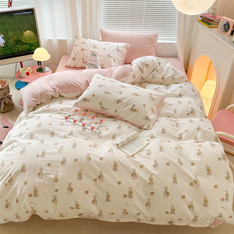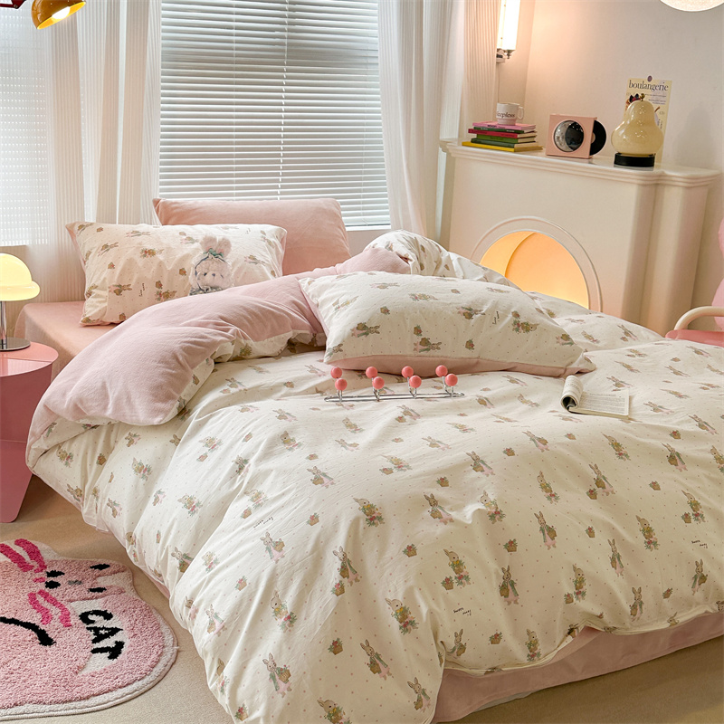 昔可家纺 2023新款全棉加绒四件套 甜心篮子兔