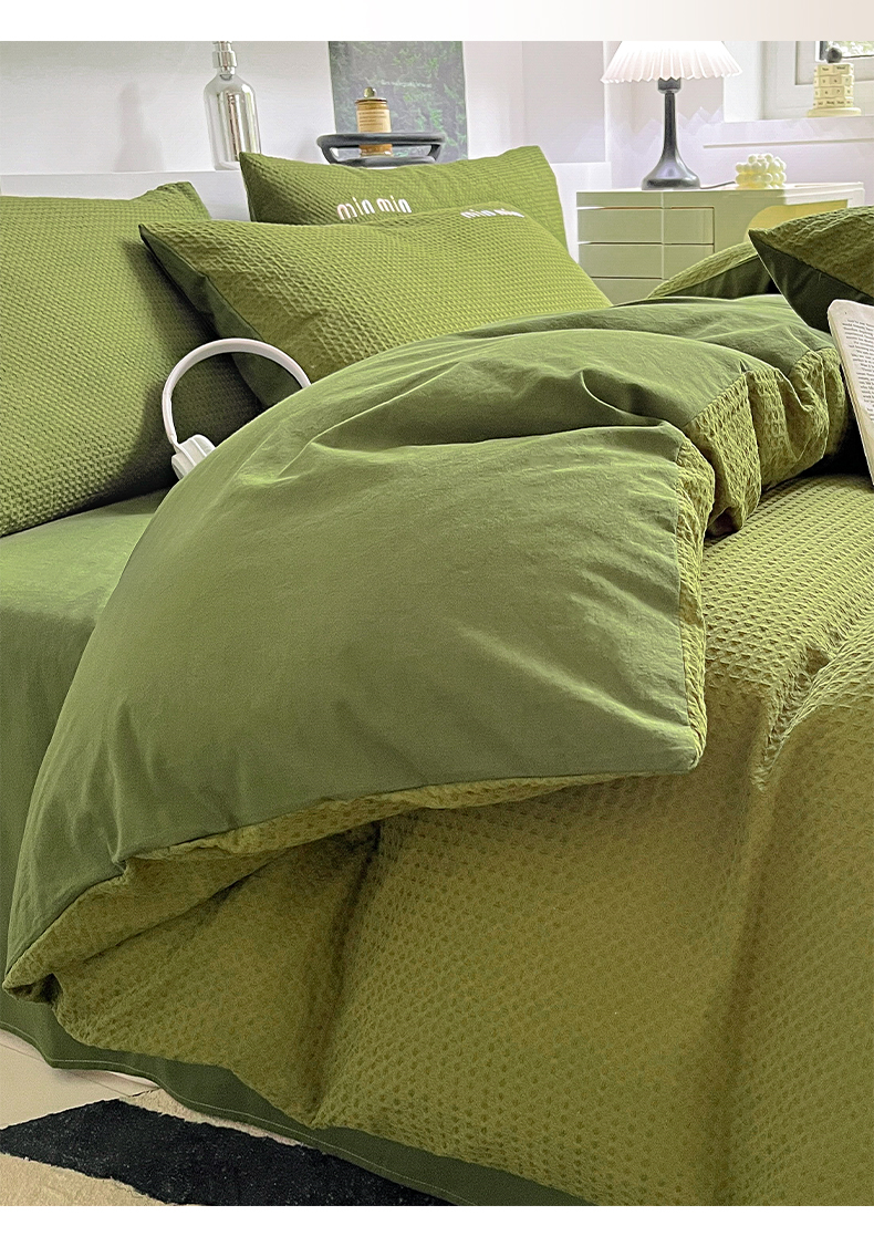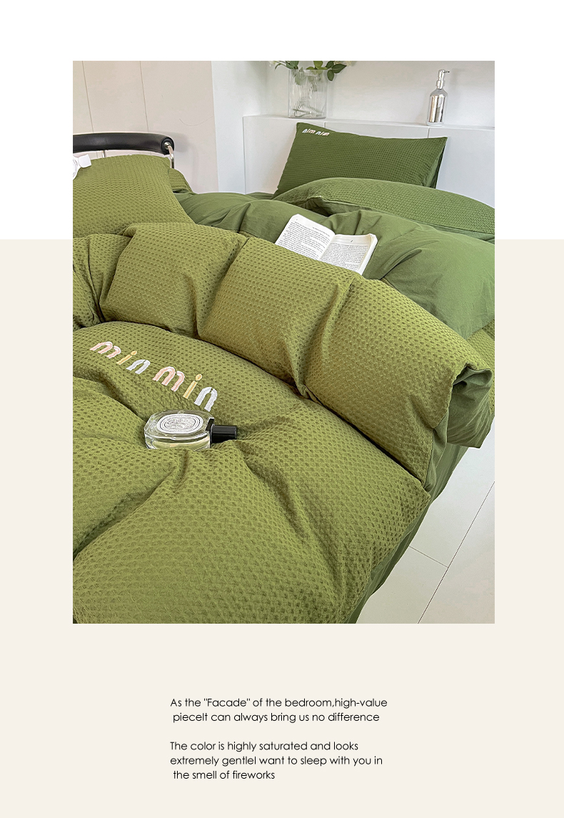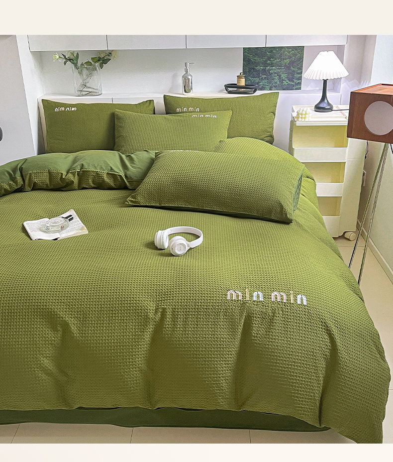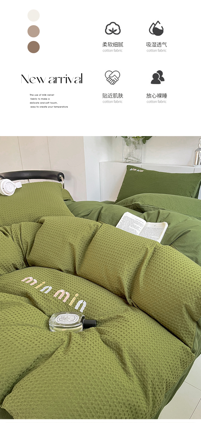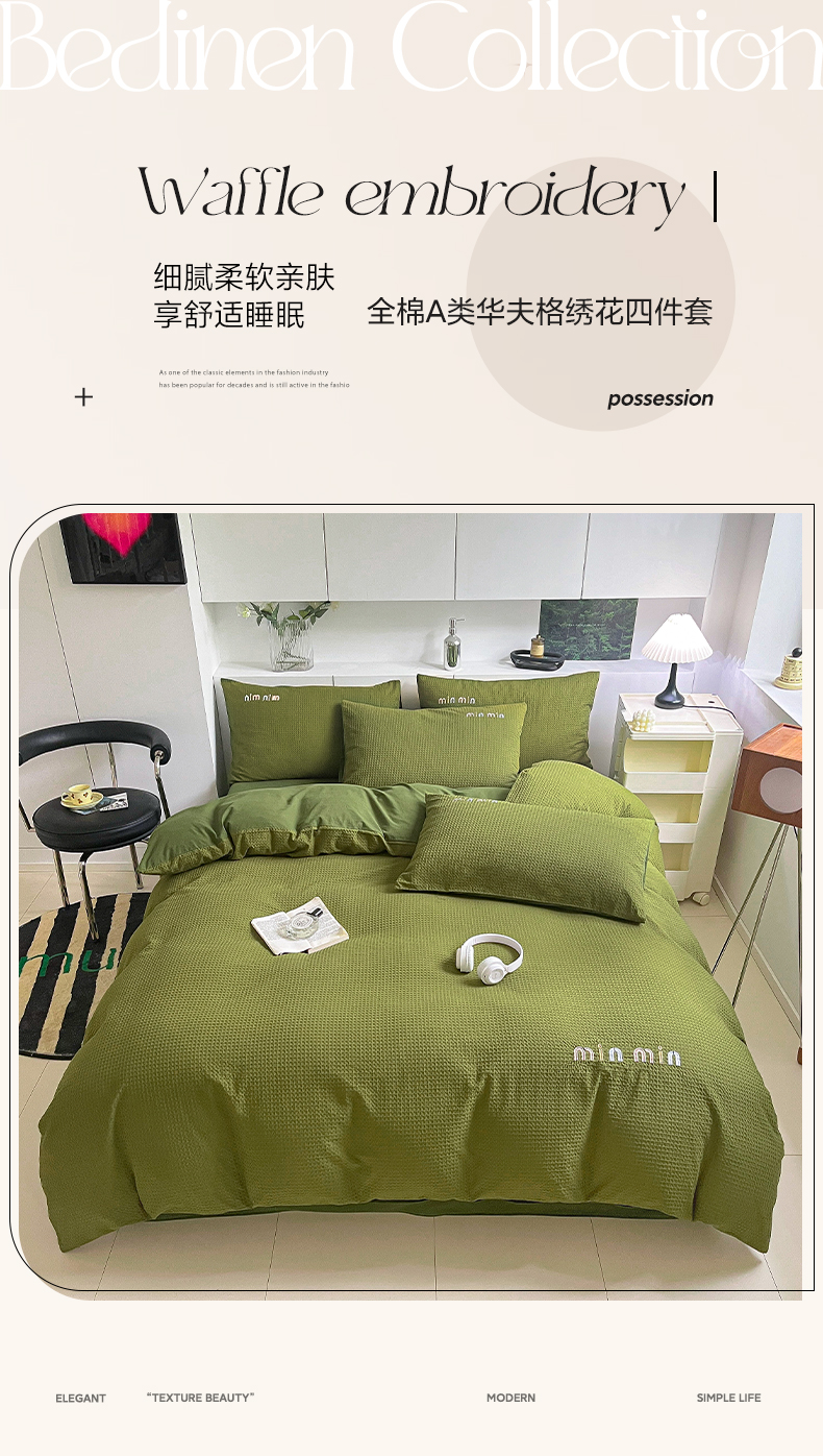 商品名称:雅居纺家纺 2024新款全棉华夫格绣花四件套 Min-深绿