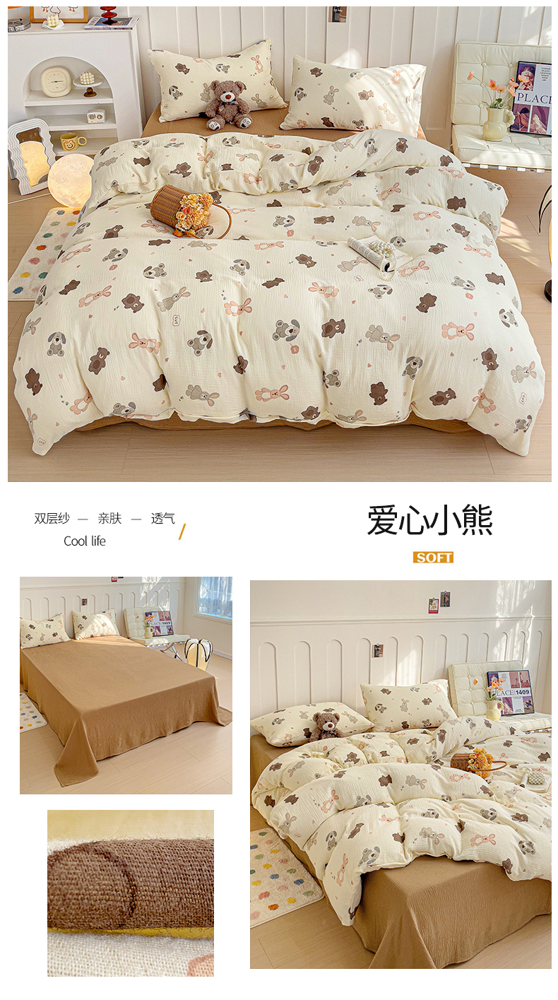 (总)珺柔家纺 2025新款全棉双层纱印花四件套,粉豹纹,焦糖小曲奇,礼物女孩,猫狗日记,奶油星空,线条苹果猫,小飞象,小狗的家,樱桃,樱桃西高地