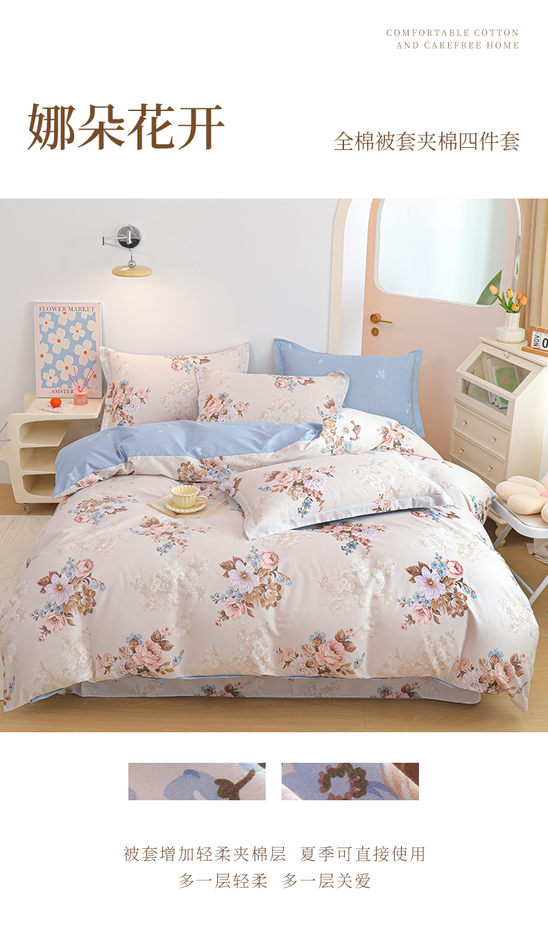当前位置: 91家纺网 > 商品网购 > 床品套件 > 四件套 > 元元 2024新款小清新全棉四件套系列 -被套夹棉四件套 娜朵花开