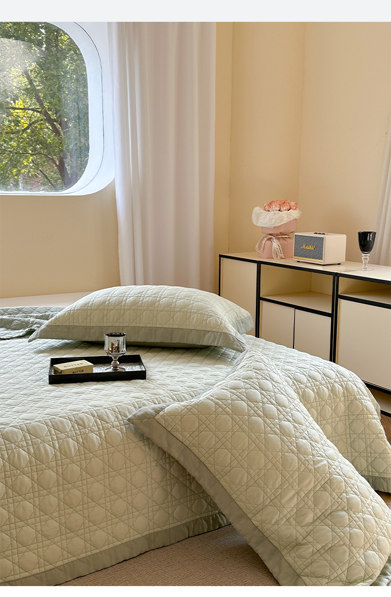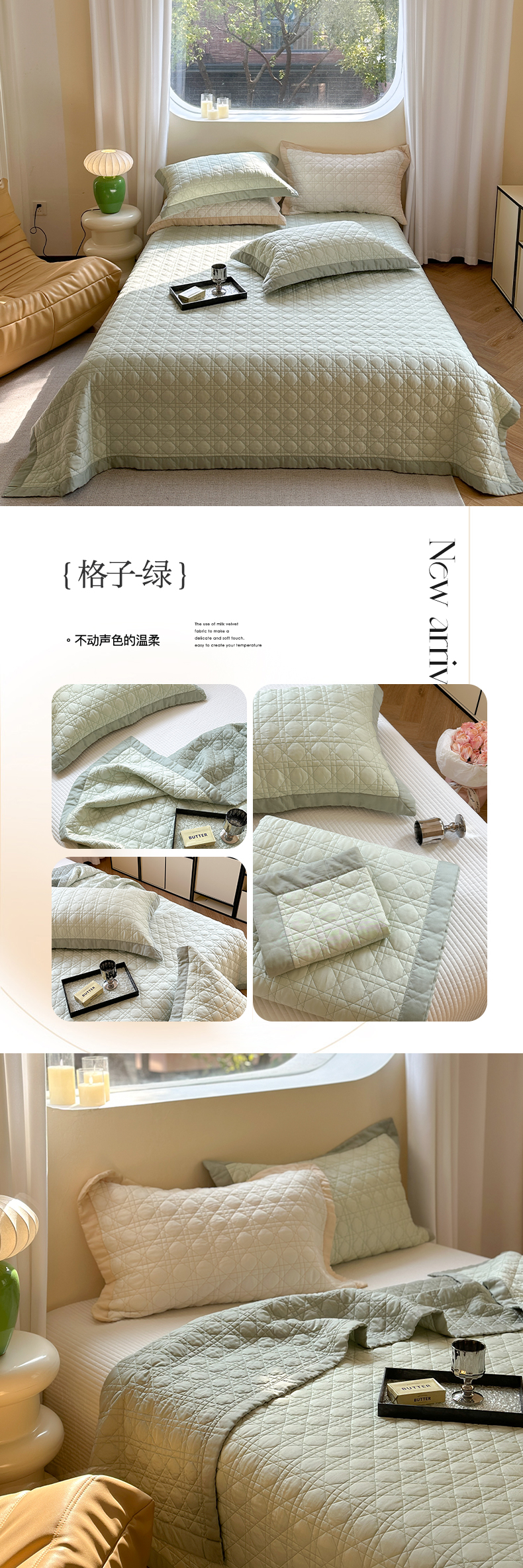2022新款40S纯棉水洗棉全棉荷叶边夹棉床盖三件套青草绿,青草绿