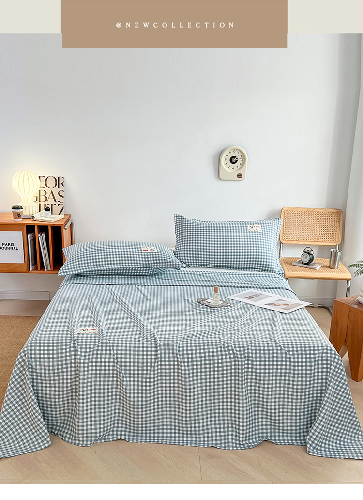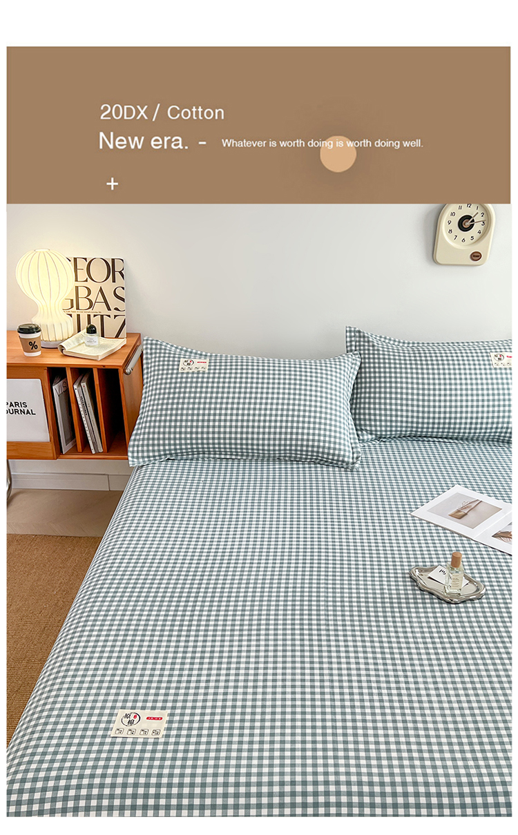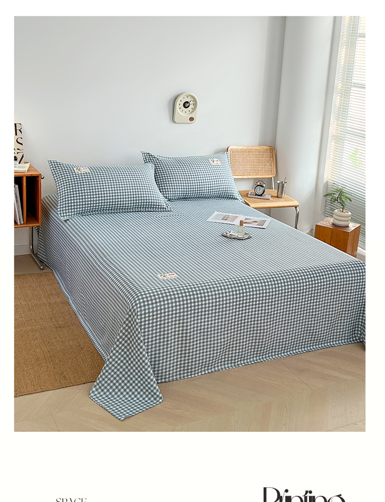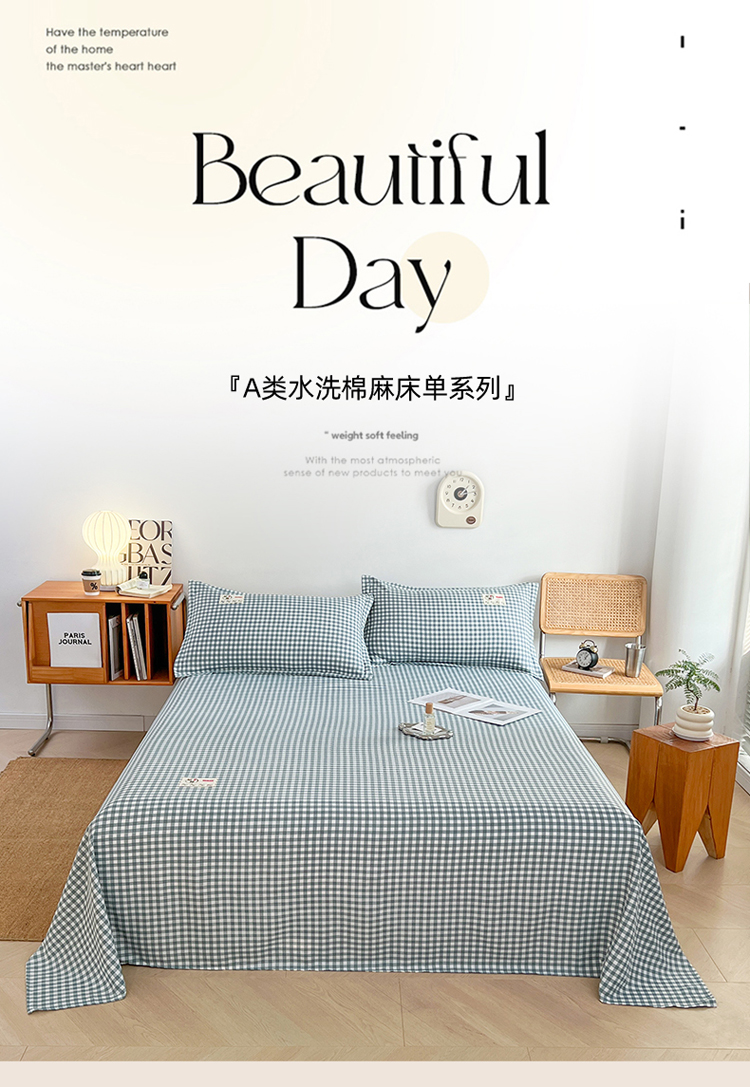 圣比熊 2025新款水洗棉麻单层床单席梦思床垫保护套床盖床裙加枕套 床单小格-蓝